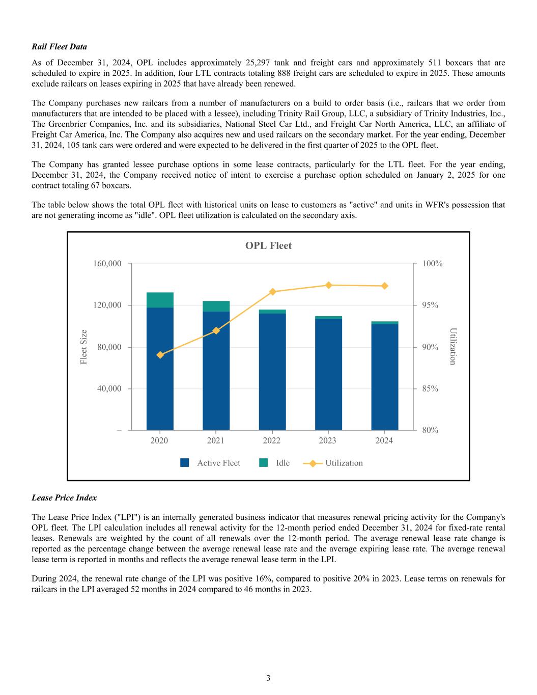 Rail Fleet Data As of December 31, 2024, OPL includes approximately 25,297 tank and freight cars and approximately 511 boxcars that are scheduled to expire in 2025. In addition, four LTL contracts totaling 888 freight cars are scheduled to expire in 2025. These amounts exclude railcars on leases expiring in 2025 that have already been renewed. The Company purchases new railcars from a number of manufacturers on a build to order basis (i.e., railcars that we order from manufacturers that are intended to be placed with a lessee), including Trinity Rail Group, LLC, a subsidiary of Trinity Industries, Inc., The Greenbrier Companies, Inc. and its subsidiaries, National Steel Car Ltd., and Freight Car North America, LLC, an affiliate of Freight Car America, Inc. The Company also acquires new and used railcars on the secondary market. For the year ending, December 31, 2024, 105 tank cars were ordered and were expected to be delivered in the first quarter of 2025 to the OPL fleet. The Company has granted lessee purchase options in some lease contracts, particularly for the LTL fleet. For the year ending, December 31, 2024, the Company received notice of intent to exercise a purchase option scheduled on January 2, 2025 for one contract totaling 67 boxcars. The table below shows the total OPL fleet with historical units on lease to customers as "active" and units in WFR's possession that are not generating income as "idle". OPL fleet utilization is calculated on the secondary axis. Fl ee t S iz e U tilization OPL Fleet Active Fleet Idle Utilization 2020 2021 2022 2023 2024 – 40,000 80,000 120,000 160,000 80% 85% 90% 95% 100% Lease Price Index The Lease Price Index ("LPI") is an internally generated business indicator that measures renewal pricing activity for the Company's OPL fleet. The LPI calculation includes all renewal activity for the 12-month period ended December 31, 2024 for fixed-rate rental leases. Renewals are weighted by the count of all renewals over the 12-month period. The average renewal lease rate change is reported as the percentage change between the average renewal lease rate and the average expiring lease rate. The average renewal lease term is reported in months and reflects the average renewal lease term in the LPI. During 2024, the renewal rate change of the LPI was positive 16%, compared to positive 20% in 2023. Lease terms on renewals for railcars in the LPI averaged 52 months in 2024 compared to 46 months in 2023. 3