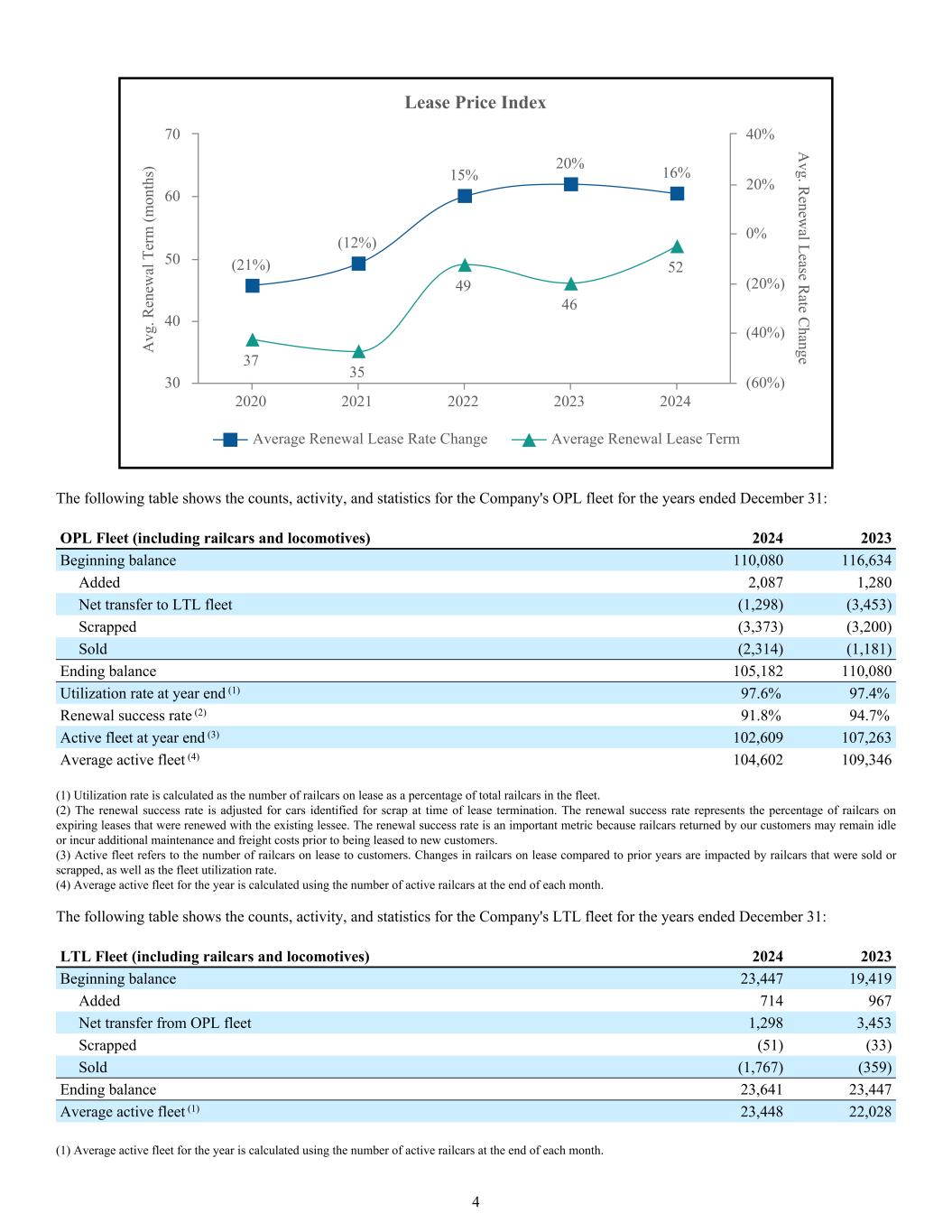 A vg . R en ew al T er m (m on th s) A vg. R enew al Lease R ate C hange Lease Price Index (21%) (12%) 15% 20% 16% 37 35 49 46 52 Average Renewal Lease Rate Change Average Renewal Lease Term 2020 2021 2022 2023 2024 30 40 50 60 70 (60%) (40%) (20%) 0% 20% 40% The following table shows the counts, activity, and statistics for the Company's OPL fleet for the years ended December 31: OPL Fleet (including railcars and locomotives) 2024 2023 Beginning balance 110,080 116,634 Added 2,087 1,280 Net transfer to LTL fleet (1,298) (3,453) Scrapped (3,373) (3,200) Sold (2,314) (1,181) Ending balance 105,182 110,080 Utilization rate at year end (1) 97.6% 97.4% Renewal success rate (2) 91.8% 94.7% Active fleet at year end (3) 102,609 107,263 Average active fleet (4) 104,602 109,346 (1) Utilization rate is calculated as the number of railcars on lease as a percentage of total railcars in the fleet. (2) The renewal success rate is adjusted for cars identified for scrap at time of lease termination. The renewal success rate represents the percentage of railcars on expiring leases that were renewed with the existing lessee. The renewal success rate is an important metric because railcars returned by our customers may remain idle or incur additional maintenance and freight costs prior to being leased to new customers. (3) Active fleet refers to the number of railcars on lease to customers. Changes in railcars on lease compared to prior years are impacted by railcars that were sold or scrapped, as well as the fleet utilization rate. (4) Average active fleet for the year is calculated using the number of active railcars at the end of each month. The following table shows the counts, activity, and statistics for the Company's LTL fleet for the years ended December 31: LTL Fleet (including railcars and locomotives) 2024 2023 Beginning balance 23,447 19,419 Added 714 967 Net transfer from OPL fleet 1,298 3,453 Scrapped (51) (33) Sold (1,767) (359) Ending balance 23,641 23,447 Average active fleet (1) 23,448 22,028 (1) Average active fleet for the year is calculated using the number of active railcars at the end of each month. 4