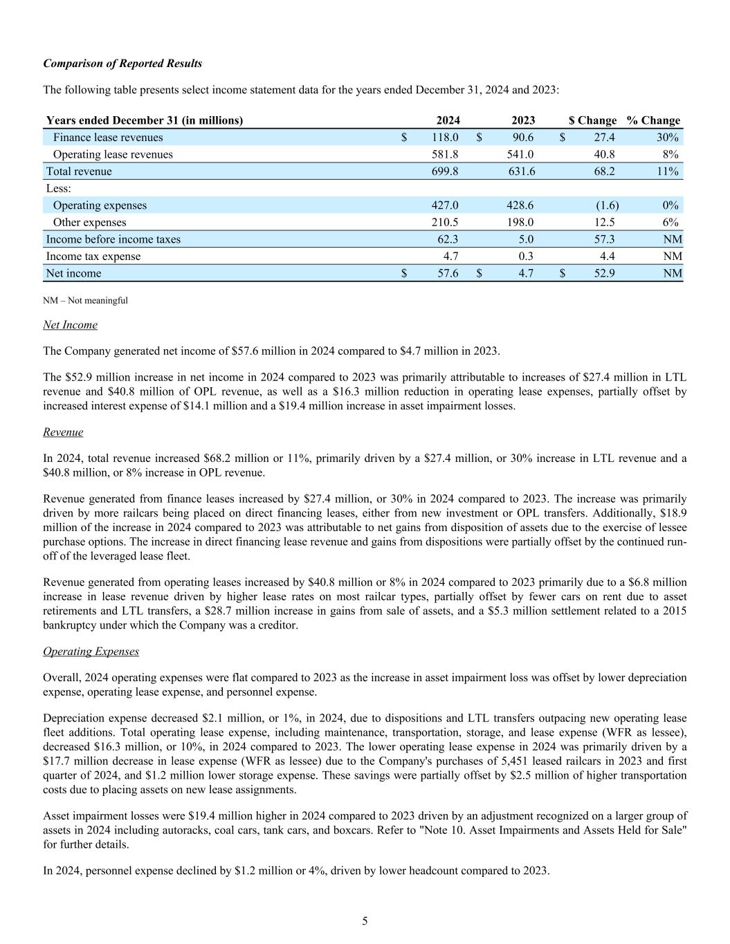 Comparison of Reported Results The following table presents select income statement data for the years ended December 31, 2024 and 2023: Years ended December 31 (in millions) 2024 2023 $ Change % Change Finance lease revenues $ 118.0 $ 90.6 $ 27.4 30% Operating lease revenues 581.8 541.0 40.8 8% Total revenue 699.8 631.6 68.2 11% Less: Operating expenses 427.0 428.6 (1.6) 0% Other expenses 210.5 198.0 12.5 6% Income before income taxes 62.3 5.0 57.3 NM Income tax expense 4.7 0.3 4.4 NM Net income $ 57.6 $ 4.7 $ 52.9 NM NM – Not meaningful Net Income The Company generated net income of $57.6 million in 2024 compared to $4.7 million in 2023. The $52.9 million increase in net income in 2024 compared to 2023 was primarily attributable to increases of $27.4 million in LTL revenue and $40.8 million of OPL revenue, as well as a $16.3 million reduction in operating lease expenses, partially offset by increased interest expense of $14.1 million and a $19.4 million increase in asset impairment losses. Revenue In 2024, total revenue increased $68.2 million or 11%, primarily driven by a $27.4 million, or 30% increase in LTL revenue and a $40.8 million, or 8% increase in OPL revenue. Revenue generated from finance leases increased by $27.4 million, or 30% in 2024 compared to 2023. The increase was primarily driven by more railcars being placed on direct financing leases, either from new investment or OPL transfers. Additionally, $18.9 million of the increase in 2024 compared to 2023 was attributable to net gains from disposition of assets due to the exercise of lessee purchase options. The increase in direct financing lease revenue and gains from dispositions were partially offset by the continued run- off of the leveraged lease fleet. Revenue generated from operating leases increased by $40.8 million or 8% in 2024 compared to 2023 primarily due to a $6.8 million increase in lease revenue driven by higher lease rates on most railcar types, partially offset by fewer cars on rent due to asset retirements and LTL transfers, a $28.7 million increase in gains from sale of assets, and a $5.3 million settlement related to a 2015 bankruptcy under which the Company was a creditor. Operating Expenses Overall, 2024 operating expenses were flat compared to 2023 as the increase in asset impairment loss was offset by lower depreciation expense, operating lease expense, and personnel expense. Depreciation expense decreased $2.1 million, or 1%, in 2024, due to dispositions and LTL transfers outpacing new operating lease fleet additions. Total operating lease expense, including maintenance, transportation, storage, and lease expense (WFR as lessee), decreased $16.3 million, or 10%, in 2024 compared to 2023. The lower operating lease expense in 2024 was primarily driven by a $17.7 million decrease in lease expense (WFR as lessee) due to the Company's purchases of 5,451 leased railcars in 2023 and first quarter of 2024, and $1.2 million lower storage expense. These savings were partially offset by $2.5 million of higher transportation costs due to placing assets on new lease assignments. Asset impairment losses were $19.4 million higher in 2024 compared to 2023 driven by an adjustment recognized on a larger group of assets in 2024 including autoracks, coal cars, tank cars, and boxcars. Refer to "Note 10. Asset Impairments and Assets Held for Sale" for further details. In 2024, personnel expense declined by $1.2 million or 4%, driven by lower headcount compared to 2023. 5