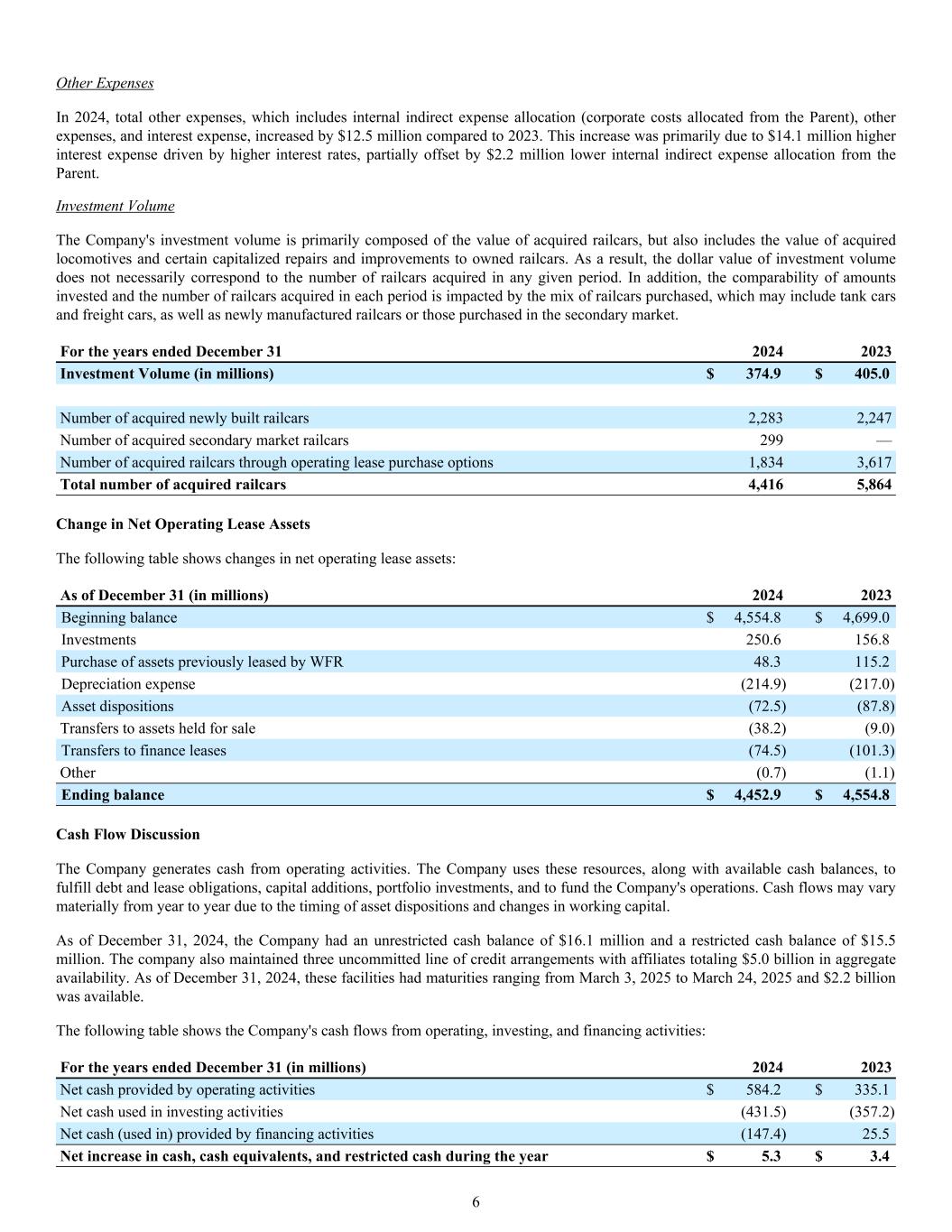 Other Expenses In 2024, total other expenses, which includes internal indirect expense allocation (corporate costs allocated from the Parent), other expenses, and interest expense, increased by $12.5 million compared to 2023. This increase was primarily due to $14.1 million higher interest expense driven by higher interest rates, partially offset by $2.2 million lower internal indirect expense allocation from the Parent. Investment Volume The Company's investment volume is primarily composed of the value of acquired railcars, but also includes the value of acquired locomotives and certain capitalized repairs and improvements to owned railcars. As a result, the dollar value of investment volume does not necessarily correspond to the number of railcars acquired in any given period. In addition, the comparability of amounts invested and the number of railcars acquired in each period is impacted by the mix of railcars purchased, which may include tank cars and freight cars, as well as newly manufactured railcars or those purchased in the secondary market. For the years ended December 31 2024 2023 Investment Volume (in millions) $ 374.9 $ 405.0 Number of acquired newly built railcars 2,283 2,247 Number of acquired secondary market railcars 299 — Number of acquired railcars through operating lease purchase options 1,834 3,617 Total number of acquired railcars 4,416 5,864 Change in Net Operating Lease Assets The following table shows changes in net operating lease assets: As of December 31 (in millions) 2024 2023 Beginning balance $ 4,554.8 $ 4,699.0 Investments 250.6 156.8 Purchase of assets previously leased by WFR 48.3 115.2 Depreciation expense (214.9) (217.0) Asset dispositions (72.5) (87.8) Transfers to assets held for sale (38.2) (9.0) Transfers to finance leases (74.5) (101.3) Other (0.7) (1.1) Ending balance $ 4,452.9 $ 4,554.8 Cash Flow Discussion The Company generates cash from operating activities. The Company uses these resources, along with available cash balances, to fulfill debt and lease obligations, capital additions, portfolio investments, and to fund the Company's operations. Cash flows may vary materially from year to year due to the timing of asset dispositions and changes in working capital. As of December 31, 2024, the Company had an unrestricted cash balance of $16.1 million and a restricted cash balance of $15.5 million. The company also maintained three uncommitted line of credit arrangements with affiliates totaling $5.0 billion in aggregate availability. As of December 31, 2024, these facilities had maturities ranging from March 3, 2025 to March 24, 2025 and $2.2 billion was available. The following table shows the Company's cash flows from operating, investing, and financing activities: For the years ended December 31 (in millions) 2024 2023 Net cash provided by operating activities $ 584.2 $ 335.1 Net cash used in investing activities (431.5) (357.2) Net cash (used in) provided by financing activities (147.4) 25.5 Net increase in cash, cash equivalents, and restricted cash during the year $ 5.3 $ 3.4 6