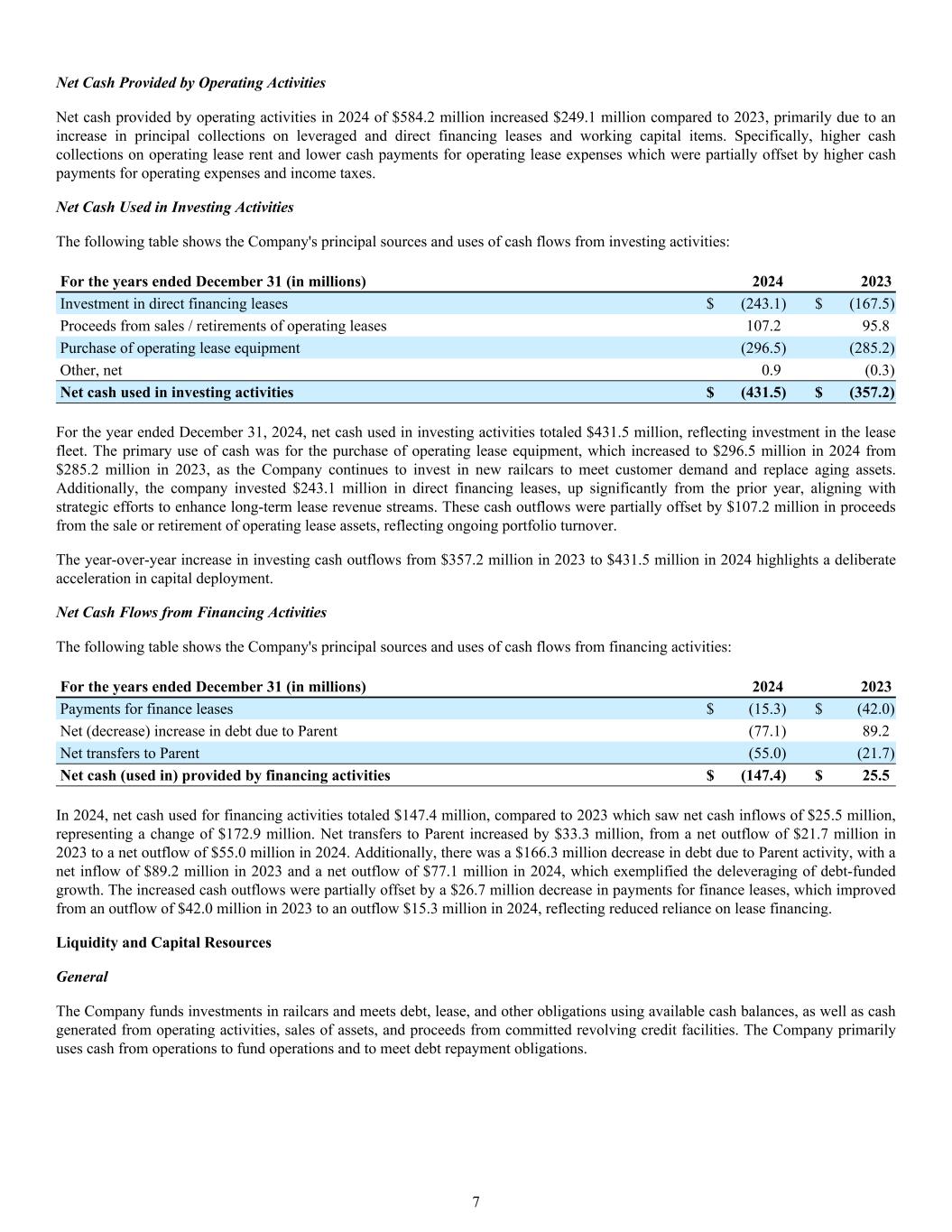 Net Cash Provided by Operating Activities Net cash provided by operating activities in 2024 of $584.2 million increased $249.1 million compared to 2023, primarily due to an increase in principal collections on leveraged and direct financing leases and working capital items. Specifically, higher cash collections on operating lease rent and lower cash payments for operating lease expenses which were partially offset by higher cash payments for operating expenses and income taxes. Net Cash Used in Investing Activities The following table shows the Company's principal sources and uses of cash flows from investing activities: For the years ended December 31 (in millions) 2024 2023 Investment in direct financing leases $ (243.1) $ (167.5) Proceeds from sales / retirements of operating leases 107.2 95.8 Purchase of operating lease equipment (296.5) (285.2) Other, net 0.9 (0.3) Net cash used in investing activities $ (431.5) $ (357.2) For the year ended December 31, 2024, net cash used in investing activities totaled $431.5 million, reflecting investment in the lease fleet. The primary use of cash was for the purchase of operating lease equipment, which increased to $296.5 million in 2024 from $285.2 million in 2023, as the Company continues to invest in new railcars to meet customer demand and replace aging assets. Additionally, the company invested $243.1 million in direct financing leases, up significantly from the prior year, aligning with strategic efforts to enhance long-term lease revenue streams. These cash outflows were partially offset by $107.2 million in proceeds from the sale or retirement of operating lease assets, reflecting ongoing portfolio turnover. The year-over-year increase in investing cash outflows from $357.2 million in 2023 to $431.5 million in 2024 highlights a deliberate acceleration in capital deployment. Net Cash Flows from Financing Activities The following table shows the Company's principal sources and uses of cash flows from financing activities: For the years ended December 31 (in millions) 2024 2023 Payments for finance leases $ (15.3) $ (42.0) Net (decrease) increase in debt due to Parent (77.1) 89.2 Net transfers to Parent (55.0) (21.7) Net cash (used in) provided by financing activities $ (147.4) $ 25.5 In 2024, net cash used for financing activities totaled $147.4 million, compared to 2023 which saw net cash inflows of $25.5 million, representing a change of $172.9 million. Net transfers to Parent increased by $33.3 million, from a net outflow of $21.7 million in 2023 to a net outflow of $55.0 million in 2024. Additionally, there was a $166.3 million decrease in debt due to Parent activity, with a net inflow of $89.2 million in 2023 and a net outflow of $77.1 million in 2024, which exemplified the deleveraging of debt-funded growth. The increased cash outflows were partially offset by a $26.7 million decrease in payments for finance leases, which improved from an outflow of $42.0 million in 2023 to an outflow $15.3 million in 2024, reflecting reduced reliance on lease financing. Liquidity and Capital Resources General The Company funds investments in railcars and meets debt, lease, and other obligations using available cash balances, as well as cash generated from operating activities, sales of assets, and proceeds from committed revolving credit facilities. The Company primarily uses cash from operations to fund operations and to meet debt repayment obligations. 7