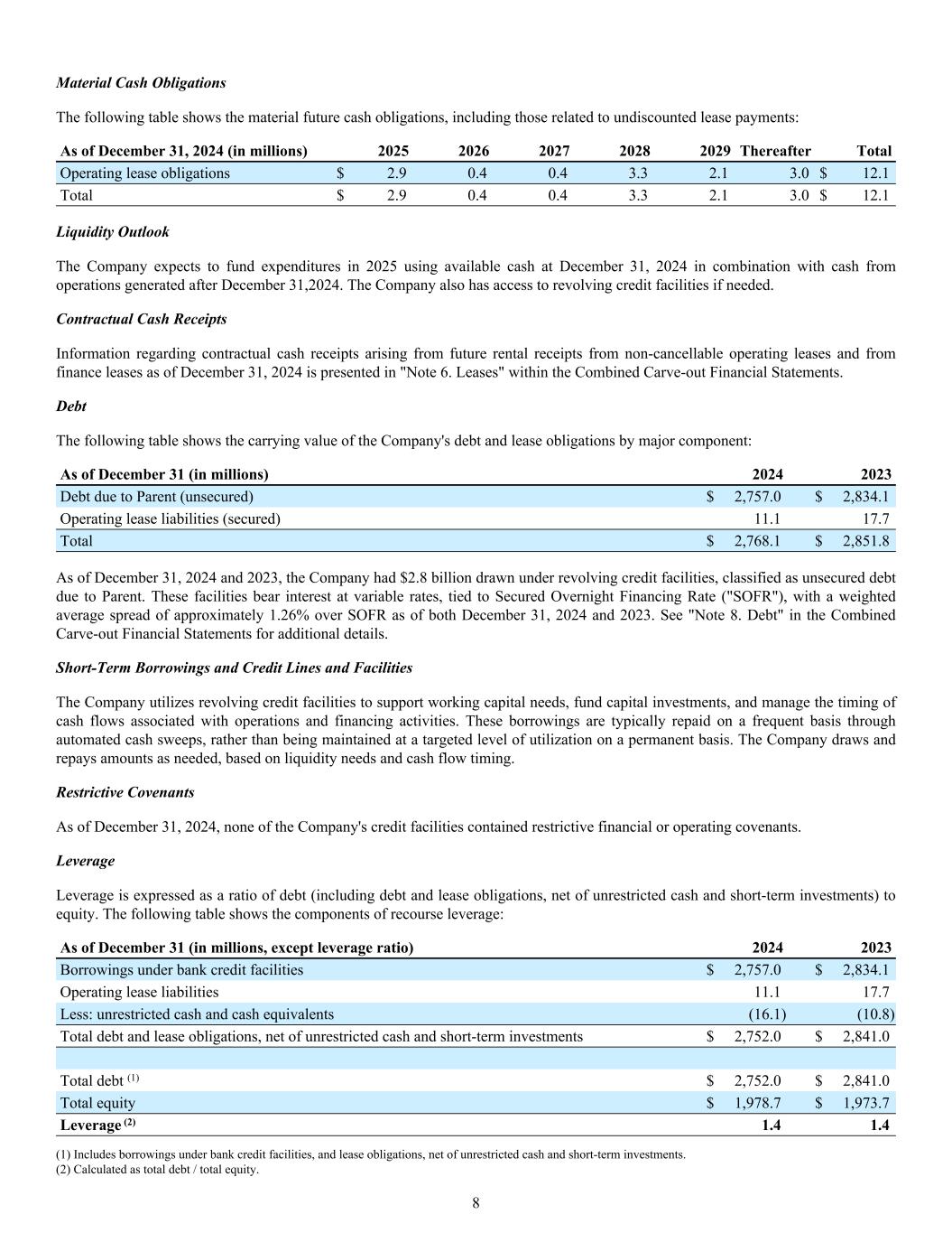 Material Cash Obligations The following table shows the material future cash obligations, including those related to undiscounted lease payments: As of December 31, 2024 (in millions) 2025 2026 2027 2028 2029 Thereafter Total Operating lease obligations $ 2.9 0.4 0.4 3.3 2.1 3.0 $ 12.1 Total $ 2.9 0.4 0.4 3.3 2.1 3.0 $ 12.1 Liquidity Outlook The Company expects to fund expenditures in 2025 using available cash at December 31, 2024 in combination with cash from operations generated after December 31,2024. The Company also has access to revolving credit facilities if needed. Contractual Cash Receipts Information regarding contractual cash receipts arising from future rental receipts from non-cancellable operating leases and from finance leases as of December 31, 2024 is presented in "Note 6. Leases" within the Combined Carve-out Financial Statements. Debt The following table shows the carrying value of the Company's debt and lease obligations by major component: As of December 31 (in millions) 2024 2023 Debt due to Parent (unsecured) $ 2,757.0 $ 2,834.1 Operating lease liabilities (secured) 11.1 17.7 Total $ 2,768.1 $ 2,851.8 As of December 31, 2024 and 2023, the Company had $2.8 billion drawn under revolving credit facilities, classified as unsecured debt due to Parent. These facilities bear interest at variable rates, tied to Secured Overnight Financing Rate ("SOFR"), with a weighted average spread of approximately 1.26% over SOFR as of both December 31, 2024 and 2023. See "Note 8. Debt" in the Combined Carve-out Financial Statements for additional details. Short-Term Borrowings and Credit Lines and Facilities The Company utilizes revolving credit facilities to support working capital needs, fund capital investments, and manage the timing of cash flows associated with operations and financing activities. These borrowings are typically repaid on a frequent basis through automated cash sweeps, rather than being maintained at a targeted level of utilization on a permanent basis. The Company draws and repays amounts as needed, based on liquidity needs and cash flow timing. Restrictive Covenants As of December 31, 2024, none of the Company's credit facilities contained restrictive financial or operating covenants. Leverage Leverage is expressed as a ratio of debt (including debt and lease obligations, net of unrestricted cash and short-term investments) to equity. The following table shows the components of recourse leverage: As of December 31 (in millions, except leverage ratio) 2024 2023 Borrowings under bank credit facilities $ 2,757.0 $ 2,834.1 Operating lease liabilities 11.1 17.7 Less: unrestricted cash and cash equivalents (16.1) (10.8) Total debt and lease obligations, net of unrestricted cash and short-term investments $ 2,752.0 $ 2,841.0 Total debt (1) $ 2,752.0 $ 2,841.0 Total equity $ 1,978.7 $ 1,973.7 Leverage (2) 1.4 1.4 (1) Includes borrowings under bank credit facilities, and lease obligations, net of unrestricted cash and short-term investments. (2) Calculated as total debt / total equity. 8