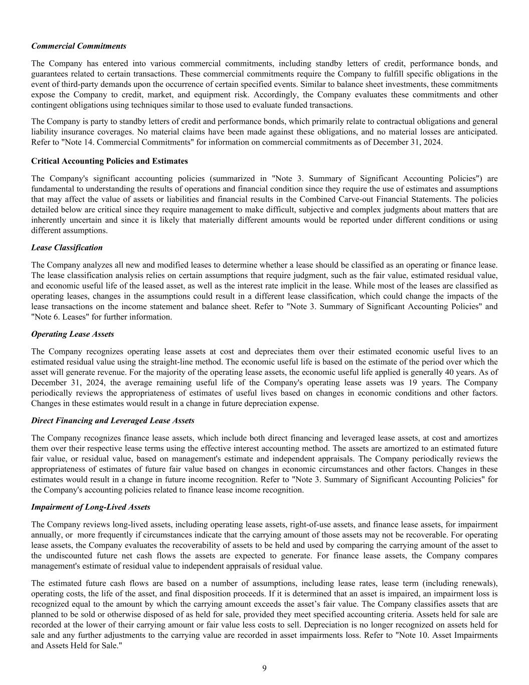 Commercial Commitments The Company has entered into various commercial commitments, including standby letters of credit, performance bonds, and guarantees related to certain transactions. These commercial commitments require the Company to fulfill specific obligations in the event of third-party demands upon the occurrence of certain specified events. Similar to balance sheet investments, these commitments expose the Company to credit, market, and equipment risk. Accordingly, the Company evaluates these commitments and other contingent obligations using techniques similar to those used to evaluate funded transactions. The Company is party to standby letters of credit and performance bonds, which primarily relate to contractual obligations and general liability insurance coverages. No material claims have been made against these obligations, and no material losses are anticipated. Refer to "Note 14. Commercial Commitments" for information on commercial commitments as of December 31, 2024. Critical Accounting Policies and Estimates The Company's significant accounting policies (summarized in "Note 3. Summary of Significant Accounting Policies") are fundamental to understanding the results of operations and financial condition since they require the use of estimates and assumptions that may affect the value of assets or liabilities and financial results in the Combined Carve-out Financial Statements. The policies detailed below are critical since they require management to make difficult, subjective and complex judgments about matters that are inherently uncertain and since it is likely that materially different amounts would be reported under different conditions or using different assumptions. Lease Classification The Company analyzes all new and modified leases to determine whether a lease should be classified as an operating or finance lease. The lease classification analysis relies on certain assumptions that require judgment, such as the fair value, estimated residual value, and economic useful life of the leased asset, as well as the interest rate implicit in the lease. While most of the leases are classified as operating leases, changes in the assumptions could result in a different lease classification, which could change the impacts of the lease transactions on the income statement and balance sheet. Refer to "Note 3. Summary of Significant Accounting Policies" and "Note 6. Leases" for further information. Operating Lease Assets The Company recognizes operating lease assets at cost and depreciates them over their estimated economic useful lives to an estimated residual value using the straight-line method. The economic useful life is based on the estimate of the period over which the asset will generate revenue. For the majority of the operating lease assets, the economic useful life applied is generally 40 years. As of December 31, 2024, the average remaining useful life of the Company's operating lease assets was 19 years. The Company periodically reviews the appropriateness of estimates of useful lives based on changes in economic conditions and other factors. Changes in these estimates would result in a change in future depreciation expense. Direct Financing and Leveraged Lease Assets The Company recognizes finance lease assets, which include both direct financing and leveraged lease assets, at cost and amortizes them over their respective lease terms using the effective interest accounting method. The assets are amortized to an estimated future fair value, or residual value, based on management's estimate and independent appraisals. The Company periodically reviews the appropriateness of estimates of future fair value based on changes in economic circumstances and other factors. Changes in these estimates would result in a change in future income recognition. Refer to "Note 3. Summary of Significant Accounting Policies" for the Company's accounting policies related to finance lease income recognition. Impairment of Long-Lived Assets The Company reviews long-lived assets, including operating lease assets, right-of-use assets, and finance lease assets, for impairment annually, or more frequently if circumstances indicate that the carrying amount of those assets may not be recoverable. For operating lease assets, the Company evaluates the recoverability of assets to be held and used by comparing the carrying amount of the asset to the undiscounted future net cash flows the assets are expected to generate. For finance lease assets, the Company compares management's estimate of residual value to independent appraisals of residual value. The estimated future cash flows are based on a number of assumptions, including lease rates, lease term (including renewals), operating costs, the life of the asset, and final disposition proceeds. If it is determined that an asset is impaired, an impairment loss is recognized equal to the amount by which the carrying amount exceeds the asset’s fair value. The Company classifies assets that are planned to be sold or otherwise disposed of as held for sale, provided they meet specified accounting criteria. Assets held for sale are recorded at the lower of their carrying amount or fair value less costs to sell. Depreciation is no longer recognized on assets held for sale and any further adjustments to the carrying value are recorded in asset impairments loss. Refer to "Note 10. Asset Impairments and Assets Held for Sale." 9