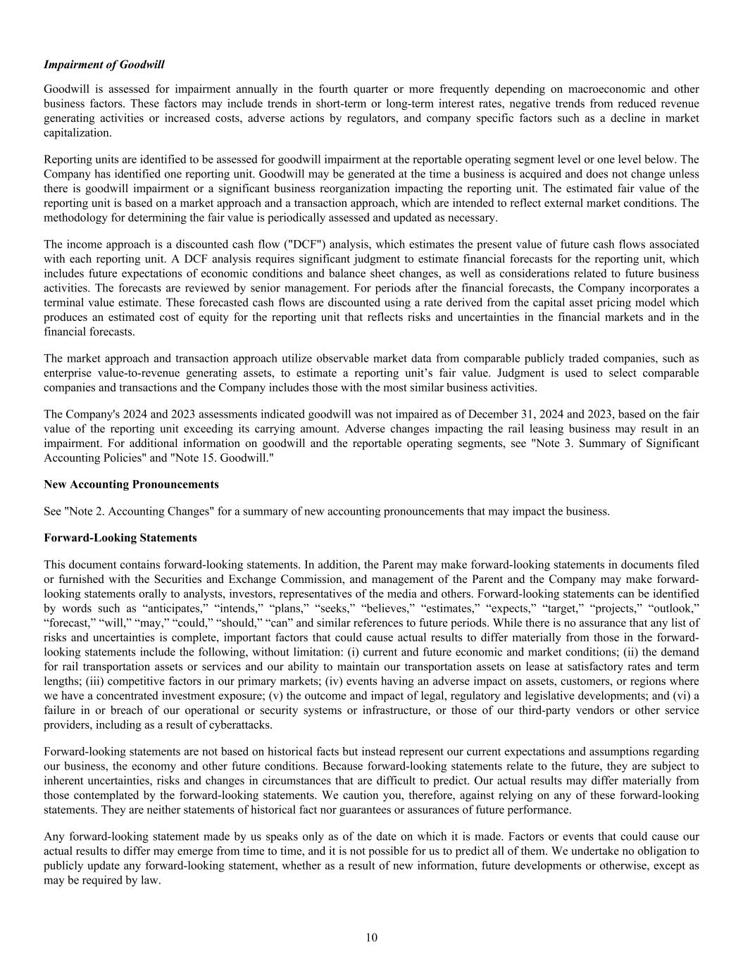 Impairment of Goodwill Goodwill is assessed for impairment annually in the fourth quarter or more frequently depending on macroeconomic and other business factors. These factors may include trends in short-term or long-term interest rates, negative trends from reduced revenue generating activities or increased costs, adverse actions by regulators, and company specific factors such as a decline in market capitalization. Reporting units are identified to be assessed for goodwill impairment at the reportable operating segment level or one level below. The Company has identified one reporting unit. Goodwill may be generated at the time a business is acquired and does not change unless there is goodwill impairment or a significant business reorganization impacting the reporting unit. The estimated fair value of the reporting unit is based on a market approach and a transaction approach, which are intended to reflect external market conditions. The methodology for determining the fair value is periodically assessed and updated as necessary. The income approach is a discounted cash flow ("DCF") analysis, which estimates the present value of future cash flows associated with each reporting unit. A DCF analysis requires significant judgment to estimate financial forecasts for the reporting unit, which includes future expectations of economic conditions and balance sheet changes, as well as considerations related to future business activities. The forecasts are reviewed by senior management. For periods after the financial forecasts, the Company incorporates a terminal value estimate. These forecasted cash flows are discounted using a rate derived from the capital asset pricing model which produces an estimated cost of equity for the reporting unit that reflects risks and uncertainties in the financial markets and in the financial forecasts. The market approach and transaction approach utilize observable market data from comparable publicly traded companies, such as enterprise value-to-revenue generating assets, to estimate a reporting unit’s fair value. Judgment is used to select comparable companies and transactions and the Company includes those with the most similar business activities. The Company's 2024 and 2023 assessments indicated goodwill was not impaired as of December 31, 2024 and 2023, based on the fair value of the reporting unit exceeding its carrying amount. Adverse changes impacting the rail leasing business may result in an impairment. For additional information on goodwill and the reportable operating segments, see "Note 3. Summary of Significant Accounting Policies" and "Note 15. Goodwill." New Accounting Pronouncements See "Note 2. Accounting Changes" for a summary of new accounting pronouncements that may impact the business. Forward-Looking Statements This document contains forward-looking statements. In addition, the Parent may make forward-looking statements in documents filed or furnished with the Securities and Exchange Commission, and management of the Parent and the Company may make forward- looking statements orally to analysts, investors, representatives of the media and others. Forward-looking statements can be identified by words such as “anticipates,” “intends,” “plans,” “seeks,” “believes,” “estimates,” “expects,” “target,” “projects,” “outlook,” “forecast,” “will,” “may,” “could,” “should,” “can” and similar references to future periods. While there is no assurance that any list of risks and uncertainties is complete, important factors that could cause actual results to differ materially from those in the forward- looking statements include the following, without limitation: (i) current and future economic and market conditions; (ii) the demand for rail transportation assets or services and our ability to maintain our transportation assets on lease at satisfactory rates and term lengths; (iii) competitive factors in our primary markets; (iv) events having an adverse impact on assets, customers, or regions where we have a concentrated investment exposure; (v) the outcome and impact of legal, regulatory and legislative developments; and (vi) a failure in or breach of our operational or security systems or infrastructure, or those of our third-party vendors or other service providers, including as a result of cyberattacks. Forward-looking statements are not based on historical facts but instead represent our current expectations and assumptions regarding our business, the economy and other future conditions. Because forward-looking statements relate to the future, they are subject to inherent uncertainties, risks and changes in circumstances that are difficult to predict. Our actual results may differ materially from those contemplated by the forward-looking statements. We caution you, therefore, against relying on any of these forward-looking statements. They are neither statements of historical fact nor guarantees or assurances of future performance. Any forward-looking statement made by us speaks only as of the date on which it is made. Factors or events that could cause our actual results to differ may emerge from time to time, and it is not possible for us to predict all of them. We undertake no obligation to publicly update any forward-looking statement, whether as a result of new information, future developments or otherwise, except as may be required by law. 10