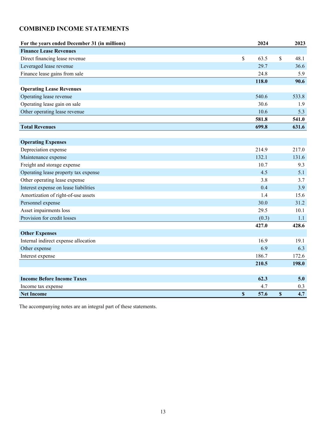 COMBINED INCOME STATEMENTS For the years ended December 31 (in millions) 2024 2023 Finance Lease Revenues Direct financing lease revenue $ 63.5 $ 48.1 Leveraged lease revenue 29.7 36.6 Finance lease gains from sale 24.8 5.9 118.0 90.6 Operating Lease Revenues Operating lease revenue 540.6 533.8 Operating lease gain on sale 30.6 1.9 Other operating lease revenue 10.6 5.3 581.8 541.0 Total Revenues 699.8 631.6 Operating Expenses Depreciation expense 214.9 217.0 Maintenance expense 132.1 131.6 Freight and storage expense 10.7 9.3 Operating lease property tax expense 4.5 5.1 Other operating lease expense 3.8 3.7 Interest expense on lease liabilities 0.4 3.9 Amortization of right-of-use assets 1.4 15.6 Personnel expense 30.0 31.2 Asset impairments loss 29.5 10.1 Provision for credit losses (0.3) 1.1 427.0 428.6 Other Expenses Internal indirect expense allocation 16.9 19.1 Other expense 6.9 6.3 Interest expense 186.7 172.6 210.5 198.0 Income Before Income Taxes 62.3 5.0 Income tax expense 4.7 0.3 Net Income $ 57.6 $ 4.7 The accompanying notes are an integral part of these statements. 13