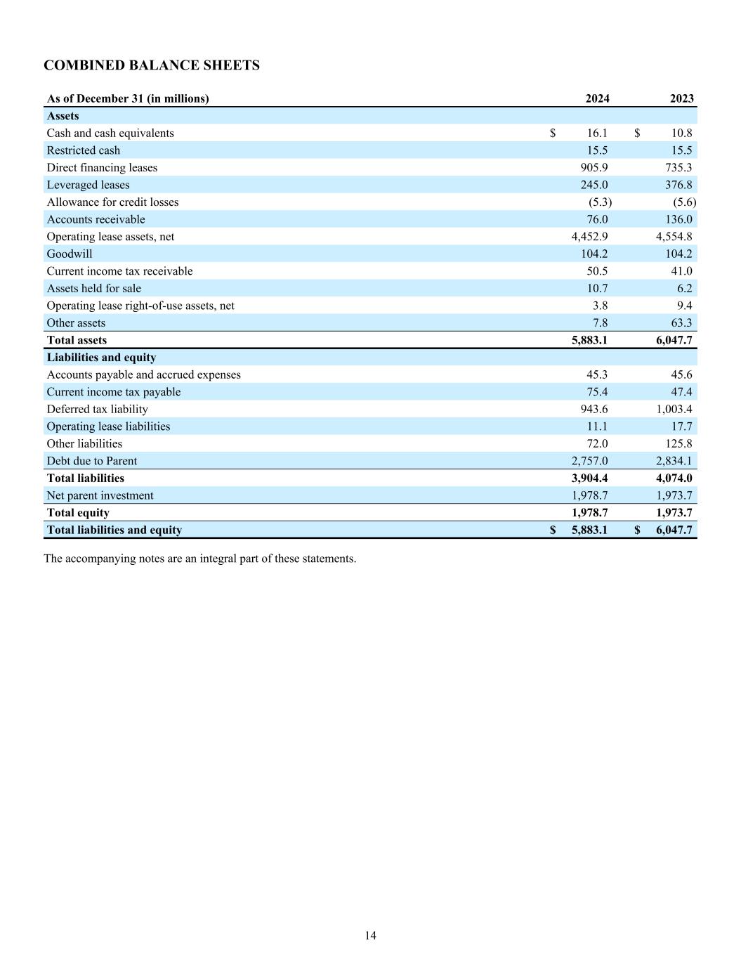 COMBINED BALANCE SHEETS Assets Cash and cash equivalents $ 16.1 $ 10.8 Restricted cash 15.5 15.5 Direct financing leases 905.9 735.3 Leveraged leases 245.0 376.8 Allowance for credit losses (5.3) (5.6) Accounts receivable 76.0 136.0 Operating lease assets, net 4,452.9 4,554.8 Goodwill 104.2 104.2 Current income tax receivable 50.5 41.0 Assets held for sale 10.7 6.2 Operating lease right-of-use assets, net 3.8 9.4 Other assets 7.8 63.3 Total assets 5,883.1 6,047.7 Liabilities and equity Accounts payable and accrued expenses 45.3 45.6 Current income tax payable 75.4 47.4 Deferred tax liability 943.6 1,003.4 Operating lease liabilities 11.1 17.7 Other liabilities 72.0 125.8 Debt due to Parent 2,757.0 2,834.1 Total liabilities 3,904.4 4,074.0 Net parent investment 1,978.7 1,973.7 Total equity 1,978.7 1,973.7 Total liabilities and equity $ 5,883.1 $ 6,047.7 As of December 31 (in millions) 2024 2023 The accompanying notes are an integral part of these statements. 14