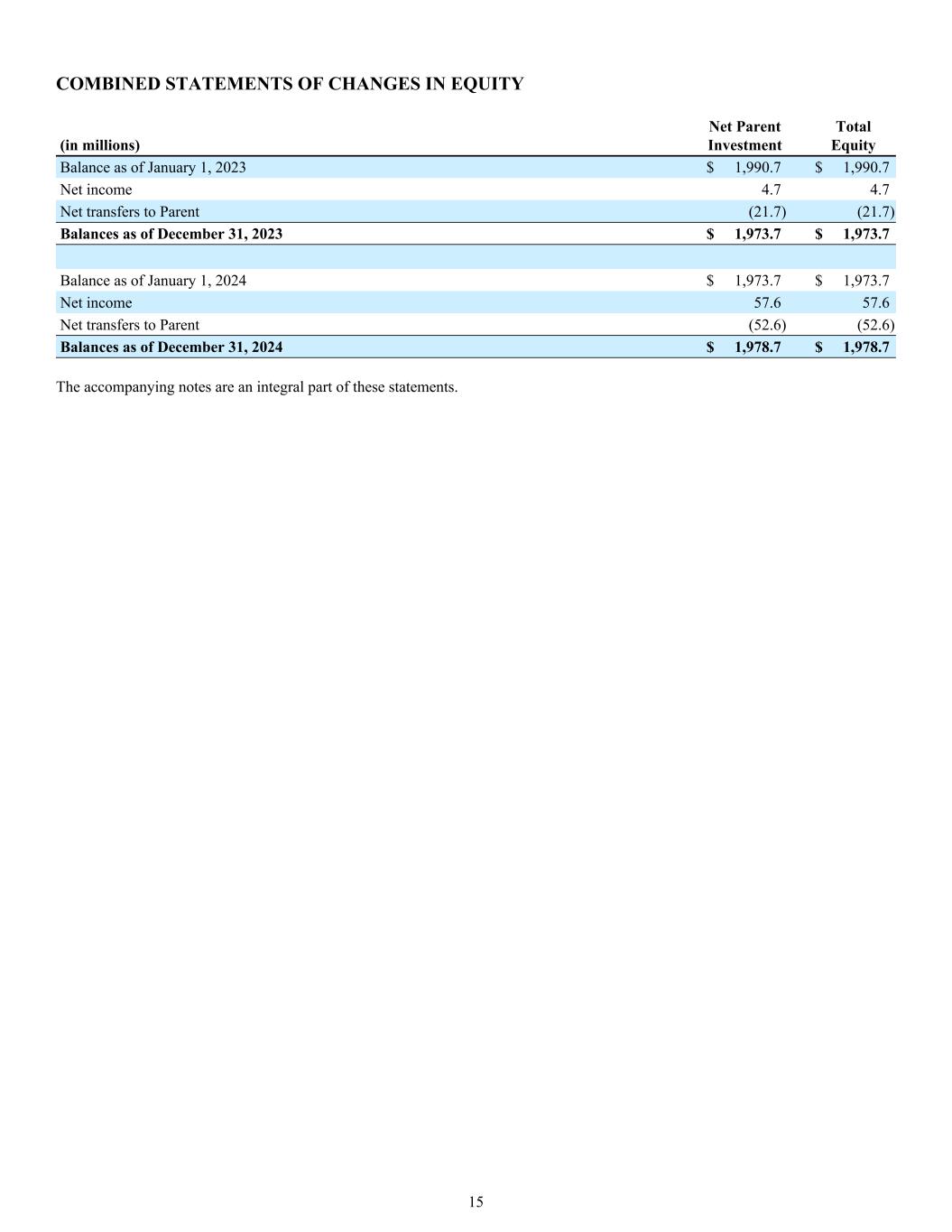 COMBINED STATEMENTS OF CHANGES IN EQUITY (in millions) Net Parent Investment Total Equity Balance as of January 1, 2023 $ 1,990.7 $ 1,990.7 Net income 4.7 4.7 Net transfers to Parent (21.7) (21.7) Balances as of December 31, 2023 $ 1,973.7 $ 1,973.7 Balance as of January 1, 2024 $ 1,973.7 $ 1,973.7 Net income 57.6 57.6 Net transfers to Parent (52.6) (52.6) Balances as of December 31, 2024 $ 1,978.7 $ 1,978.7 The accompanying notes are an integral part of these statements. 15
