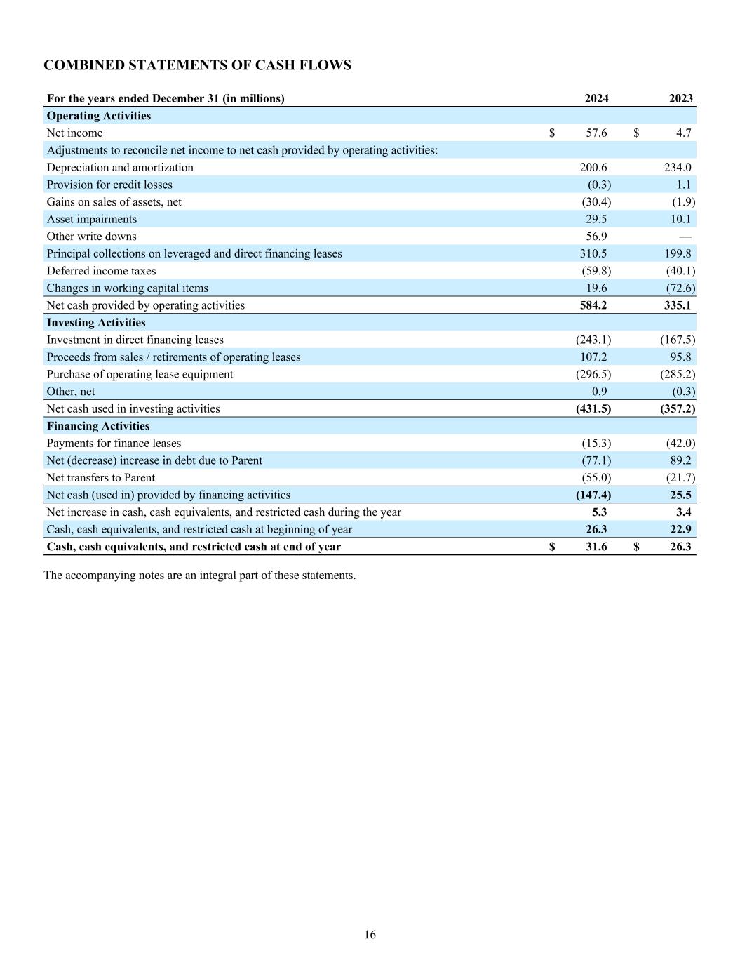 COMBINED STATEMENTS OF CASH FLOWS For the years ended December 31 (in millions) 2024 2023 Operating Activities Net income $ 57.6 $ 4.7 Adjustments to reconcile net income to net cash provided by operating activities: Depreciation and amortization 200.6 234.0 Provision for credit losses (0.3) 1.1 Gains on sales of assets, net (30.4) (1.9) Asset impairments 29.5 10.1 Other write downs 56.9 — Principal collections on leveraged and direct financing leases 310.5 199.8 Deferred income taxes (59.8) (40.1) Changes in working capital items 19.6 (72.6) Net cash provided by operating activities 584.2 335.1 Investing Activities Investment in direct financing leases (243.1) (167.5) Proceeds from sales / retirements of operating leases 107.2 95.8 Purchase of operating lease equipment (296.5) (285.2) Other, net 0.9 (0.3) Net cash used in investing activities (431.5) (357.2) Financing Activities Payments for finance leases (15.3) (42.0) Net (decrease) increase in debt due to Parent (77.1) 89.2 Net transfers to Parent (55.0) (21.7) Net cash (used in) provided by financing activities (147.4) 25.5 Net increase in cash, cash equivalents, and restricted cash during the year 5.3 3.4 Cash, cash equivalents, and restricted cash at beginning of year 26.3 22.9 Cash, cash equivalents, and restricted cash at end of year $ 31.6 $ 26.3 The accompanying notes are an integral part of these statements. 16