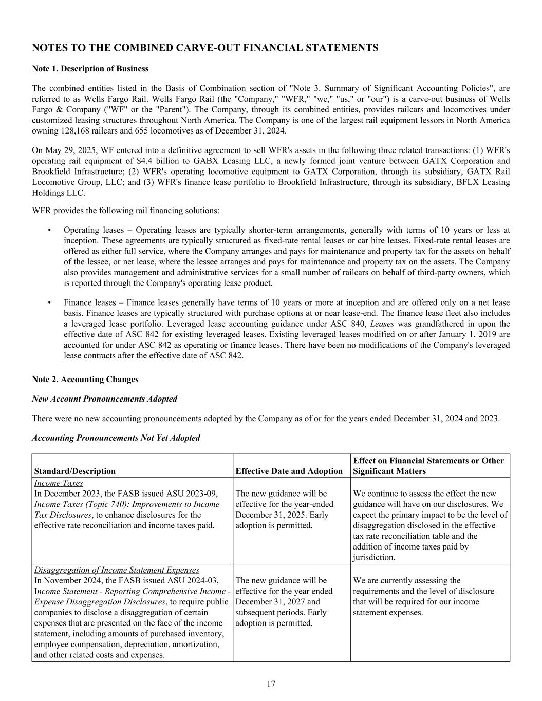 NOTES TO THE COMBINED CARVE-OUT FINANCIAL STATEMENTS Note 1. Description of Business The combined entities listed in the Basis of Combination section of "Note 3. Summary of Significant Accounting Policies", are referred to as Wells Fargo Rail. Wells Fargo Rail (the "Company," "WFR," "we," "us," or "our") is a carve-out business of Wells Fargo & Company ("WF" or the "Parent"). The Company, through its combined entities, provides railcars and locomotives under customized leasing structures throughout North America. The Company is one of the largest rail equipment lessors in North America owning 128,168 railcars and 655 locomotives as of December 31, 2024. On May 29, 2025, WF entered into a definitive agreement to sell WFR's assets in the following three related transactions: (1) WFR's operating rail equipment of $4.4 billion to GABX Leasing LLC, a newly formed joint venture between GATX Corporation and Brookfield Infrastructure; (2) WFR's operating locomotive equipment to GATX Corporation, through its subsidiary, GATX Rail Locomotive Group, LLC; and (3) WFR's finance lease portfolio to Brookfield Infrastructure, through its subsidiary, BFLX Leasing Holdings LLC. WFR provides the following rail financing solutions: • Operating leases – Operating leases are typically shorter-term arrangements, generally with terms of 10 years or less at inception. These agreements are typically structured as fixed-rate rental leases or car hire leases. Fixed-rate rental leases are offered as either full service, where the Company arranges and pays for maintenance and property tax for the assets on behalf of the lessee, or net lease, where the lessee arranges and pays for maintenance and property tax on the assets. The Company also provides management and administrative services for a small number of railcars on behalf of third-party owners, which is reported through the Company's operating lease product. • Finance leases – Finance leases generally have terms of 10 years or more at inception and are offered only on a net lease basis. Finance leases are typically structured with purchase options at or near lease-end. The finance lease fleet also includes a leveraged lease portfolio. Leveraged lease accounting guidance under ASC 840, Leases was grandfathered in upon the effective date of ASC 842 for existing leveraged leases. Existing leveraged leases modified on or after January 1, 2019 are accounted for under ASC 842 as operating or finance leases. There have been no modifications of the Company's leveraged lease contracts after the effective date of ASC 842. Note 2. Accounting Changes New Account Pronouncements Adopted There were no new accounting pronouncements adopted by the Company as of or for the years ended December 31, 2024 and 2023. Accounting Pronouncements Not Yet Adopted Standard/Description Effective Date and Adoption Effect on Financial Statements or Other Significant Matters Income Taxes In December 2023, the FASB issued ASU 2023-09, Income Taxes (Topic 740): Improvements to Income Tax Disclosures, to enhance disclosures for the effective rate reconciliation and income taxes paid. The new guidance will be effective for the year-ended December 31, 2025. Early adoption is permitted. We continue to assess the effect the new guidance will have on our disclosures. We expect the primary impact to be the level of disaggregation disclosed in the effective tax rate reconciliation table and the addition of income taxes paid by jurisdiction. Disaggregation of Income Statement Expenses In November 2024, the FASB issued ASU 2024-03, Income Statement - Reporting Comprehensive Income - Expense Disaggregation Disclosures, to require public companies to disclose a disaggregation of certain expenses that are presented on the face of the income statement, including amounts of purchased inventory, employee compensation, depreciation, amortization, and other related costs and expenses. The new guidance will be effective for the year ended December 31, 2027 and subsequent periods. Early adoption is permitted. We are currently assessing the requirements and the level of disclosure that will be required for our income statement expenses. 17