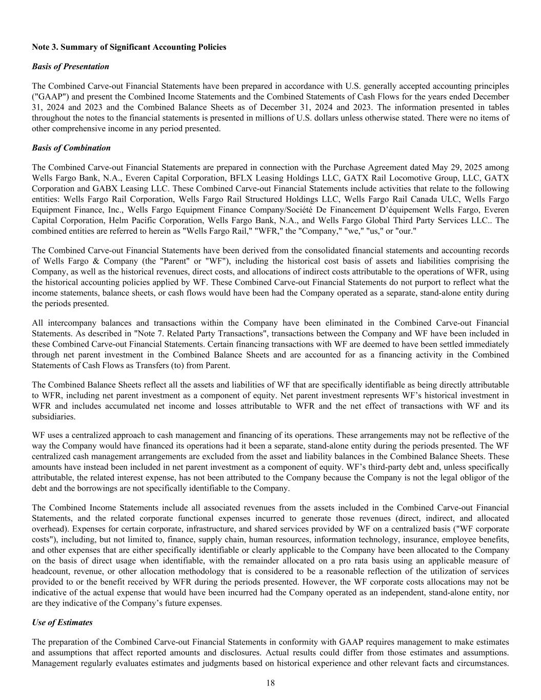 Note 3. Summary of Significant Accounting Policies Basis of Presentation The Combined Carve-out Financial Statements have been prepared in accordance with U.S. generally accepted accounting principles ("GAAP") and present the Combined Income Statements and the Combined Statements of Cash Flows for the years ended December 31, 2024 and 2023 and the Combined Balance Sheets as of December 31, 2024 and 2023. The information presented in tables throughout the notes to the financial statements is presented in millions of U.S. dollars unless otherwise stated. There were no items of other comprehensive income in any period presented. Basis of Combination The Combined Carve-out Financial Statements are prepared in connection with the Purchase Agreement dated May 29, 2025 among Wells Fargo Bank, N.A., Everen Capital Corporation, BFLX Leasing Holdings LLC, GATX Rail Locomotive Group, LLC, GATX Corporation and GABX Leasing LLC. These Combined Carve-out Financial Statements include activities that relate to the following entities: Wells Fargo Rail Corporation, Wells Fargo Rail Structured Holdings LLC, Wells Fargo Rail Canada ULC, Wells Fargo Equipment Finance, Inc., Wells Fargo Equipment Finance Company/Société De Financement D’équipement Wells Fargo, Everen Capital Corporation, Helm Pacific Corporation, Wells Fargo Bank, N.A., and Wells Fargo Global Third Party Services LLC.. The combined entities are referred to herein as "Wells Fargo Rail," "WFR," the "Company," "we," "us," or "our." The Combined Carve-out Financial Statements have been derived from the consolidated financial statements and accounting records of Wells Fargo & Company (the "Parent" or "WF"), including the historical cost basis of assets and liabilities comprising the Company, as well as the historical revenues, direct costs, and allocations of indirect costs attributable to the operations of WFR, using the historical accounting policies applied by WF. These Combined Carve-out Financial Statements do not purport to reflect what the income statements, balance sheets, or cash flows would have been had the Company operated as a separate, stand-alone entity during the periods presented. All intercompany balances and transactions within the Company have been eliminated in the Combined Carve-out Financial Statements. As described in "Note 7. Related Party Transactions", transactions between the Company and WF have been included in these Combined Carve-out Financial Statements. Certain financing transactions with WF are deemed to have been settled immediately through net parent investment in the Combined Balance Sheets and are accounted for as a financing activity in the Combined Statements of Cash Flows as Transfers (to) from Parent. The Combined Balance Sheets reflect all the assets and liabilities of WF that are specifically identifiable as being directly attributable to WFR, including net parent investment as a component of equity. Net parent investment represents WF’s historical investment in WFR and includes accumulated net income and losses attributable to WFR and the net effect of transactions with WF and its subsidiaries. WF uses a centralized approach to cash management and financing of its operations. These arrangements may not be reflective of the way the Company would have financed its operations had it been a separate, stand-alone entity during the periods presented. The WF centralized cash management arrangements are excluded from the asset and liability balances in the Combined Balance Sheets. These amounts have instead been included in net parent investment as a component of equity. WF’s third-party debt and, unless specifically attributable, the related interest expense, has not been attributed to the Company because the Company is not the legal obligor of the debt and the borrowings are not specifically identifiable to the Company. The Combined Income Statements include all associated revenues from the assets included in the Combined Carve-out Financial Statements, and the related corporate functional expenses incurred to generate those revenues (direct, indirect, and allocated overhead). Expenses for certain corporate, infrastructure, and shared services provided by WF on a centralized basis ("WF corporate costs"), including, but not limited to, finance, supply chain, human resources, information technology, insurance, employee benefits, and other expenses that are either specifically identifiable or clearly applicable to the Company have been allocated to the Company on the basis of direct usage when identifiable, with the remainder allocated on a pro rata basis using an applicable measure of headcount, revenue, or other allocation methodology that is considered to be a reasonable reflection of the utilization of services provided to or the benefit received by WFR during the periods presented. However, the WF corporate costs allocations may not be indicative of the actual expense that would have been incurred had the Company operated as an independent, stand-alone entity, nor are they indicative of the Company’s future expenses. Use of Estimates The preparation of the Combined Carve-out Financial Statements in conformity with GAAP requires management to make estimates and assumptions that affect reported amounts and disclosures. Actual results could differ from those estimates and assumptions. Management regularly evaluates estimates and judgments based on historical experience and other relevant facts and circumstances. 18