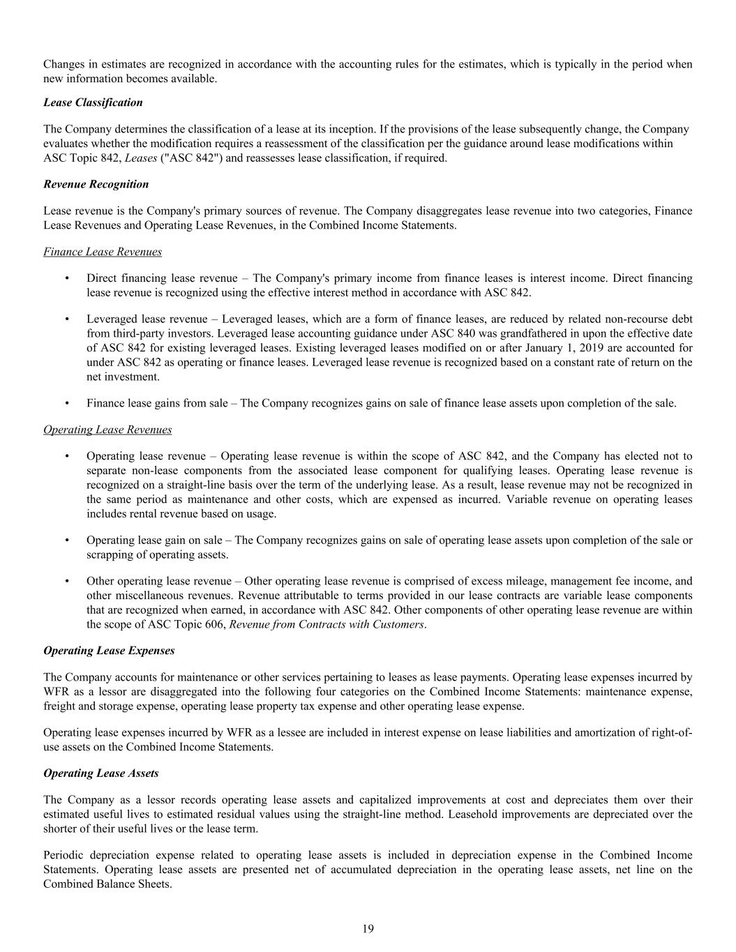 Changes in estimates are recognized in accordance with the accounting rules for the estimates, which is typically in the period when new information becomes available. Lease Classification The Company determines the classification of a lease at its inception. If the provisions of the lease subsequently change, the Company evaluates whether the modification requires a reassessment of the classification per the guidance around lease modifications within ASC Topic 842, Leases ("ASC 842") and reassesses lease classification, if required. Revenue Recognition Lease revenue is the Company's primary sources of revenue. The Company disaggregates lease revenue into two categories, Finance Lease Revenues and Operating Lease Revenues, in the Combined Income Statements. Finance Lease Revenues • Direct financing lease revenue – The Company's primary income from finance leases is interest income. Direct financing lease revenue is recognized using the effective interest method in accordance with ASC 842. • Leveraged lease revenue – Leveraged leases, which are a form of finance leases, are reduced by related non-recourse debt from third-party investors. Leveraged lease accounting guidance under ASC 840 was grandfathered in upon the effective date of ASC 842 for existing leveraged leases. Existing leveraged leases modified on or after January 1, 2019 are accounted for under ASC 842 as operating or finance leases. Leveraged lease revenue is recognized based on a constant rate of return on the net investment. • Finance lease gains from sale – The Company recognizes gains on sale of finance lease assets upon completion of the sale. Operating Lease Revenues • Operating lease revenue – Operating lease revenue is within the scope of ASC 842, and the Company has elected not to separate non-lease components from the associated lease component for qualifying leases. Operating lease revenue is recognized on a straight-line basis over the term of the underlying lease. As a result, lease revenue may not be recognized in the same period as maintenance and other costs, which are expensed as incurred. Variable revenue on operating leases includes rental revenue based on usage. • Operating lease gain on sale – The Company recognizes gains on sale of operating lease assets upon completion of the sale or scrapping of operating assets. • Other operating lease revenue – Other operating lease revenue is comprised of excess mileage, management fee income, and other miscellaneous revenues. Revenue attributable to terms provided in our lease contracts are variable lease components that are recognized when earned, in accordance with ASC 842. Other components of other operating lease revenue are within the scope of ASC Topic 606, Revenue from Contracts with Customers. Operating Lease Expenses The Company accounts for maintenance or other services pertaining to leases as lease payments. Operating lease expenses incurred by WFR as a lessor are disaggregated into the following four categories on the Combined Income Statements: maintenance expense, freight and storage expense, operating lease property tax expense and other operating lease expense. Operating lease expenses incurred by WFR as a lessee are included in interest expense on lease liabilities and amortization of right-of- use assets on the Combined Income Statements. Operating Lease Assets The Company as a lessor records operating lease assets and capitalized improvements at cost and depreciates them over their estimated useful lives to estimated residual values using the straight-line method. Leasehold improvements are depreciated over the shorter of their useful lives or the lease term. Periodic depreciation expense related to operating lease assets is included in depreciation expense in the Combined Income Statements. Operating lease assets are presented net of accumulated depreciation in the operating lease assets, net line on the Combined Balance Sheets. 19
