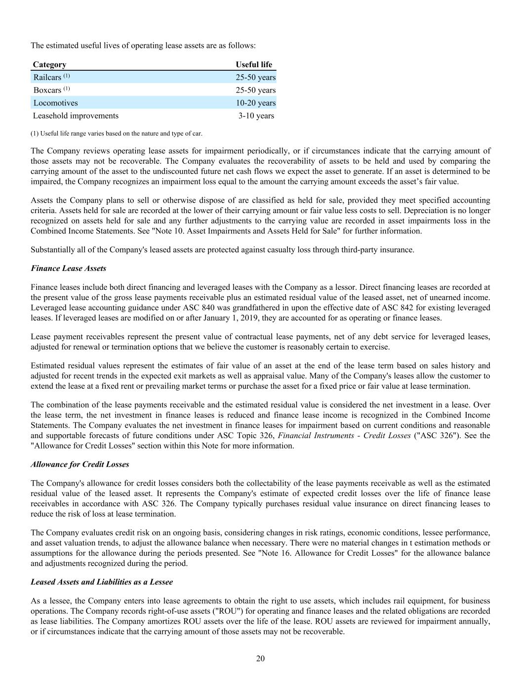 The estimated useful lives of operating lease assets are as follows: Railcars (1) 25-50 years Boxcars (1) 25-50 years Locomotives 10-20 years Leasehold improvements 3-10 years Category Useful life (1) Useful life range varies based on the nature and type of car. The Company reviews operating lease assets for impairment periodically, or if circumstances indicate that the carrying amount of those assets may not be recoverable. The Company evaluates the recoverability of assets to be held and used by comparing the carrying amount of the asset to the undiscounted future net cash flows we expect the asset to generate. If an asset is determined to be impaired, the Company recognizes an impairment loss equal to the amount the carrying amount exceeds the asset’s fair value. Assets the Company plans to sell or otherwise dispose of are classified as held for sale, provided they meet specified accounting criteria. Assets held for sale are recorded at the lower of their carrying amount or fair value less costs to sell. Depreciation is no longer recognized on assets held for sale and any further adjustments to the carrying value are recorded in asset impairments loss in the Combined Income Statements. See "Note 10. Asset Impairments and Assets Held for Sale" for further information. Substantially all of the Company's leased assets are protected against casualty loss through third-party insurance. Finance Lease Assets Finance leases include both direct financing and leveraged leases with the Company as a lessor. Direct financing leases are recorded at the present value of the gross lease payments receivable plus an estimated residual value of the leased asset, net of unearned income. Leveraged lease accounting guidance under ASC 840 was grandfathered in upon the effective date of ASC 842 for existing leveraged leases. If leveraged leases are modified on or after January 1, 2019, they are accounted for as operating or finance leases. Lease payment receivables represent the present value of contractual lease payments, net of any debt service for leveraged leases, adjusted for renewal or termination options that we believe the customer is reasonably certain to exercise. Estimated residual values represent the estimates of fair value of an asset at the end of the lease term based on sales history and adjusted for recent trends in the expected exit markets as well as appraisal value. Many of the Company's leases allow the customer to extend the lease at a fixed rent or prevailing market terms or purchase the asset for a fixed price or fair value at lease termination. The combination of the lease payments receivable and the estimated residual value is considered the net investment in a lease. Over the lease term, the net investment in finance leases is reduced and finance lease income is recognized in the Combined Income Statements. The Company evaluates the net investment in finance leases for impairment based on current conditions and reasonable and supportable forecasts of future conditions under ASC Topic 326, Financial Instruments - Credit Losses ("ASC 326"). See the "Allowance for Credit Losses" section within this Note for more information. Allowance for Credit Losses The Company's allowance for credit losses considers both the collectability of the lease payments receivable as well as the estimated residual value of the leased asset. It represents the Company's estimate of expected credit losses over the life of finance lease receivables in accordance with ASC 326. The Company typically purchases residual value insurance on direct financing leases to reduce the risk of loss at lease termination. The Company evaluates credit risk on an ongoing basis, considering changes in risk ratings, economic conditions, lessee performance, and asset valuation trends, to adjust the allowance balance when necessary. There were no material changes in t estimation methods or assumptions for the allowance during the periods presented. See "Note 16. Allowance for Credit Losses" for the allowance balance and adjustments recognized during the period. Leased Assets and Liabilities as a Lessee As a lessee, the Company enters into lease agreements to obtain the right to use assets, which includes rail equipment, for business operations. The Company records right-of-use assets ("ROU") for operating and finance leases and the related obligations are recorded as lease liabilities. The Company amortizes ROU assets over the life of the lease. ROU assets are reviewed for impairment annually, or if circumstances indicate that the carrying amount of those assets may not be recoverable. 20