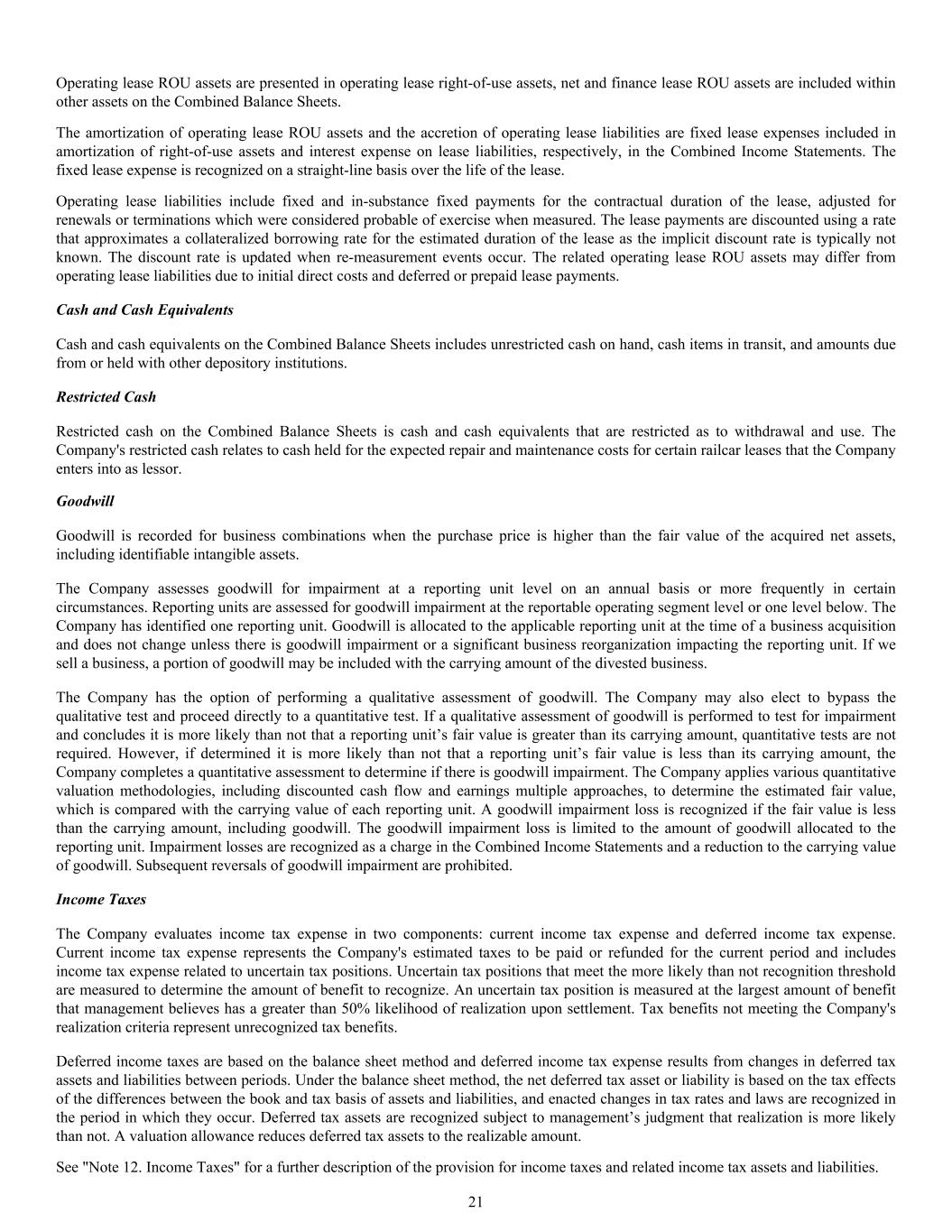 Operating lease ROU assets are presented in operating lease right-of-use assets, net and finance lease ROU assets are included within other assets on the Combined Balance Sheets. The amortization of operating lease ROU assets and the accretion of operating lease liabilities are fixed lease expenses included in amortization of right-of-use assets and interest expense on lease liabilities, respectively, in the Combined Income Statements. The fixed lease expense is recognized on a straight-line basis over the life of the lease. Operating lease liabilities include fixed and in-substance fixed payments for the contractual duration of the lease, adjusted for renewals or terminations which were considered probable of exercise when measured. The lease payments are discounted using a rate that approximates a collateralized borrowing rate for the estimated duration of the lease as the implicit discount rate is typically not known. The discount rate is updated when re-measurement events occur. The related operating lease ROU assets may differ from operating lease liabilities due to initial direct costs and deferred or prepaid lease payments. Cash and Cash Equivalents Cash and cash equivalents on the Combined Balance Sheets includes unrestricted cash on hand, cash items in transit, and amounts due from or held with other depository institutions. Restricted Cash Restricted cash on the Combined Balance Sheets is cash and cash equivalents that are restricted as to withdrawal and use. The Company's restricted cash relates to cash held for the expected repair and maintenance costs for certain railcar leases that the Company enters into as lessor. Goodwill Goodwill is recorded for business combinations when the purchase price is higher than the fair value of the acquired net assets, including identifiable intangible assets. The Company assesses goodwill for impairment at a reporting unit level on an annual basis or more frequently in certain circumstances. Reporting units are assessed for goodwill impairment at the reportable operating segment level or one level below. The Company has identified one reporting unit. Goodwill is allocated to the applicable reporting unit at the time of a business acquisition and does not change unless there is goodwill impairment or a significant business reorganization impacting the reporting unit. If we sell a business, a portion of goodwill may be included with the carrying amount of the divested business. The Company has the option of performing a qualitative assessment of goodwill. The Company may also elect to bypass the qualitative test and proceed directly to a quantitative test. If a qualitative assessment of goodwill is performed to test for impairment and concludes it is more likely than not that a reporting unit’s fair value is greater than its carrying amount, quantitative tests are not required. However, if determined it is more likely than not that a reporting unit’s fair value is less than its carrying amount, the Company completes a quantitative assessment to determine if there is goodwill impairment. The Company applies various quantitative valuation methodologies, including discounted cash flow and earnings multiple approaches, to determine the estimated fair value, which is compared with the carrying value of each reporting unit. A goodwill impairment loss is recognized if the fair value is less than the carrying amount, including goodwill. The goodwill impairment loss is limited to the amount of goodwill allocated to the reporting unit. Impairment losses are recognized as a charge in the Combined Income Statements and a reduction to the carrying value of goodwill. Subsequent reversals of goodwill impairment are prohibited. Income Taxes The Company evaluates income tax expense in two components: current income tax expense and deferred income tax expense. Current income tax expense represents the Company's estimated taxes to be paid or refunded for the current period and includes income tax expense related to uncertain tax positions. Uncertain tax positions that meet the more likely than not recognition threshold are measured to determine the amount of benefit to recognize. An uncertain tax position is measured at the largest amount of benefit that management believes has a greater than 50% likelihood of realization upon settlement. Tax benefits not meeting the Company's realization criteria represent unrecognized tax benefits. Deferred income taxes are based on the balance sheet method and deferred income tax expense results from changes in deferred tax assets and liabilities between periods. Under the balance sheet method, the net deferred tax asset or liability is based on the tax effects of the differences between the book and tax basis of assets and liabilities, and enacted changes in tax rates and laws are recognized in the period in which they occur. Deferred tax assets are recognized subject to management’s judgment that realization is more likely than not. A valuation allowance reduces deferred tax assets to the realizable amount. See "Note 12. Income Taxes" for a further description of the provision for income taxes and related income tax assets and liabilities. 21