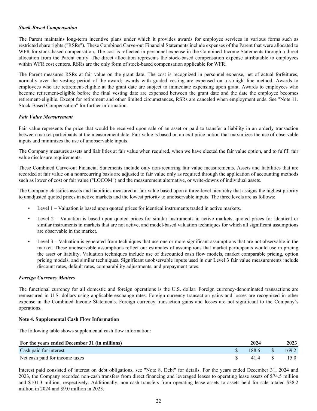 Stock-Based Compensation The Parent maintains long-term incentive plans under which it provides awards for employee services in various forms such as restricted share rights ("RSRs"). These Combined Carve-out Financial Statements include expenses of the Parent that were allocated to WFR for stock-based compensation. The cost is reflected in personnel expense in the Combined Income Statements through a direct allocation from the Parent entity. The direct allocation represents the stock-based compensation expense attributable to employees within WFR cost centers. RSRs are the only form of stock-based compensation applicable for WFR. The Parent measures RSRs at fair value on the grant date. The cost is recognized in personnel expense, net of actual forfeitures, normally over the vesting period of the award; awards with graded vesting are expensed on a straight-line method. Awards to employees who are retirement-eligible at the grant date are subject to immediate expensing upon grant. Awards to employees who become retirement-eligible before the final vesting date are expensed between the grant date and the date the employee becomes retirement-eligible. Except for retirement and other limited circumstances, RSRs are canceled when employment ends. See "Note 11. Stock-Based Compensation" for further information. Fair Value Measurement Fair value represents the price that would be received upon sale of an asset or paid to transfer a liability in an orderly transaction between market participants at the measurement date. Fair value is based on an exit price notion that maximizes the use of observable inputs and minimizes the use of unobservable inputs. The Company measures assets and liabilities at fair value when required, when we have elected the fair value option, and to fulfill fair value disclosure requirements. These Combined Carve-out Financial Statements include only non-recurring fair value measurements. Assets and liabilities that are recorded at fair value on a nonrecurring basis are adjusted to fair value only as required through the application of accounting methods such as lower of cost or fair value ("LOCOM") and the measurement alternative, or write-downs of individual assets. The Company classifies assets and liabilities measured at fair value based upon a three-level hierarchy that assigns the highest priority to unadjusted quoted prices in active markets and the lowest priority to unobservable inputs. The three levels are as follows: • Level 1 – Valuation is based upon quoted prices for identical instruments traded in active markets. • Level 2 – Valuation is based upon quoted prices for similar instruments in active markets, quoted prices for identical or similar instruments in markets that are not active, and model-based valuation techniques for which all significant assumptions are observable in the market. • Level 3 – Valuation is generated from techniques that use one or more significant assumptions that are not observable in the market. These unobservable assumptions reflect our estimates of assumptions that market participants would use in pricing the asset or liability. Valuation techniques include use of discounted cash flow models, market comparable pricing, option pricing models, and similar techniques. Significant unobservable inputs used in our Level 3 fair value measurements include discount rates, default rates, comparability adjustments, and prepayment rates. Foreign Currency Matters The functional currency for all domestic and foreign operations is the U.S. dollar. Foreign currency-denominated transactions are remeasured in U.S. dollars using applicable exchange rates. Foreign currency transaction gains and losses are recognized in other expense in the Combined Income Statements. Foreign currency transaction gains and losses are not significant to the Company’s operations. Note 4. Supplemental Cash Flow Information The following table shows supplemental cash flow information: For the years ended December 31 (in millions) 2024 2023 Cash paid for interest $ 188.6 $ 169.2 Net cash paid for income taxes $ 41.4 $ 15.0 Interest paid consisted of interest on debt obligations, see "Note 8. Debt" for details. For the years ended December 31, 2024 and 2023, the Company recorded non-cash transfers from direct financing and leveraged leases to operating lease assets of $74.5 million and $101.3 million, respectively. Additionally, non-cash transfers from operating lease assets to assets held for sale totaled $38.2 million in 2024 and $9.0 million in 2023. 22