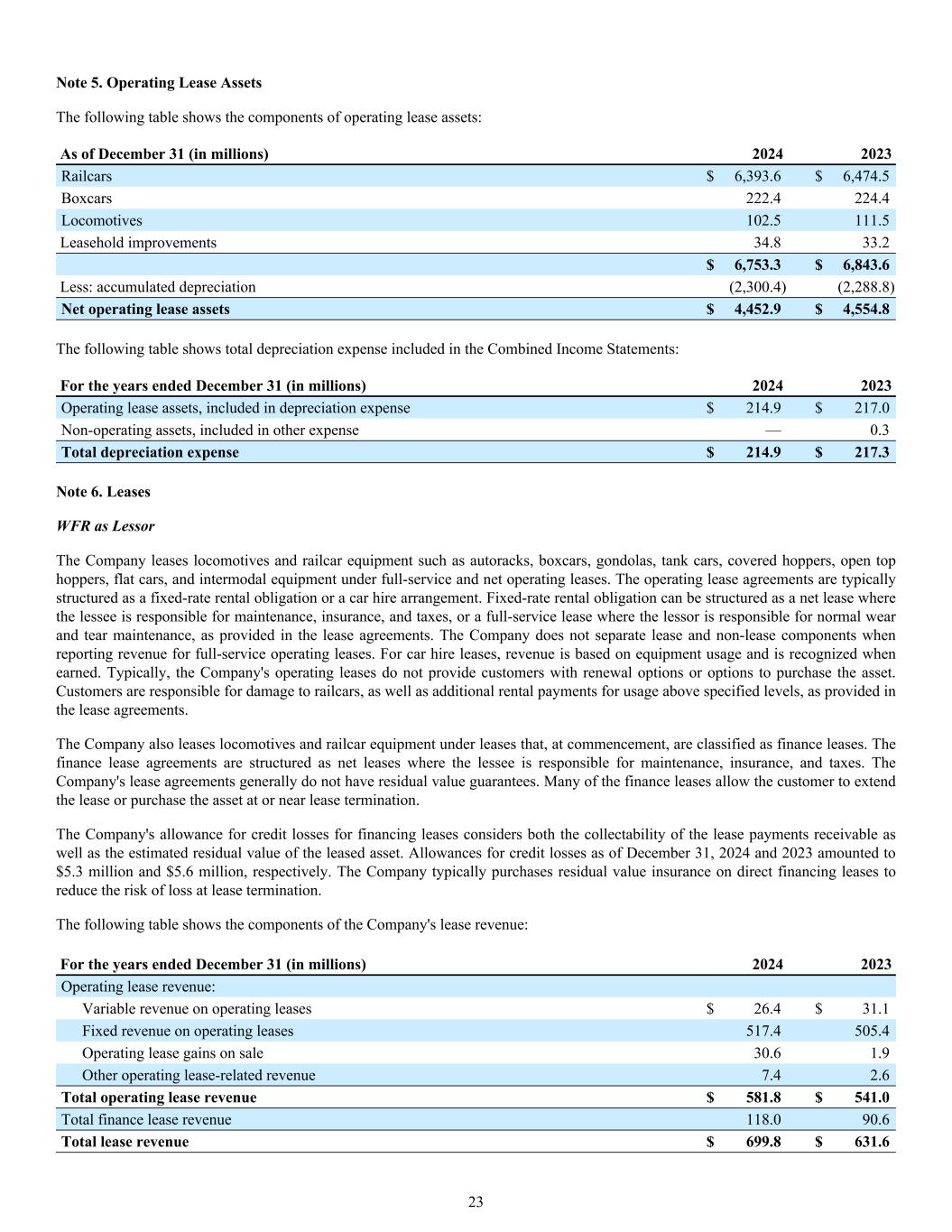 Note 5. Operating Lease Assets The following table shows the components of operating lease assets: As of December 31 (in millions) 2024 2023 Railcars $ 6,393.6 $ 6,474.5 Boxcars 222.4 224.4 Locomotives 102.5 111.5 Leasehold improvements 34.8 33.2 $ 6,753.3 $ 6,843.6 Less: accumulated depreciation (2,300.4) (2,288.8) Net operating lease assets $ 4,452.9 $ 4,554.8 The following table shows total depreciation expense included in the Combined Income Statements: For the years ended December 31 (in millions) 2024 2023 Operating lease assets, included in depreciation expense $ 214.9 $ 217.0 Non-operating assets, included in other expense — 0.3 Total depreciation expense $ 214.9 $ 217.3 Note 6. Leases WFR as Lessor The Company leases locomotives and railcar equipment such as autoracks, boxcars, gondolas, tank cars, covered hoppers, open top hoppers, flat cars, and intermodal equipment under full-service and net operating leases. The operating lease agreements are typically structured as a fixed-rate rental obligation or a car hire arrangement. Fixed-rate rental obligation can be structured as a net lease where the lessee is responsible for maintenance, insurance, and taxes, or a full-service lease where the lessor is responsible for normal wear and tear maintenance, as provided in the lease agreements. The Company does not separate lease and non-lease components when reporting revenue for full-service operating leases. For car hire leases, revenue is based on equipment usage and is recognized when earned. Typically, the Company's operating leases do not provide customers with renewal options or options to purchase the asset. Customers are responsible for damage to railcars, as well as additional rental payments for usage above specified levels, as provided in the lease agreements. The Company also leases locomotives and railcar equipment under leases that, at commencement, are classified as finance leases. The finance lease agreements are structured as net leases where the lessee is responsible for maintenance, insurance, and taxes. The Company's lease agreements generally do not have residual value guarantees. Many of the finance leases allow the customer to extend the lease or purchase the asset at or near lease termination. The Company's allowance for credit losses for financing leases considers both the collectability of the lease payments receivable as well as the estimated residual value of the leased asset. Allowances for credit losses as of December 31, 2024 and 2023 amounted to $5.3 million and $5.6 million, respectively. The Company typically purchases residual value insurance on direct financing leases to reduce the risk of loss at lease termination. The following table shows the components of the Company's lease revenue: For the years ended December 31 (in millions) 2024 2023 Operating lease revenue: Variable revenue on operating leases $ 26.4 $ 31.1 Fixed revenue on operating leases 517.4 505.4 Operating lease gains on sale 30.6 1.9 Other operating lease-related revenue 7.4 2.6 Total operating lease revenue $ 581.8 $ 541.0 Total finance lease revenue 118.0 90.6 Total lease revenue $ 699.8 $ 631.6 23