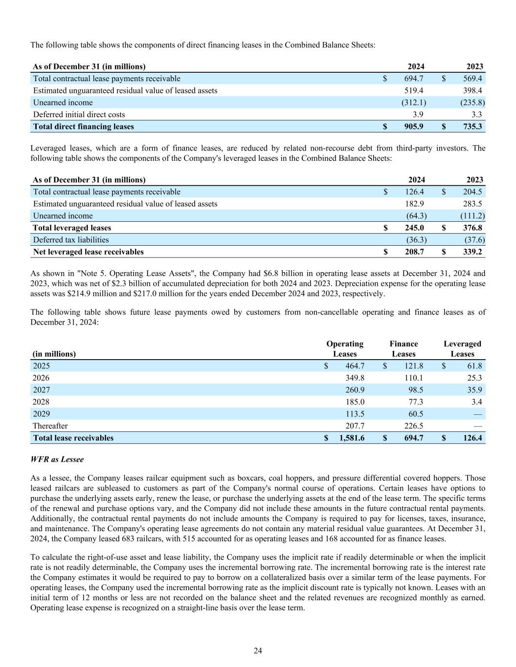 The following table shows the components of direct financing leases in the Combined Balance Sheets: As of December 31 (in millions) 2024 2023 Total contractual lease payments receivable $ 694.7 $ 569.4 Estimated unguaranteed residual value of leased assets 519.4 398.4 Unearned income (312.1) (235.8) Deferred initial direct costs 3.9 3.3 Total direct financing leases $ 905.9 $ 735.3 Leveraged leases, which are a form of finance leases, are reduced by related non-recourse debt from third-party investors. The following table shows the components of the Company's leveraged leases in the Combined Balance Sheets: As of December 31 (in millions) 2024 2023 Total contractual lease payments receivable $ 126.4 $ 204.5 Estimated unguaranteed residual value of leased assets 182.9 283.5 Unearned income (64.3) (111.2) Total leveraged leases $ 245.0 $ 376.8 Deferred tax liabilities (36.3) (37.6) Net leveraged lease receivables $ 208.7 $ 339.2 As shown in "Note 5. Operating Lease Assets", the Company had $6.8 billion in operating lease assets at December 31, 2024 and 2023, which was net of $2.3 billion of accumulated depreciation for both 2024 and 2023. Depreciation expense for the operating lease assets was $214.9 million and $217.0 million for the years ended December 2024 and 2023, respectively. The following table shows future lease payments owed by customers from non-cancellable operating and finance leases as of December 31, 2024: (in millions) Operating Leases Finance Leases Leveraged Leases 2025 $ 464.7 $ 121.8 $ 61.8 2026 349.8 110.1 25.3 2027 260.9 98.5 35.9 2028 185.0 77.3 3.4 2029 113.5 60.5 — Thereafter 207.7 226.5 — Total lease receivables $ 1,581.6 $ 694.7 $ 126.4 WFR as Lessee As a lessee, the Company leases railcar equipment such as boxcars, coal hoppers, and pressure differential covered hoppers. Those leased railcars are subleased to customers as part of the Company's normal course of operations. Certain leases have options to purchase the underlying assets early, renew the lease, or purchase the underlying assets at the end of the lease term. The specific terms of the renewal and purchase options vary, and the Company did not include these amounts in the future contractual rental payments. Additionally, the contractual rental payments do not include amounts the Company is required to pay for licenses, taxes, insurance, and maintenance. The Company's operating lease agreements do not contain any material residual value guarantees. At December 31, 2024, the Company leased 683 railcars, with 515 accounted for as operating leases and 168 accounted for as finance leases. To calculate the right-of-use asset and lease liability, the Company uses the implicit rate if readily determinable or when the implicit rate is not readily determinable, the Company uses the incremental borrowing rate. The incremental borrowing rate is the interest rate the Company estimates it would be required to pay to borrow on a collateralized basis over a similar term of the lease payments. For operating leases, the Company used the incremental borrowing rate as the implicit discount rate is typically not known. Leases with an initial term of 12 months or less are not recorded on the balance sheet and the related revenues are recognized monthly as earned. Operating lease expense is recognized on a straight-line basis over the lease term. 24