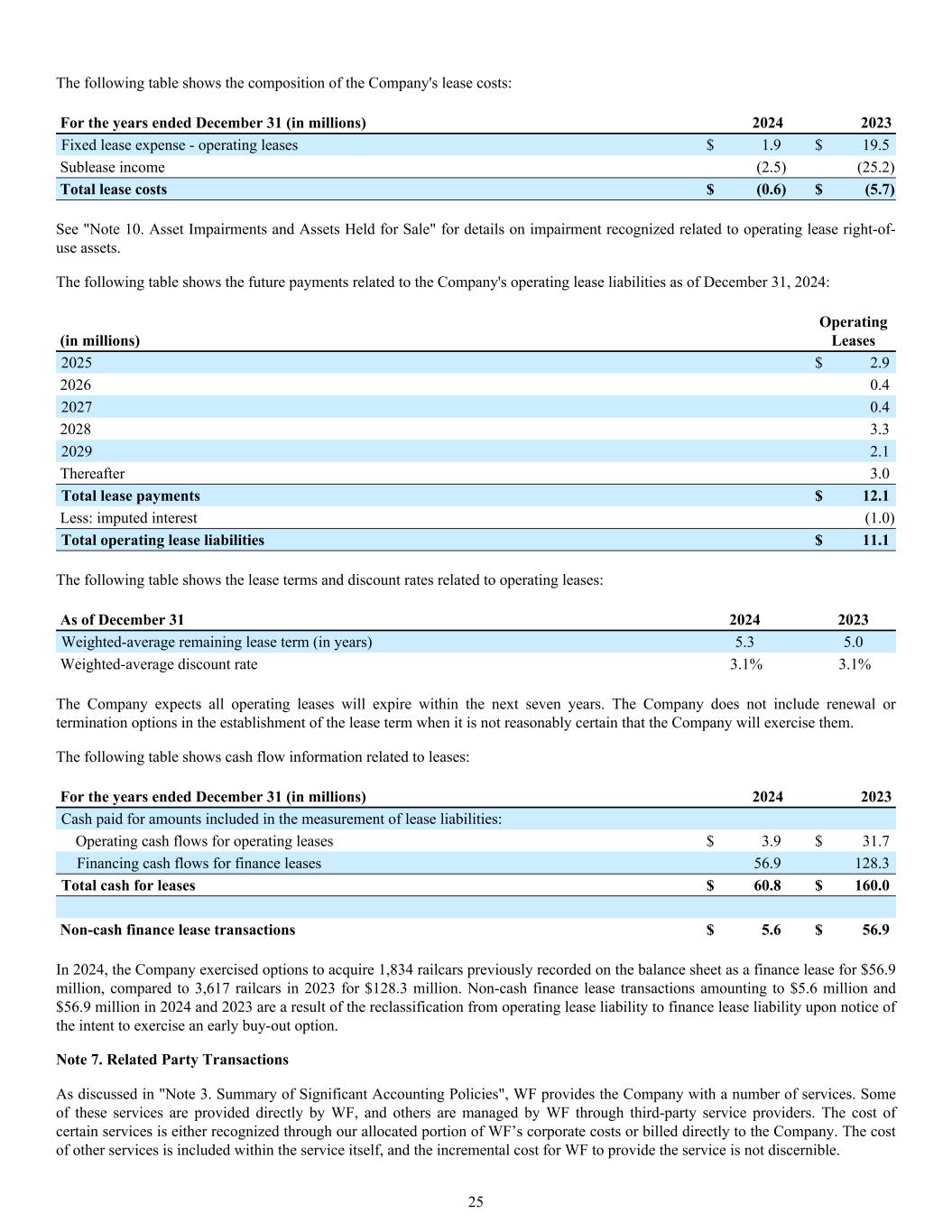 The following table shows the composition of the Company's lease costs: For the years ended December 31 (in millions) 2024 2023 Fixed lease expense - operating leases $ 1.9 $ 19.5 Sublease income (2.5) (25.2) Total lease costs $ (0.6) $ (5.7) See "Note 10. Asset Impairments and Assets Held for Sale" for details on impairment recognized related to operating lease right-of- use assets. The following table shows the future payments related to the Company's operating lease liabilities as of December 31, 2024: (in millions) Operating Leases 2025 $ 2.9 2026 0.4 2027 0.4 2028 3.3 2029 2.1 Thereafter 3.0 Total lease payments $ 12.1 Less: imputed interest (1.0) Total operating lease liabilities $ 11.1 The following table shows the lease terms and discount rates related to operating leases: As of December 31 2024 2023 Weighted-average remaining lease term (in years) 5.3 5.0 Weighted-average discount rate 3.1% 3.1% The Company expects all operating leases will expire within the next seven years. The Company does not include renewal or termination options in the establishment of the lease term when it is not reasonably certain that the Company will exercise them. The following table shows cash flow information related to leases: For the years ended December 31 (in millions) 2024 2023 Cash paid for amounts included in the measurement of lease liabilities: Operating cash flows for operating leases $ 3.9 $ 31.7 Financing cash flows for finance leases 56.9 128.3 Total cash for leases $ 60.8 $ 160.0 Non-cash finance lease transactions $ 5.6 $ 56.9 In 2024, the Company exercised options to acquire 1,834 railcars previously recorded on the balance sheet as a finance lease for $56.9 million, compared to 3,617 railcars in 2023 for $128.3 million. Non-cash finance lease transactions amounting to $5.6 million and $56.9 million in 2024 and 2023 are a result of the reclassification from operating lease liability to finance lease liability upon notice of the intent to exercise an early buy-out option. Note 7. Related Party Transactions As discussed in "Note 3. Summary of Significant Accounting Policies", WF provides the Company with a number of services. Some of these services are provided directly by WF, and others are managed by WF through third-party service providers. The cost of certain services is either recognized through our allocated portion of WF’s corporate costs or billed directly to the Company. The cost of other services is included within the service itself, and the incremental cost for WF to provide the service is not discernible. 25