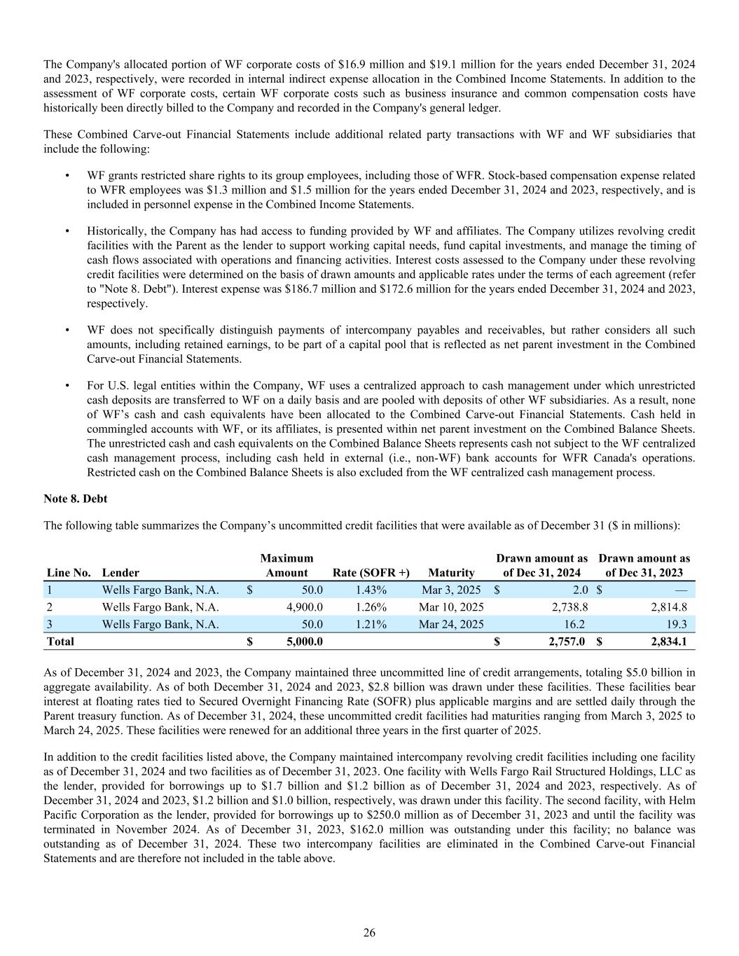 The Company's allocated portion of WF corporate costs of $16.9 million and $19.1 million for the years ended December 31, 2024 and 2023, respectively, were recorded in internal indirect expense allocation in the Combined Income Statements. In addition to the assessment of WF corporate costs, certain WF corporate costs such as business insurance and common compensation costs have historically been directly billed to the Company and recorded in the Company's general ledger. These Combined Carve-out Financial Statements include additional related party transactions with WF and WF subsidiaries that include the following: • WF grants restricted share rights to its group employees, including those of WFR. Stock-based compensation expense related to WFR employees was $1.3 million and $1.5 million for the years ended December 31, 2024 and 2023, respectively, and is included in personnel expense in the Combined Income Statements. • Historically, the Company has had access to funding provided by WF and affiliates. The Company utilizes revolving credit facilities with the Parent as the lender to support working capital needs, fund capital investments, and manage the timing of cash flows associated with operations and financing activities. Interest costs assessed to the Company under these revolving credit facilities were determined on the basis of drawn amounts and applicable rates under the terms of each agreement (refer to "Note 8. Debt"). Interest expense was $186.7 million and $172.6 million for the years ended December 31, 2024 and 2023, respectively. • WF does not specifically distinguish payments of intercompany payables and receivables, but rather considers all such amounts, including retained earnings, to be part of a capital pool that is reflected as net parent investment in the Combined Carve-out Financial Statements. • For U.S. legal entities within the Company, WF uses a centralized approach to cash management under which unrestricted cash deposits are transferred to WF on a daily basis and are pooled with deposits of other WF subsidiaries. As a result, none of WF’s cash and cash equivalents have been allocated to the Combined Carve-out Financial Statements. Cash held in commingled accounts with WF, or its affiliates, is presented within net parent investment on the Combined Balance Sheets. The unrestricted cash and cash equivalents on the Combined Balance Sheets represents cash not subject to the WF centralized cash management process, including cash held in external (i.e., non-WF) bank accounts for WFR Canada's operations. Restricted cash on the Combined Balance Sheets is also excluded from the WF centralized cash management process. Note 8. Debt The following table summarizes the Company’s uncommitted credit facilities that were available as of December 31 ($ in millions): Line No. Lender Maximum Amount Rate (SOFR +) Maturity Drawn amount as of Dec 31, 2024 Drawn amount as of Dec 31, 2023 1 Wells Fargo Bank, N.A. $ 50.0 1.43% Mar 3, 2025 $ 2.0 $ — 2 Wells Fargo Bank, N.A. 4,900.0 1.26% Mar 10, 2025 2,738.8 2,814.8 3 Wells Fargo Bank, N.A. 50.0 1.21% Mar 24, 2025 16.2 19.3 Total $ 5,000.0 $ 2,757.0 $ 2,834.1 As of December 31, 2024 and 2023, the Company maintained three uncommitted line of credit arrangements, totaling $5.0 billion in aggregate availability. As of both December 31, 2024 and 2023, $2.8 billion was drawn under these facilities. These facilities bear interest at floating rates tied to Secured Overnight Financing Rate (SOFR) plus applicable margins and are settled daily through the Parent treasury function. As of December 31, 2024, these uncommitted credit facilities had maturities ranging from March 3, 2025 to March 24, 2025. These facilities were renewed for an additional three years in the first quarter of 2025. In addition to the credit facilities listed above, the Company maintained intercompany revolving credit facilities including one facility as of December 31, 2024 and two facilities as of December 31, 2023. One facility with Wells Fargo Rail Structured Holdings, LLC as the lender, provided for borrowings up to $1.7 billion and $1.2 billion as of December 31, 2024 and 2023, respectively. As of December 31, 2024 and 2023, $1.2 billion and $1.0 billion, respectively, was drawn under this facility. The second facility, with Helm Pacific Corporation as the lender, provided for borrowings up to $250.0 million as of December 31, 2023 and until the facility was terminated in November 2024. As of December 31, 2023, $162.0 million was outstanding under this facility; no balance was outstanding as of December 31, 2024. These two intercompany facilities are eliminated in the Combined Carve-out Financial Statements and are therefore not included in the table above. 26