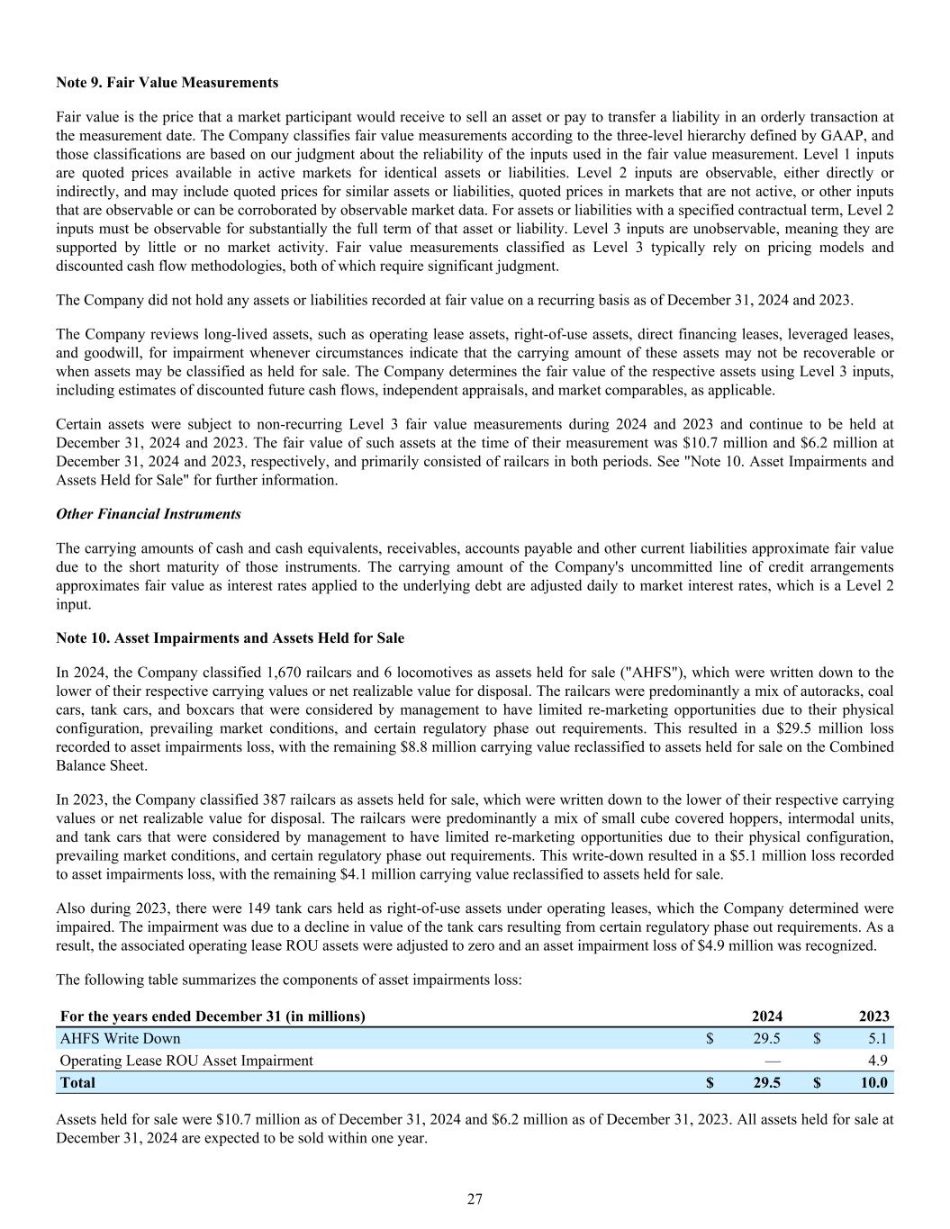 Note 9. Fair Value Measurements Fair value is the price that a market participant would receive to sell an asset or pay to transfer a liability in an orderly transaction at the measurement date. The Company classifies fair value measurements according to the three-level hierarchy defined by GAAP, and those classifications are based on our judgment about the reliability of the inputs used in the fair value measurement. Level 1 inputs are quoted prices available in active markets for identical assets or liabilities. Level 2 inputs are observable, either directly or indirectly, and may include quoted prices for similar assets or liabilities, quoted prices in markets that are not active, or other inputs that are observable or can be corroborated by observable market data. For assets or liabilities with a specified contractual term, Level 2 inputs must be observable for substantially the full term of that asset or liability. Level 3 inputs are unobservable, meaning they are supported by little or no market activity. Fair value measurements classified as Level 3 typically rely on pricing models and discounted cash flow methodologies, both of which require significant judgment. The Company did not hold any assets or liabilities recorded at fair value on a recurring basis as of December 31, 2024 and 2023. The Company reviews long-lived assets, such as operating lease assets, right-of-use assets, direct financing leases, leveraged leases, and goodwill, for impairment whenever circumstances indicate that the carrying amount of these assets may not be recoverable or when assets may be classified as held for sale. The Company determines the fair value of the respective assets using Level 3 inputs, including estimates of discounted future cash flows, independent appraisals, and market comparables, as applicable. Certain assets were subject to non-recurring Level 3 fair value measurements during 2024 and 2023 and continue to be held at December 31, 2024 and 2023. The fair value of such assets at the time of their measurement was $10.7 million and $6.2 million at December 31, 2024 and 2023, respectively, and primarily consisted of railcars in both periods. See "Note 10. Asset Impairments and Assets Held for Sale" for further information. Other Financial Instruments The carrying amounts of cash and cash equivalents, receivables, accounts payable and other current liabilities approximate fair value due to the short maturity of those instruments. The carrying amount of the Company's uncommitted line of credit arrangements approximates fair value as interest rates applied to the underlying debt are adjusted daily to market interest rates, which is a Level 2 input. Note 10. Asset Impairments and Assets Held for Sale In 2024, the Company classified 1,670 railcars and 6 locomotives as assets held for sale ("AHFS"), which were written down to the lower of their respective carrying values or net realizable value for disposal. The railcars were predominantly a mix of autoracks, coal cars, tank cars, and boxcars that were considered by management to have limited re-marketing opportunities due to their physical configuration, prevailing market conditions, and certain regulatory phase out requirements. This resulted in a $29.5 million loss recorded to asset impairments loss, with the remaining $8.8 million carrying value reclassified to assets held for sale on the Combined Balance Sheet. In 2023, the Company classified 387 railcars as assets held for sale, which were written down to the lower of their respective carrying values or net realizable value for disposal. The railcars were predominantly a mix of small cube covered hoppers, intermodal units, and tank cars that were considered by management to have limited re-marketing opportunities due to their physical configuration, prevailing market conditions, and certain regulatory phase out requirements. This write-down resulted in a $5.1 million loss recorded to asset impairments loss, with the remaining $4.1 million carrying value reclassified to assets held for sale. Also during 2023, there were 149 tank cars held as right-of-use assets under operating leases, which the Company determined were impaired. The impairment was due to a decline in value of the tank cars resulting from certain regulatory phase out requirements. As a result, the associated operating lease ROU assets were adjusted to zero and an asset impairment loss of $4.9 million was recognized. The following table summarizes the components of asset impairments loss: For the years ended December 31 (in millions) 2024 2023 AHFS Write Down $ 29.5 $ 5.1 Operating Lease ROU Asset Impairment — 4.9 Total $ 29.5 $ 10.0 Assets held for sale were $10.7 million as of December 31, 2024 and $6.2 million as of December 31, 2023. All assets held for sale at December 31, 2024 are expected to be sold within one year. 27