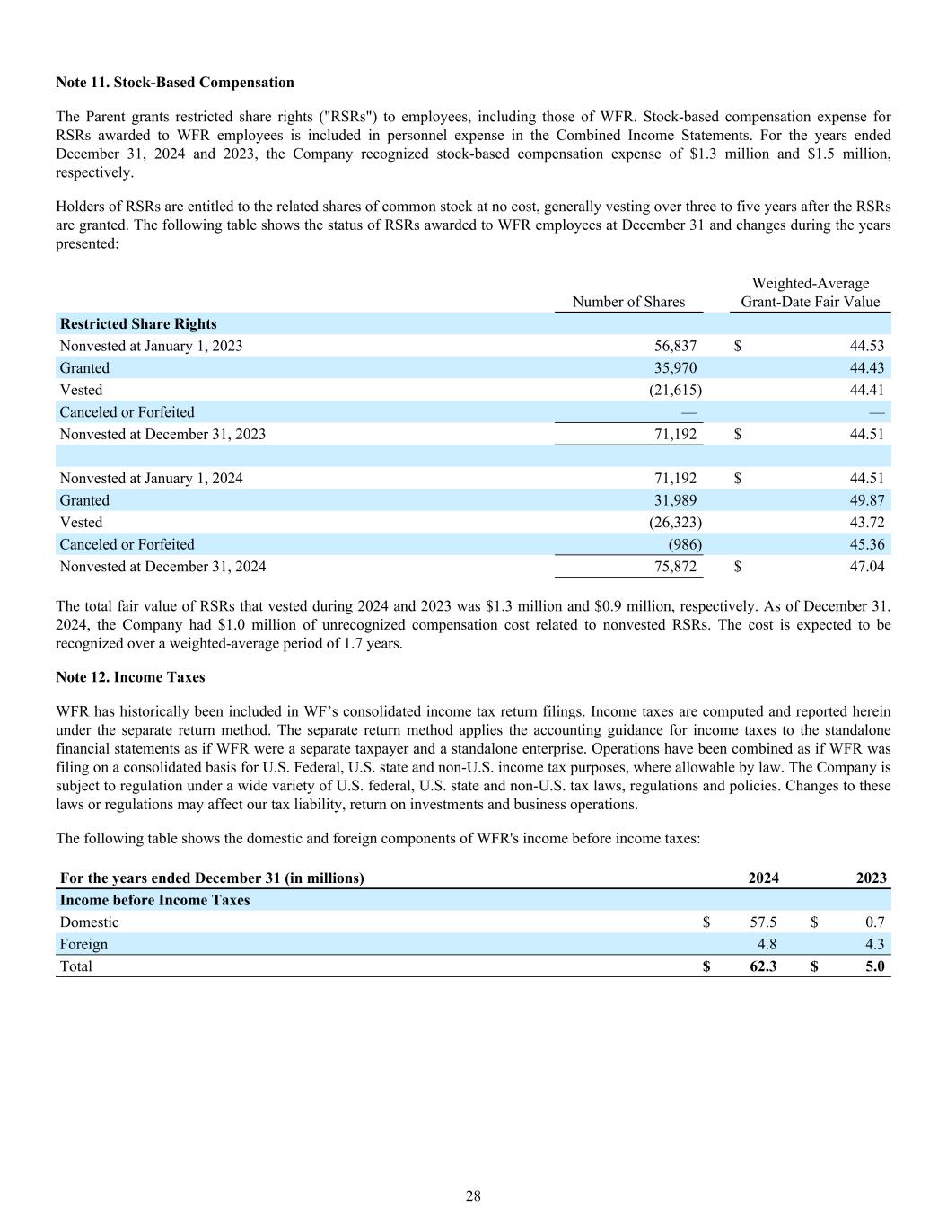 Note 11. Stock-Based Compensation The Parent grants restricted share rights ("RSRs") to employees, including those of WFR. Stock-based compensation expense for RSRs awarded to WFR employees is included in personnel expense in the Combined Income Statements. For the years ended December 31, 2024 and 2023, the Company recognized stock-based compensation expense of $1.3 million and $1.5 million, respectively. Holders of RSRs are entitled to the related shares of common stock at no cost, generally vesting over three to five years after the RSRs are granted. The following table shows the status of RSRs awarded to WFR employees at December 31 and changes during the years presented: Number of Shares Weighted-Average Grant-Date Fair Value Restricted Share Rights Nonvested at January 1, 2023 56,837 $ 44.53 Granted 35,970 44.43 Vested (21,615) 44.41 Canceled or Forfeited — — Nonvested at December 31, 2023 71,192 $ 44.51 Nonvested at January 1, 2024 71,192 $ 44.51 Granted 31,989 49.87 Vested (26,323) 43.72 Canceled or Forfeited (986) 45.36 Nonvested at December 31, 2024 75,872 $ 47.04 The total fair value of RSRs that vested during 2024 and 2023 was $1.3 million and $0.9 million, respectively. As of December 31, 2024, the Company had $1.0 million of unrecognized compensation cost related to nonvested RSRs. The cost is expected to be recognized over a weighted-average period of 1.7 years. Note 12. Income Taxes WFR has historically been included in WF’s consolidated income tax return filings. Income taxes are computed and reported herein under the separate return method. The separate return method applies the accounting guidance for income taxes to the standalone financial statements as if WFR were a separate taxpayer and a standalone enterprise. Operations have been combined as if WFR was filing on a consolidated basis for U.S. Federal, U.S. state and non-U.S. income tax purposes, where allowable by law. The Company is subject to regulation under a wide variety of U.S. federal, U.S. state and non-U.S. tax laws, regulations and policies. Changes to these laws or regulations may affect our tax liability, return on investments and business operations. The following table shows the domestic and foreign components of WFR's income before income taxes: For the years ended December 31 (in millions) 2024 2023 Income before Income Taxes Domestic $ 57.5 $ 0.7 Foreign 4.8 4.3 Total $ 62.3 $ 5.0 28