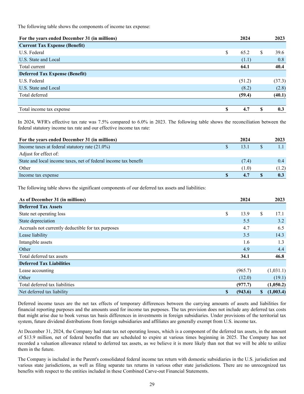 The following table shows the components of income tax expense: For the years ended December 31 (in millions) 2024 2023 Current Tax Expense (Benefit) U.S. Federal $ 65.2 $ 39.6 U.S. State and Local (1.1) 0.8 Total current 64.1 40.4 Deferred Tax Expense (Benefit) U.S. Federal (51.2) (37.3) U.S. State and Local (8.2) (2.8) Total deferred (59.4) (40.1) Total income tax expense $ 4.7 $ 0.3 In 2024, WFR's effective tax rate was 7.5% compared to 6.0% in 2023. The following table shows the reconciliation between the federal statutory income tax rate and our effective income tax rate: For the years ended December 31 (in millions) 2024 2023 Income taxes at federal statutory rate (21.0%) $ 13.1 $ 1.1 Adjust for effect of: State and local income taxes, net of federal income tax benefit (7.4) 0.4 Other (1.0) (1.2) Income tax expense $ 4.7 $ 0.3 The following table shows the significant components of our deferred tax assets and liabilities: As of December 31 (in millions) 2024 2023 Deferred Tax Assets State net operating loss $ 13.9 $ 17.1 State depreciation 5.5 3.2 Accruals not currently deductible for tax purposes 4.7 6.5 Lease liability 3.5 14.3 Intangible assets 1.6 1.3 Other 4.9 4.4 Total deferred tax assets 34.1 46.8 Deferred Tax Liabilities Lease accounting (965.7) (1,031.1) Other (12.0) (19.1) Total deferred tax liabilities (977.7) (1,050.2) Net deferred tax liability $ (943.6) $ (1,003.4) Deferred income taxes are the net tax effects of temporary differences between the carrying amounts of assets and liabilities for financial reporting purposes and the amounts used for income tax purposes. The tax provision does not include any deferred tax costs that might arise due to book versus tax basis differences in investments in foreign subsidiaries. Under provisions of the territorial tax system, future dividend distributions from foreign subsidiaries and affiliates are generally exempt from U.S. income tax. At December 31, 2024, the Company had state tax net operating losses, which is a component of the deferred tax assets, in the amount of $13.9 million, net of federal benefits that are scheduled to expire at various times beginning in 2025. The Company has not recorded a valuation allowance related to deferred tax assets, as we believe it is more likely than not that we will be able to utilize them in the future. The Company is included in the Parent's consolidated federal income tax return with domestic subsidiaries in the U.S. jurisdiction and various state jurisdictions, as well as filing separate tax returns in various other state jurisdictions. There are no unrecognized tax benefits with respect to the entities included in these Combined Carve-out Financial Statements. 29