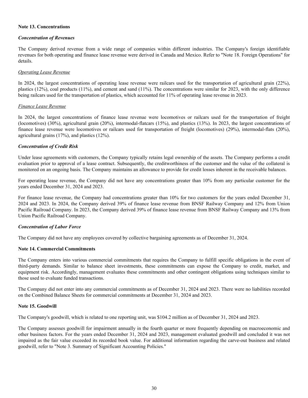 Note 13. Concentrations Concentration of Revenues The Company derived revenue from a wide range of companies within different industries. The Company's foreign identifiable revenues for both operating and finance lease revenue were derived in Canada and Mexico. Refer to "Note 18. Foreign Operations" for details. Operating Lease Revenue In 2024, the largest concentrations of operating lease revenue were railcars used for the transportation of agricultural grain (22%), plastics (12%), coal products (11%), and cement and sand (11%). The concentrations were similar for 2023, with the only difference being railcars used for the transportation of plastics, which accounted for 11% of operating lease revenue in 2023. Finance Lease Revenue In 2024, the largest concentrations of finance lease revenue were locomotives or railcars used for the transportation of freight (locomotives) (30%), agricultural grain (20%), intermodal-flatcars (15%), and plastics (13%). In 2023, the largest concentrations of finance lease revenue were locomotives or railcars used for transportation of freight (locomotives) (29%), intermodal-flats (20%), agricultural grains (17%), and plastics (12%). Concentration of Credit Risk Under lease agreements with customers, the Company typically retains legal ownership of the assets. The Company performs a credit evaluation prior to approval of a lease contract. Subsequently, the creditworthiness of the customer and the value of the collateral is monitored on an ongoing basis. The Company maintains an allowance to provide for credit losses inherent in the receivable balances. For operating lease revenue, the Company did not have any concentrations greater than 10% from any particular customer for the years ended December 31, 2024 and 2023. For finance lease revenue, the Company had concentrations greater than 10% for two customers for the years ended December 31, 2024 and 2023. In 2024, the Company derived 39% of finance lease revenue from BNSF Railway Company and 12% from Union Pacific Railroad Company. In 2023, the Company derived 39% of finance lease revenue from BNSF Railway Company and 13% from Union Pacific Railroad Company. Concentration of Labor Force The Company did not have any employees covered by collective bargaining agreements as of December 31, 2024. Note 14. Commercial Commitments The Company enters into various commercial commitments that requires the Company to fulfill specific obligations in the event of third-party demands. Similar to balance sheet investments, these commitments can expose the Company to credit, market, and equipment risk. Accordingly, management evaluates these commitments and other contingent obligations using techniques similar to those used to evaluate funded transactions. The Company did not enter into any commercial commitments as of December 31, 2024 and 2023. There were no liabilities recorded on the Combined Balance Sheets for commercial commitments at December 31, 2024 and 2023. Note 15. Goodwill The Company's goodwill, which is related to one reporting unit, was $104.2 million as of December 31, 2024 and 2023. The Company assesses goodwill for impairment annually in the fourth quarter or more frequently depending on macroeconomic and other business factors. For the years ended December 31, 2024 and 2023, management evaluated goodwill and concluded it was not impaired as the fair value exceeded its recorded book value. For additional information regarding the carve-out business and related goodwill, refer to "Note 3. Summary of Significant Accounting Policies." 30