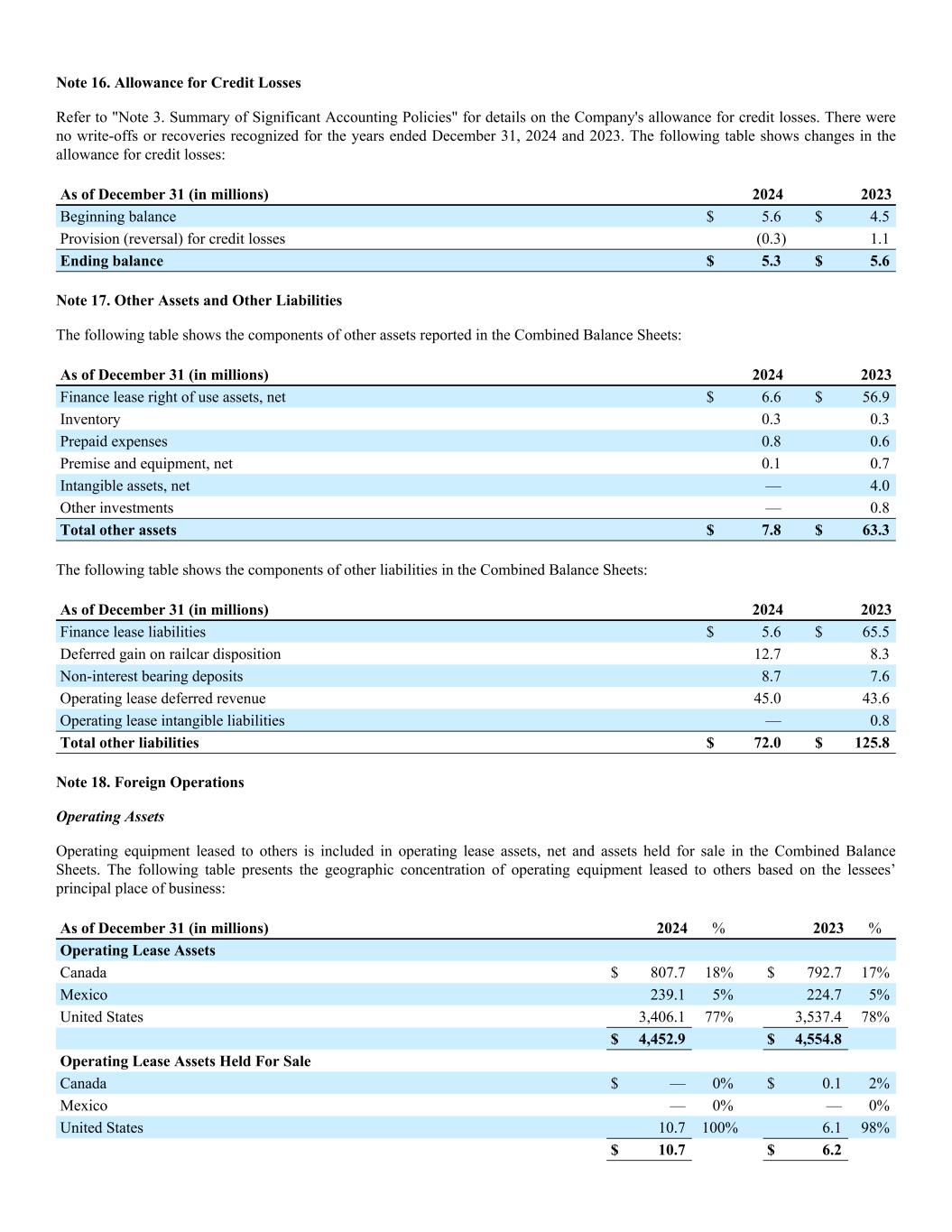 Note 16. Allowance for Credit Losses Refer to "Note 3. Summary of Significant Accounting Policies" for details on the Company's allowance for credit losses. There were no write-offs or recoveries recognized for the years ended December 31, 2024 and 2023. The following table shows changes in the allowance for credit losses: As of December 31 (in millions) 2024 2023 Beginning balance $ 5.6 $ 4.5 Provision (reversal) for credit losses (0.3) 1.1 Ending balance $ 5.3 $ 5.6 Note 17. Other Assets and Other Liabilities The following table shows the components of other assets reported in the Combined Balance Sheets: As of December 31 (in millions) 2024 2023 Finance lease right of use assets, net $ 6.6 $ 56.9 Inventory 0.3 0.3 Prepaid expenses 0.8 0.6 Premise and equipment, net 0.1 0.7 Intangible assets, net — 4.0 Other investments — 0.8 Total other assets $ 7.8 $ 63.3 The following table shows the components of other liabilities in the Combined Balance Sheets: As of December 31 (in millions) 2024 2023 Finance lease liabilities $ 5.6 $ 65.5 Deferred gain on railcar disposition 12.7 8.3 Non-interest bearing deposits 8.7 7.6 Operating lease deferred revenue 45.0 43.6 Operating lease intangible liabilities — 0.8 Total other liabilities $ 72.0 $ 125.8 Note 18. Foreign Operations Operating Assets Operating equipment leased to others is included in operating lease assets, net and assets held for sale in the Combined Balance Sheets. The following table presents the geographic concentration of operating equipment leased to others based on the lessees’ principal place of business: As of December 31 (in millions) 2024 % 2023 % Operating Lease Assets Canada $ 807.7 18% $ 792.7 17% Mexico 239.1 5% 224.7 5% United States 3,406.1 77% 3,537.4 78% $ 4,452.9 $ 4,554.8 Operating Lease Assets Held For Sale Canada $ — 0% $ 0.1 2% Mexico — 0% — 0% United States 10.7 100% 6.1 98% $ 10.7 $ 6.2