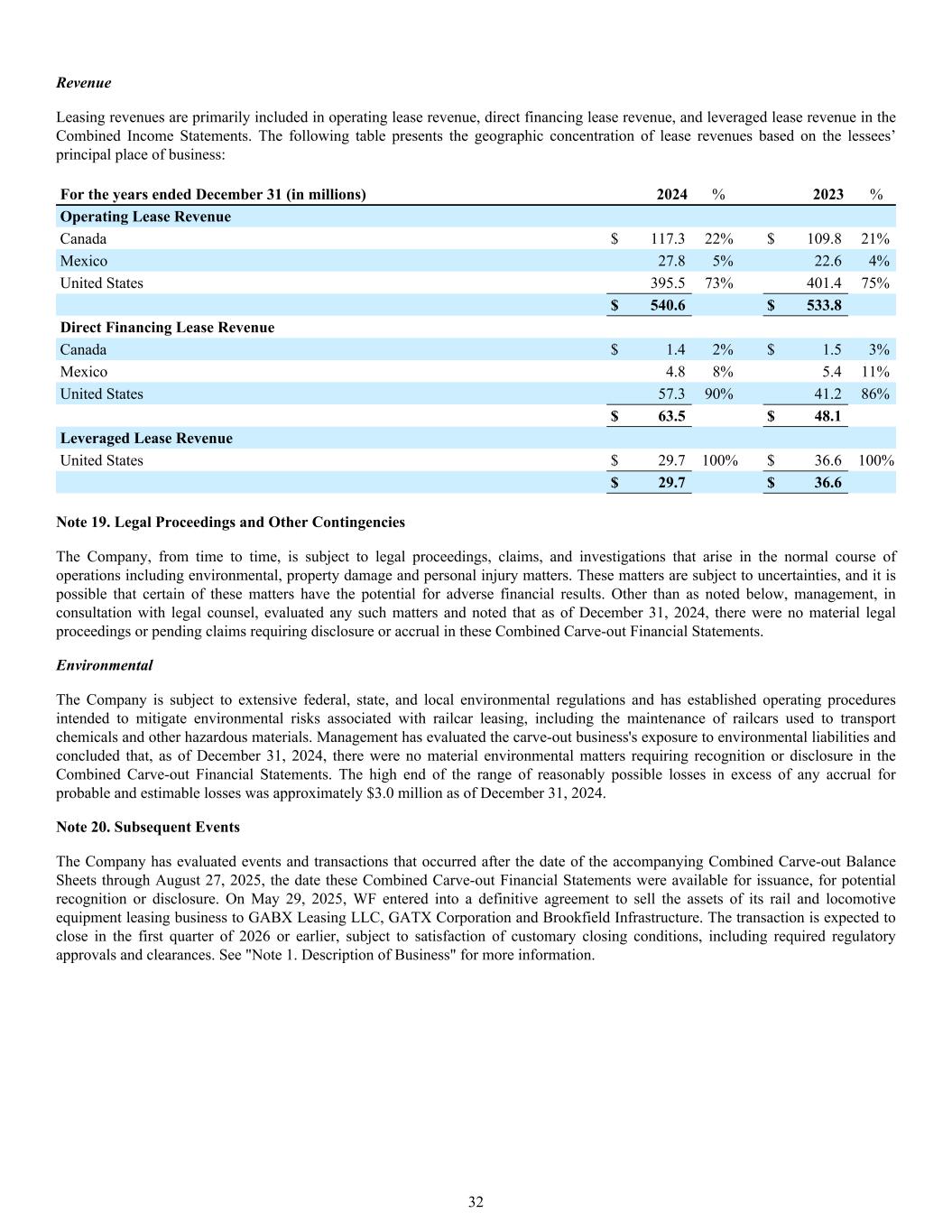 Revenue Leasing revenues are primarily included in operating lease revenue, direct financing lease revenue, and leveraged lease revenue in the Combined Income Statements. The following table presents the geographic concentration of lease revenues based on the lessees’ principal place of business: For the years ended December 31 (in millions) 2024 % 2023 % Operating Lease Revenue Canada $ 117.3 22% $ 109.8 21% Mexico 27.8 5% 22.6 4% United States 395.5 73% 401.4 75% $ 540.6 $ 533.8 Direct Financing Lease Revenue Canada $ 1.4 2% $ 1.5 3% Mexico 4.8 8% 5.4 11% United States 57.3 90% 41.2 86% $ 63.5 $ 48.1 Leveraged Lease Revenue United States $ 29.7 100% $ 36.6 100% $ 29.7 $ 36.6 Note 19. Legal Proceedings and Other Contingencies The Company, from time to time, is subject to legal proceedings, claims, and investigations that arise in the normal course of operations including environmental, property damage and personal injury matters. These matters are subject to uncertainties, and it is possible that certain of these matters have the potential for adverse financial results. Other than as noted below, management, in consultation with legal counsel, evaluated any such matters and noted that as of December 31, 2024, there were no material legal proceedings or pending claims requiring disclosure or accrual in these Combined Carve-out Financial Statements. Environmental The Company is subject to extensive federal, state, and local environmental regulations and has established operating procedures intended to mitigate environmental risks associated with railcar leasing, including the maintenance of railcars used to transport chemicals and other hazardous materials. Management has evaluated the carve-out business's exposure to environmental liabilities and concluded that, as of December 31, 2024, there were no material environmental matters requiring recognition or disclosure in the Combined Carve-out Financial Statements. The high end of the range of reasonably possible losses in excess of any accrual for probable and estimable losses was approximately $3.0 million as of December 31, 2024. Note 20. Subsequent Events The Company has evaluated events and transactions that occurred after the date of the accompanying Combined Carve-out Balance Sheets through August 27, 2025, the date these Combined Carve-out Financial Statements were available for issuance, for potential recognition or disclosure. On May 29, 2025, WF entered into a definitive agreement to sell the assets of its rail and locomotive equipment leasing business to GABX Leasing LLC, GATX Corporation and Brookfield Infrastructure. The transaction is expected to close in the first quarter of 2026 or earlier, subject to satisfaction of customary closing conditions, including required regulatory approvals and clearances. See "Note 1. Description of Business" for more information. 32