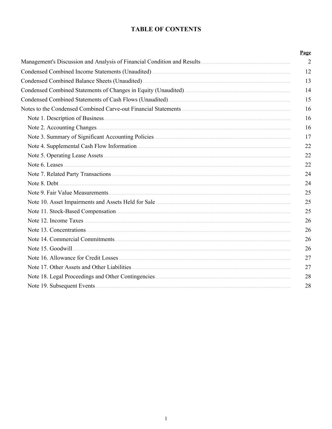 TABLE OF CONTENTS Management's Discussion and Analysis of Financial Condition and Results ............................................................ 2 Condensed Combined Income Statements (Unaudited) ............................................................................................. 12 Condensed Combined Balance Sheets (Unaudited) ................................................................................................... 13 Condensed Combined Statements of Changes in Equity (Unaudited) ....................................................................... 14 Condensed Combined Statements of Cash Flows (Unaudited) .................................................................................. 15 Notes to the Condensed Combined Carve-out Financial Statements ......................................................................... 16 Note 1. Description of Business ............................................................................................................................. 16 Note 2. Accounting Changes .................................................................................................................................. 16 Note 3. Summary of Significant Accounting Policies ........................................................................................... 17 Note 4. Supplemental Cash Flow Information ....................................................................................................... 22 Note 5. Operating Lease Assets ............................................................................................................................. 22 Note 6. Leases ........................................................................................................................................................ 22 Note 7. Related Party Transactions ........................................................................................................................ 24 Note 8. Debt ........................................................................................................................................................... 24 Note 9. Fair Value Measurements .......................................................................................................................... 25 Note 10. Asset Impairments and Assets Held for Sale .......................................................................................... 25 Note 11. Stock-Based Compensation ..................................................................................................................... 25 Note 12. Income Taxes .......................................................................................................................................... 26 Note 13. Concentrations ......................................................................................................................................... 26 Note 14. Commercial Commitments ...................................................................................................................... 26 Note 15. Goodwill .................................................................................................................................................. 26 Note 16. Allowance for Credit Losses ................................................................................................................... 27 Note 17. Other Assets and Other Liabilities .......................................................................................................... 27 Note 18. Legal Proceedings and Other Contingencies ........................................................................................... 28 Note 19. Subsequent Events ................................................................................................................................... 28 Page 1