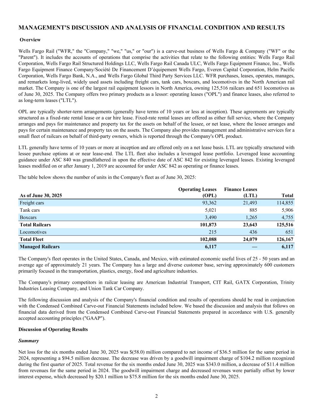 MANAGEMENT'S DISCUSSION AND ANALYSIS OF FINANCIAL CONDITION AND RESULTS Overview Wells Fargo Rail ("WFR," the "Company," "we," "us," or "our") is a carve-out business of Wells Fargo & Company ("WF" or the "Parent"). It includes the accounts of operations that comprise the activities that relate to the following entities: Wells Fargo Rail Corporation, Wells Fargo Rail Structured Holdings LLC, Wells Fargo Rail Canada ULC, Wells Fargo Equipment Finance, Inc., Wells Fargo Equipment Finance Company/Société De Financement D’équipement Wells Fargo, Everen Capital Corporation, Helm Pacific Corporation, Wells Fargo Bank, N.A., and Wells Fargo Global Third Party Services LLC. WFR purchases, leases, operates, manages, and remarkets long-lived, widely used assets including freight cars, tank cars, boxcars, and locomotives in the North American rail market. The Company is one of the largest rail equipment lessors in North America, owning 125,516 railcars and 651 locomotives as of June 30, 2025. The Company offers two primary products as a lessor: operating leases ("OPL") and finance leases, also referred to as long-term leases ("LTL"). OPL are typically shorter-term arrangements (generally have terms of 10 years or less at inception). These agreements are typically structured as a fixed-rate rental lease or a car hire lease. Fixed-rate rental leases are offered as either full service, where the Company arranges and pays for maintenance and property tax for the assets on behalf of the lessee, or net lease, where the lessee arranges and pays for certain maintenance and property tax on the assets. The Company also provides management and administrative services for a small fleet of railcars on behalf of third-party owners, which is reported through the Company's OPL product. LTL generally have terms of 10 years or more at inception and are offered only on a net lease basis. LTL are typically structured with lessee purchase options at or near lease-end. The LTL fleet also includes a leveraged lease portfolio. Leveraged lease accounting guidance under ASC 840 was grandfathered in upon the effective date of ASC 842 for existing leveraged leases. Existing leveraged leases modified on or after January 1, 2019 are accounted for under ASC 842 as operating or finance leases. The table below shows the number of units in the Company's fleet as of June 30, 2025: As of June 30, 2025 Operating Leases (OPL) Finance Leases (LTL) Total Freight cars 93,362 21,493 114,855 Tank cars 5,021 885 5,906 Boxcars 3,490 1,265 4,755 Total Railcars 101,873 23,643 125,516 Locomotives 215 436 651 Total Fleet 102,088 24,079 126,167 Managed Railcars 6,117 — 6,117 The Company's fleet operates in the United States, Canada, and Mexico, with estimated economic useful lives of 25 - 50 years and an average age of approximately 21 years. The Company has a large and diverse customer base, serving approximately 600 customers primarily focused in the transportation, plastics, energy, food and agriculture industries. The Company's primary competitors in railcar leasing are American Industrial Transport, CIT Rail, GATX Corporation, Trinity Industries Leasing Company, and Union Tank Car Company. The following discussion and analysis of the Company's financial condition and results of operations should be read in conjunction with the Condensed Combined Carve-out Financial Statements included below. We based the discussion and analysis that follows on financial data derived from the Condensed Combined Carve-out Financial Statements prepared in accordance with U.S. generally accepted accounting principles ("GAAP"). Discussion of Operating Results Summary Net loss for the six months ended June 30, 2025 was $(58.0) million compared to net income of $36.5 million for the same period in 2024, representing a $94.5 million decrease. The decrease was driven by a goodwill impairment charge of $104.2 million recognized during the first quarter of 2025. Total revenue for the six months ended June 30, 2025 was $343.0 million, a decrease of $11.4 million from revenues for the same period in 2024. The goodwill impairment charge and decreased revenues were partially offset by lower interest expense, which decreased by $20.1 million to $75.8 million for the six months ended June 30, 2025. 2