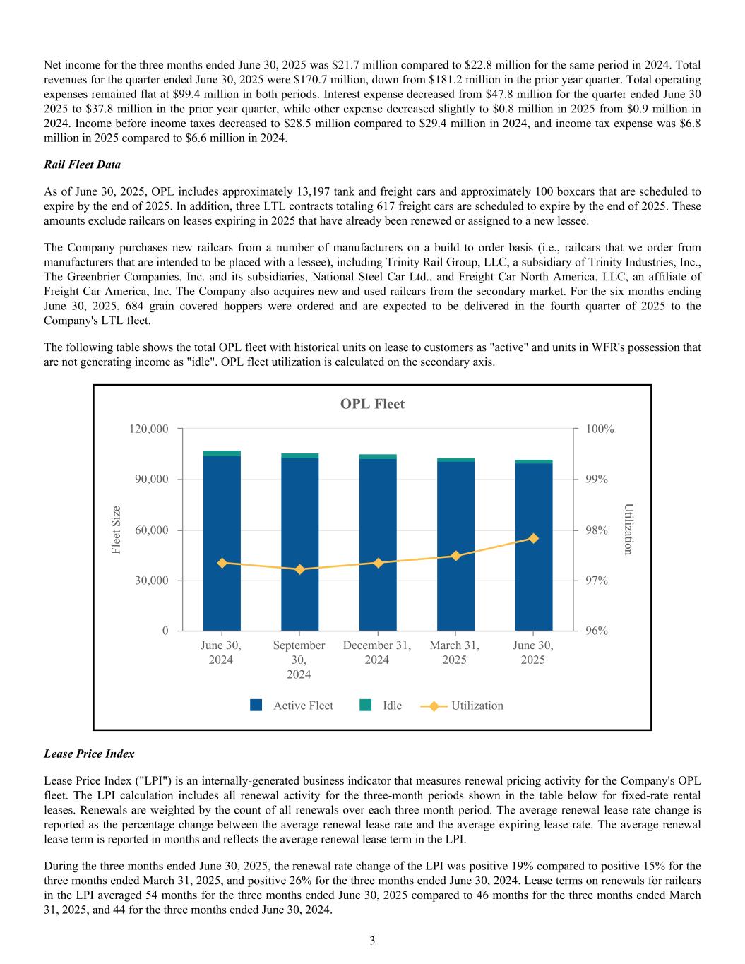 Net income for the three months ended June 30, 2025 was $21.7 million compared to $22.8 million for the same period in 2024. Total revenues for the quarter ended June 30, 2025 were $170.7 million, down from $181.2 million in the prior year quarter. Total operating expenses remained flat at $99.4 million in both periods. Interest expense decreased from $47.8 million for the quarter ended June 30 2025 to $37.8 million in the prior year quarter, while other expense decreased slightly to $0.8 million in 2025 from $0.9 million in 2024. Income before income taxes decreased to $28.5 million compared to $29.4 million in 2024, and income tax expense was $6.8 million in 2025 compared to $6.6 million in 2024. Rail Fleet Data As of June 30, 2025, OPL includes approximately 13,197 tank and freight cars and approximately 100 boxcars that are scheduled to expire by the end of 2025. In addition, three LTL contracts totaling 617 freight cars are scheduled to expire by the end of 2025. These amounts exclude railcars on leases expiring in 2025 that have already been renewed or assigned to a new lessee. The Company purchases new railcars from a number of manufacturers on a build to order basis (i.e., railcars that we order from manufacturers that are intended to be placed with a lessee), including Trinity Rail Group, LLC, a subsidiary of Trinity Industries, Inc., The Greenbrier Companies, Inc. and its subsidiaries, National Steel Car Ltd., and Freight Car North America, LLC, an affiliate of Freight Car America, Inc. The Company also acquires new and used railcars from the secondary market. For the six months ending June 30, 2025, 684 grain covered hoppers were ordered and are expected to be delivered in the fourth quarter of 2025 to the Company's LTL fleet. The following table shows the total OPL fleet with historical units on lease to customers as "active" and units in WFR's possession that are not generating income as "idle". OPL fleet utilization is calculated on the secondary axis. Fl ee t S iz e U tilization OPL Fleet Active Fleet Idle Utilization June 30, 2024 September 30, 2024 December 31, 2024 March 31, 2025 June 30, 2025 0 30,000 60,000 90,000 120,000 96% 97% 98% 99% 100% Lease Price Index Lease Price Index ("LPI") is an internally-generated business indicator that measures renewal pricing activity for the Company's OPL fleet. The LPI calculation includes all renewal activity for the three-month periods shown in the table below for fixed-rate rental leases. Renewals are weighted by the count of all renewals over each three month period. The average renewal lease rate change is reported as the percentage change between the average renewal lease rate and the average expiring lease rate. The average renewal lease term is reported in months and reflects the average renewal lease term in the LPI. During the three months ended June 30, 2025, the renewal rate change of the LPI was positive 19% compared to positive 15% for the three months ended March 31, 2025, and positive 26% for the three months ended June 30, 2024. Lease terms on renewals for railcars in the LPI averaged 54 months for the three months ended June 30, 2025 compared to 46 months for the three months ended March 31, 2025, and 44 for the three months ended June 30, 2024. 3