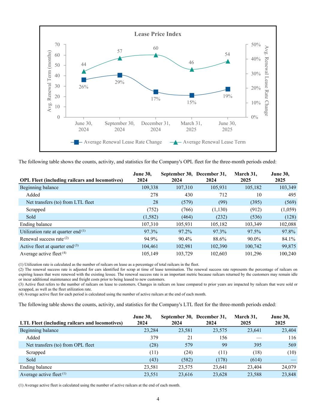 A vg . R en ew al T er m (m on th s) A vg. R enew al Lease R ate C hange Lease Price Index 26% 29% 17% 15% 19% 44 57 60 46 54 Average Renewal Lease Rate Change Average Renewal Lease Term June 30, 2024 September 30, 2024 December 31, 2024 March 31, 2025 June 30, 2025 0 10 20 30 40 50 60 70 0% 10% 20% 30% 40% 50% The following table shows the counts, activity, and statistics for the Company's OPL fleet for the three-month periods ended: OPL Fleet (including railcars and locomotives) June 30, 2024 September 30, 2024 December 31, 2024 March 31, 2025 June 30, 2025 Beginning balance 109,338 107,310 105,931 105,182 103,349 Added 278 430 712 10 495 Net transfers (to) from LTL fleet 28 (579) (99) (395) (569) Scrapped (752) (766) (1,130) (912) (1,059) Sold (1,582) (464) (232) (536) (128) Ending balance 107,310 105,931 105,182 103,349 102,088 Utilization rate at quarter end (1) 97.3% 97.2% 97.3% 97.5% 97.8% Renewal success rate (2) 94.9% 90.4% 88.6% 90.0% 84.1% Active fleet at quarter end (3) 104,461 102,981 102,390 100,742 99,875 Average active fleet (4) 105,149 103,729 102,603 101,296 100,240 (1) Utilization rate is calculated as the number of railcars on lease as a percentage of total railcars in the fleet. (2) The renewal success rate is adjusted for cars identified for scrap at time of lease termination. The renewal success rate represents the percentage of railcars on expiring leases that were renewed with the existing lessee. The renewal success rate is an important metric because railcars returned by the customers may remain idle or incur additional maintenance and freight costs prior to being leased to new customers. (3) Active fleet refers to the number of railcars on lease to customers. Changes in railcars on lease compared to prior years are impacted by railcars that were sold or scrapped, as well as the fleet utilization rate. (4) Average active fleet for each period is calculated using the number of active railcars at the end of each month. The following table shows the counts, activity, and statistics for the Company's LTL fleet for the three-month periods ended: LTL Fleet (including railcars and locomotives) June 30, 2024 September 30, 2024 December 31, 2024 March 31, 2025 June 30, 2025 Beginning balance 23,284 23,581 23,575 23,641 23,404 Added 379 21 156 — 116 Net transfers (to) from OPL fleet (28) 579 99 395 569 Scrapped (11) (24) (11) (18) (10) Sold (43) (582) (178) (614) — Ending balance 23,581 23,575 23,641 23,404 24,079 Average active fleet (1) 23,551 23,616 23,628 23,588 23,848 (1) Average active fleet is calculated using the number of active railcars at the end of each month. 4
