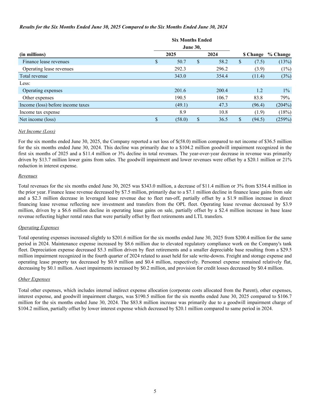 Results for the Six Months Ended June 30, 2025 Compared to the Six Months Ended June 30, 2024 Six Months Ended June 30, (in millions) 2025 2024 $ Change % Change Finance lease revenues $ 50.7 $ 58.2 $ (7.5) (13%) Operating lease revenues 292.3 296.2 (3.9) (1%) Total revenue 343.0 354.4 (11.4) (3%) Less: Operating expenses 201.6 200.4 1.2 1% Other expenses 190.5 106.7 83.8 79% Income (loss) before income taxes (49.1) 47.3 (96.4) (204%) Income tax expense 8.9 10.8 (1.9) (18%) Net income (loss) $ (58.0) $ 36.5 $ (94.5) (259%) Net Income (Loss) For the six months ended June 30, 2025, the Company reported a net loss of $(58.0) million compared to net income of $36.5 million for the six months ended June 30, 2024. This decline was primarily due to a $104.2 million goodwill impairment recognized in the first six months of 2025 and a $11.4 million or 3% decline in total revenues. The year-over-year decrease in revenue was primarily driven by $13.7 million lower gains from sales. The goodwill impairment and lower revenues were offset by a $20.1 million or 21% reduction in interest expense. Revenues Total revenues for the six months ended June 30, 2025 was $343.0 million, a decrease of $11.4 million or 3% from $354.4 million in the prior year. Finance lease revenue decreased by $7.5 million, primarily due to a $7.1 million decline in finance lease gains from sale and a $2.3 million decrease in leveraged lease revenue due to fleet run-off, partially offset by a $1.9 million increase in direct financing lease revenue reflecting new investment and transfers from the OPL fleet. Operating lease revenue decreased by $3.9 million, driven by a $6.6 million decline in operating lease gains on sale, partially offset by a $2.4 million increase in base lease revenue reflecting higher rental rates that were partially offset by fleet retirements and LTL transfers. Operating Expenses Total operating expenses increased slightly to $201.6 million for the six months ended June 30, 2025 from $200.4 million for the same period in 2024. Maintenance expense increased by $8.6 million due to elevated regulatory compliance work on the Company's tank fleet. Depreciation expense decreased $5.3 million driven by fleet retirements and a smaller depreciable base resulting from a $29.5 million impairment recognized in the fourth quarter of 2024 related to asset held for sale write-downs. Freight and storage expense and operating lease property tax decreased by $0.9 million and $0.4 million, respectively. Personnel expense remained relatively flat, decreasing by $0.1 million. Asset impairments increased by $0.2 million, and provision for credit losses decreased by $0.4 million. Other Expenses Total other expenses, which includes internal indirect expense allocation (corporate costs allocated from the Parent), other expenses, interest expense, and goodwill impairment charges, was $190.5 million for the six months ended June 30, 2025 compared to $106.7 million for the six months ended June 30, 2024. The $83.8 million increase was primarily due to a goodwill impairment charge of $104.2 million, partially offset by lower interest expense which decreased by $20.1 million compared to same period in 2024. 5