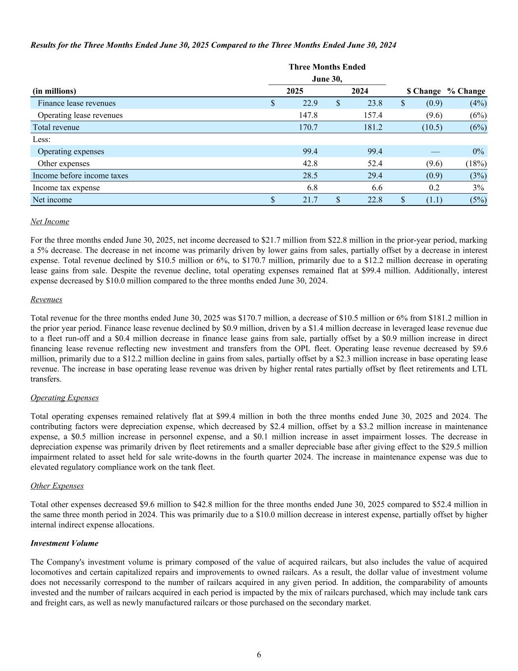 Results for the Three Months Ended June 30, 2025 Compared to the Three Months Ended June 30, 2024 Three Months Ended June 30, (in millions) 2025 2024 $ Change % Change Finance lease revenues $ 22.9 $ 23.8 $ (0.9) (4%) Operating lease revenues 147.8 157.4 (9.6) (6%) Total revenue 170.7 181.2 (10.5) (6%) Less: Operating expenses 99.4 99.4 — 0% Other expenses 42.8 52.4 (9.6) (18%) Income before income taxes 28.5 29.4 (0.9) (3%) Income tax expense 6.8 6.6 0.2 3% Net income $ 21.7 $ 22.8 $ (1.1) (5%) Net Income For the three months ended June 30, 2025, net income decreased to $21.7 million from $22.8 million in the prior-year period, marking a 5% decrease. The decrease in net income was primarily driven by lower gains from sales, partially offset by a decrease in interest expense. Total revenue declined by $10.5 million or 6%, to $170.7 million, primarily due to a $12.2 million decrease in operating lease gains from sale. Despite the revenue decline, total operating expenses remained flat at $99.4 million. Additionally, interest expense decreased by $10.0 million compared to the three months ended June 30, 2024. Revenues Total revenue for the three months ended June 30, 2025 was $170.7 million, a decrease of $10.5 million or 6% from $181.2 million in the prior year period. Finance lease revenue declined by $0.9 million, driven by a $1.4 million decrease in leveraged lease revenue due to a fleet run-off and a $0.4 million decrease in finance lease gains from sale, partially offset by a $0.9 million increase in direct financing lease revenue reflecting new investment and transfers from the OPL fleet. Operating lease revenue decreased by $9.6 million, primarily due to a $12.2 million decline in gains from sales, partially offset by a $2.3 million increase in base operating lease revenue. The increase in base operating lease revenue was driven by higher rental rates partially offset by fleet retirements and LTL transfers. Operating Expenses Total operating expenses remained relatively flat at $99.4 million in both the three months ended June 30, 2025 and 2024. The contributing factors were depreciation expense, which decreased by $2.4 million, offset by a $3.2 million increase in maintenance expense, a $0.5 million increase in personnel expense, and a $0.1 million increase in asset impairment losses. The decrease in depreciation expense was primarily driven by fleet retirements and a smaller depreciable base after giving effect to the $29.5 million impairment related to asset held for sale write-downs in the fourth quarter 2024. The increase in maintenance expense was due to elevated regulatory compliance work on the tank fleet. Other Expenses Total other expenses decreased $9.6 million to $42.8 million for the three months ended June 30, 2025 compared to $52.4 million in the same three month period in 2024. This was primarily due to a $10.0 million decrease in interest expense, partially offset by higher internal indirect expense allocations. Investment Volume The Company's investment volume is primary composed of the value of acquired railcars, but also includes the value of acquired locomotives and certain capitalized repairs and improvements to owned railcars. As a result, the dollar value of investment volume does not necessarily correspond to the number of railcars acquired in any given period. In addition, the comparability of amounts invested and the number of railcars acquired in each period is impacted by the mix of railcars purchased, which may include tank cars and freight cars, as well as newly manufactured railcars or those purchased on the secondary market. 6