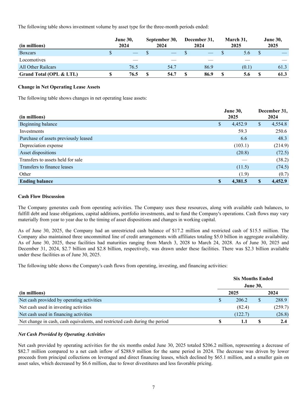 The following table shows investment volume by asset type for the three-month periods ended: (in millions) June 30, 2024 September 30, 2024 December 31, 2024 March 31, 2025 June 30, 2025 Boxcars $ — $ — $ — $ 5.6 $ — Locomotives — — — — — All Other Railcars 76.5 54.7 86.9 (0.1) 61.3 Grand Total (OPL & LTL) $ 76.5 $ 54.7 $ 86.9 $ 5.6 $ 61.3 Change in Net Operating Lease Assets The following table shows changes in net operating lease assets: (in millions) June 30, 2025 December 31, 2024 Beginning balance $ 4,452.9 $ 4,554.8 Investments 59.3 250.6 Purchase of assets previously leased 6.6 48.3 Depreciation expense (103.1) (214.9) Asset dispositions (20.8) (72.5) Transfers to assets held for sale — (38.2) Transfers to finance leases (11.5) (74.5) Other (1.9) (0.7) Ending balance $ 4,381.5 $ 4,452.9 Cash Flow Discussion The Company generates cash from operating activities. The Company uses these resources, along with available cash balances, to fulfill debt and lease obligations, capital additions, portfolio investments, and to fund the Company's operations. Cash flows may vary materially from year to year due to the timing of asset dispositions and changes in working capital. As of June 30, 2025, the Company had an unrestricted cash balance of $17.2 million and restricted cash of $15.5 million. The Company also maintained three uncommitted line of credit arrangements with affiliates totaling $5.0 billion in aggregate availability. As of June 30, 2025, these facilities had maturities ranging from March 3, 2028 to March 24, 2028. As of June 30, 2025 and December 31, 2024, $2.7 billion and $2.8 billion, respectively, was drawn under these facilities. There was $2.3 billion available under these facilities as of June 30, 2025. The following table shows the Company's cash flows from operating, investing, and financing activities: Six Months Ended June 30, (in millions) 2025 2024 Net cash provided by operating activities $ 206.2 $ 288.9 Net cash used in investing activities (82.4) (259.7) Net cash used in financing activities (122.7) (26.8) Net change in cash, cash equivalents, and restricted cash during the period $ 1.1 $ 2.4 Net Cash Provided by Operating Activities Net cash provided by operating activities for the six months ended June 30, 2025 totaled $206.2 million, representing a decrease of $82.7 million compared to a net cash inflow of $288.9 million for the same period in 2024. The decrease was driven by lower proceeds from principal collections on leveraged and direct financing leases, which declined by $65.1 million, and a smaller gain on asset sales, which decreased by $6.6 million, due to fewer divestitures and less favorable pricing. 7