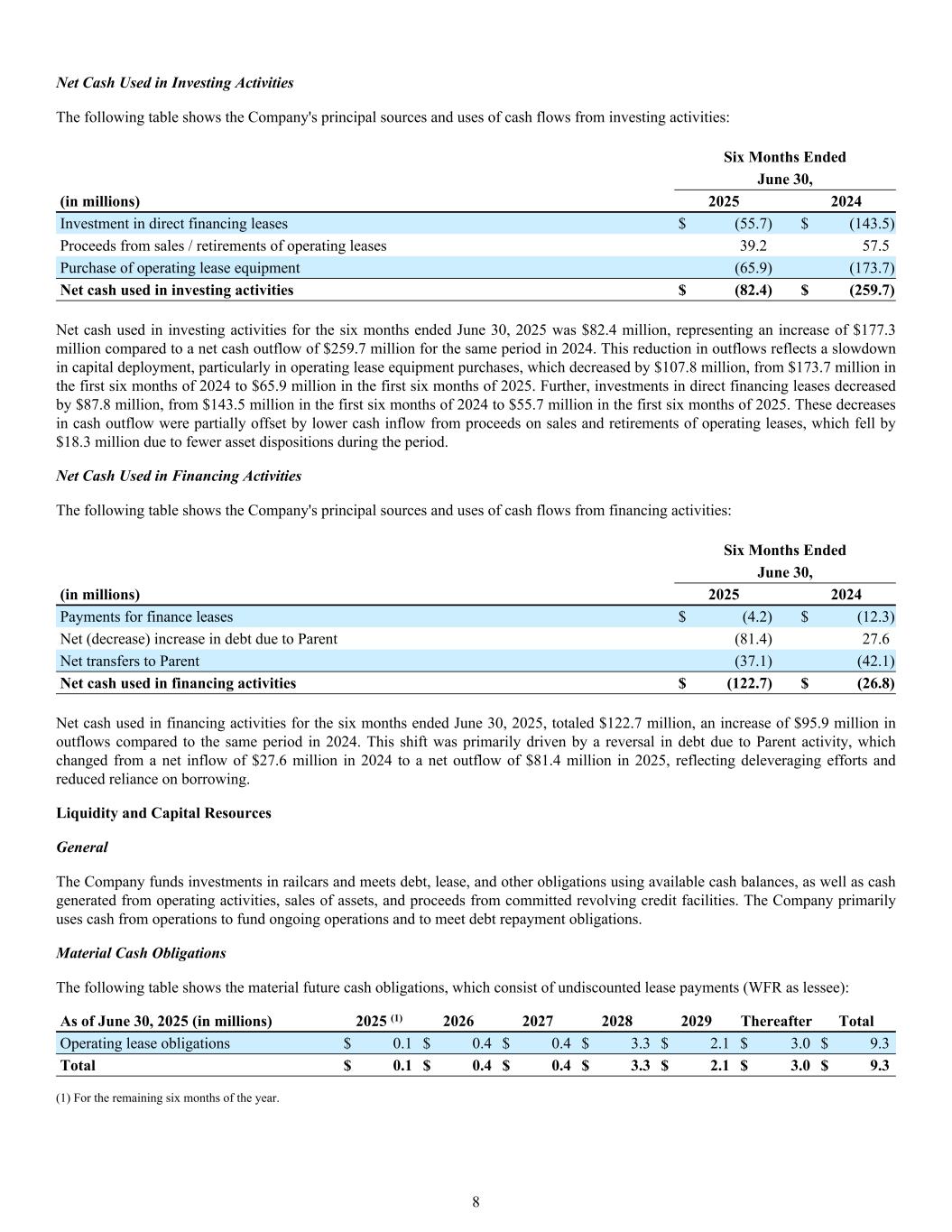 Net Cash Used in Investing Activities The following table shows the Company's principal sources and uses of cash flows from investing activities: Six Months Ended June 30, (in millions) 2025 2024 Investment in direct financing leases $ (55.7) $ (143.5) Proceeds from sales / retirements of operating leases 39.2 57.5 Purchase of operating lease equipment (65.9) (173.7) Net cash used in investing activities $ (82.4) $ (259.7) Net cash used in investing activities for the six months ended June 30, 2025 was $82.4 million, representing an increase of $177.3 million compared to a net cash outflow of $259.7 million for the same period in 2024. This reduction in outflows reflects a slowdown in capital deployment, particularly in operating lease equipment purchases, which decreased by $107.8 million, from $173.7 million in the first six months of 2024 to $65.9 million in the first six months of 2025. Further, investments in direct financing leases decreased by $87.8 million, from $143.5 million in the first six months of 2024 to $55.7 million in the first six months of 2025. These decreases in cash outflow were partially offset by lower cash inflow from proceeds on sales and retirements of operating leases, which fell by $18.3 million due to fewer asset dispositions during the period. Net Cash Used in Financing Activities The following table shows the Company's principal sources and uses of cash flows from financing activities: Six Months Ended June 30, (in millions) 2025 2024 Payments for finance leases $ (4.2) $ (12.3) Net (decrease) increase in debt due to Parent (81.4) 27.6 Net transfers to Parent (37.1) (42.1) Net cash used in financing activities $ (122.7) $ (26.8) Net cash used in financing activities for the six months ended June 30, 2025, totaled $122.7 million, an increase of $95.9 million in outflows compared to the same period in 2024. This shift was primarily driven by a reversal in debt due to Parent activity, which changed from a net inflow of $27.6 million in 2024 to a net outflow of $81.4 million in 2025, reflecting deleveraging efforts and reduced reliance on borrowing. Liquidity and Capital Resources General The Company funds investments in railcars and meets debt, lease, and other obligations using available cash balances, as well as cash generated from operating activities, sales of assets, and proceeds from committed revolving credit facilities. The Company primarily uses cash from operations to fund ongoing operations and to meet debt repayment obligations. Material Cash Obligations The following table shows the material future cash obligations, which consist of undiscounted lease payments (WFR as lessee): As of June 30, 2025 (in millions) 2025 (1) 2026 2027 2028 2029 Thereafter Total Operating lease obligations $ 0.1 $ 0.4 $ 0.4 $ 3.3 $ 2.1 $ 3.0 $ 9.3 Total $ 0.1 $ 0.4 $ 0.4 $ 3.3 $ 2.1 $ 3.0 $ 9.3 (1) For the remaining six months of the year. 8