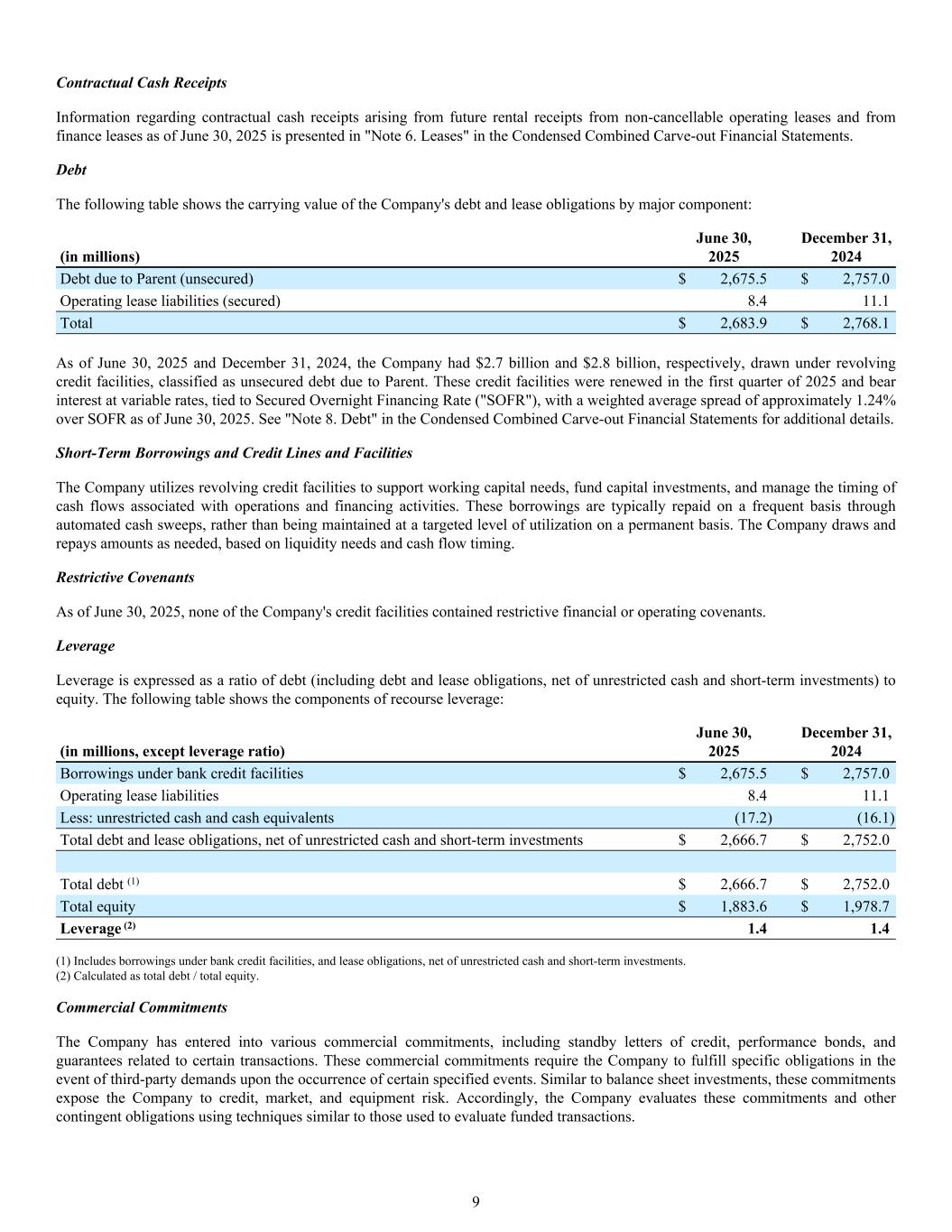 Contractual Cash Receipts Information regarding contractual cash receipts arising from future rental receipts from non-cancellable operating leases and from finance leases as of June 30, 2025 is presented in "Note 6. Leases" in the Condensed Combined Carve-out Financial Statements. Debt The following table shows the carrying value of the Company's debt and lease obligations by major component: (in millions) June 30, 2025 December 31, 2024 Debt due to Parent (unsecured) $ 2,675.5 $ 2,757.0 Operating lease liabilities (secured) 8.4 11.1 Total $ 2,683.9 $ 2,768.1 As of June 30, 2025 and December 31, 2024, the Company had $2.7 billion and $2.8 billion, respectively, drawn under revolving credit facilities, classified as unsecured debt due to Parent. These credit facilities were renewed in the first quarter of 2025 and bear interest at variable rates, tied to Secured Overnight Financing Rate ("SOFR"), with a weighted average spread of approximately 1.24% over SOFR as of June 30, 2025. See "Note 8. Debt" in the Condensed Combined Carve-out Financial Statements for additional details. Short-Term Borrowings and Credit Lines and Facilities The Company utilizes revolving credit facilities to support working capital needs, fund capital investments, and manage the timing of cash flows associated with operations and financing activities. These borrowings are typically repaid on a frequent basis through automated cash sweeps, rather than being maintained at a targeted level of utilization on a permanent basis. The Company draws and repays amounts as needed, based on liquidity needs and cash flow timing. Restrictive Covenants As of June 30, 2025, none of the Company's credit facilities contained restrictive financial or operating covenants. Leverage Leverage is expressed as a ratio of debt (including debt and lease obligations, net of unrestricted cash and short-term investments) to equity. The following table shows the components of recourse leverage: (in millions, except leverage ratio) June 30, 2025 December 31, 2024 Borrowings under bank credit facilities $ 2,675.5 $ 2,757.0 Operating lease liabilities 8.4 11.1 Less: unrestricted cash and cash equivalents (17.2) (16.1) Total debt and lease obligations, net of unrestricted cash and short-term investments $ 2,666.7 $ 2,752.0 Total debt (1) $ 2,666.7 $ 2,752.0 Total equity $ 1,883.6 $ 1,978.7 Leverage (2) 1.4 1.4 (1) Includes borrowings under bank credit facilities, and lease obligations, net of unrestricted cash and short-term investments. (2) Calculated as total debt / total equity. Commercial Commitments The Company has entered into various commercial commitments, including standby letters of credit, performance bonds, and guarantees related to certain transactions. These commercial commitments require the Company to fulfill specific obligations in the event of third-party demands upon the occurrence of certain specified events. Similar to balance sheet investments, these commitments expose the Company to credit, market, and equipment risk. Accordingly, the Company evaluates these commitments and other contingent obligations using techniques similar to those used to evaluate funded transactions. 9