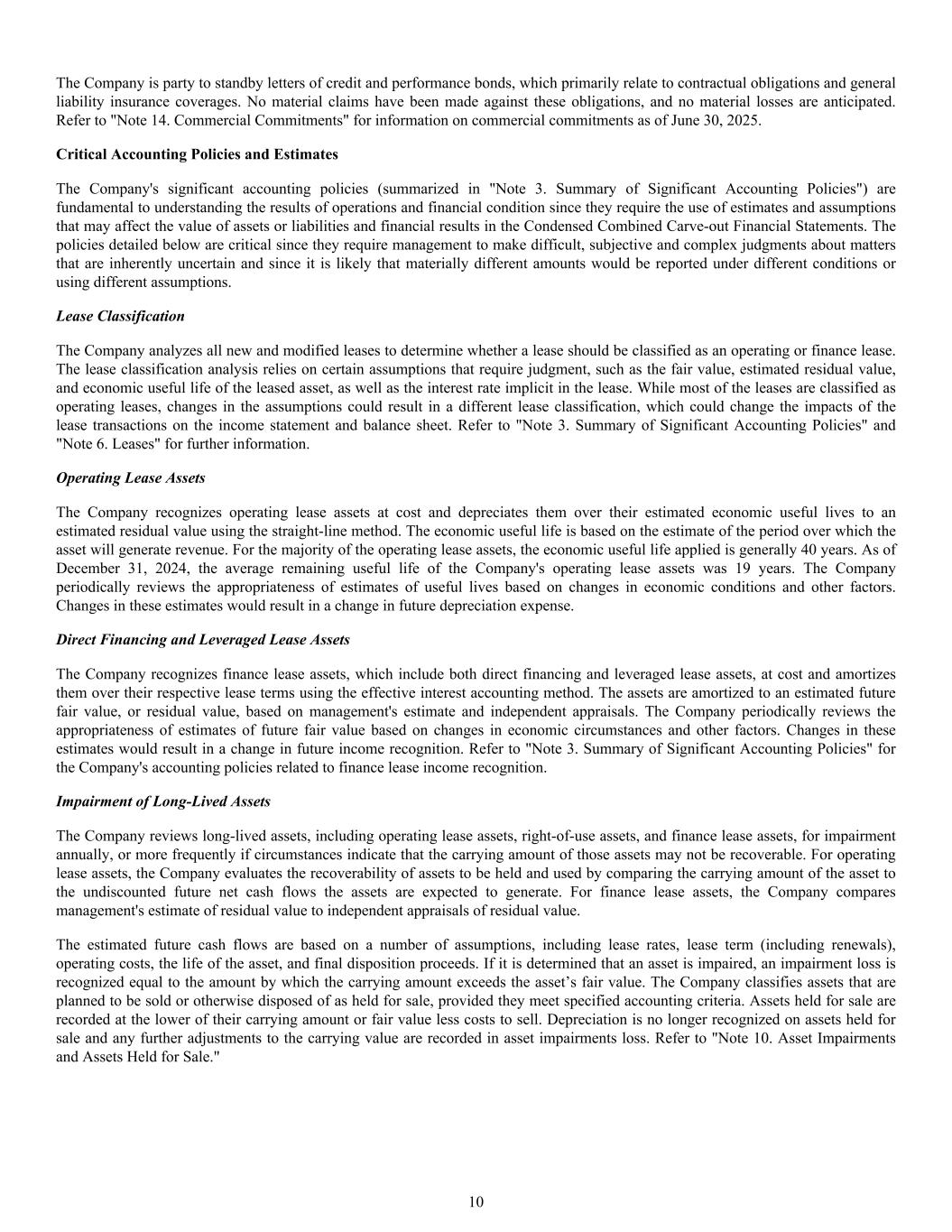 The Company is party to standby letters of credit and performance bonds, which primarily relate to contractual obligations and general liability insurance coverages. No material claims have been made against these obligations, and no material losses are anticipated. Refer to "Note 14. Commercial Commitments" for information on commercial commitments as of June 30, 2025. Critical Accounting Policies and Estimates The Company's significant accounting policies (summarized in "Note 3. Summary of Significant Accounting Policies") are fundamental to understanding the results of operations and financial condition since they require the use of estimates and assumptions that may affect the value of assets or liabilities and financial results in the Condensed Combined Carve-out Financial Statements. The policies detailed below are critical since they require management to make difficult, subjective and complex judgments about matters that are inherently uncertain and since it is likely that materially different amounts would be reported under different conditions or using different assumptions. Lease Classification The Company analyzes all new and modified leases to determine whether a lease should be classified as an operating or finance lease. The lease classification analysis relies on certain assumptions that require judgment, such as the fair value, estimated residual value, and economic useful life of the leased asset, as well as the interest rate implicit in the lease. While most of the leases are classified as operating leases, changes in the assumptions could result in a different lease classification, which could change the impacts of the lease transactions on the income statement and balance sheet. Refer to "Note 3. Summary of Significant Accounting Policies" and "Note 6. Leases" for further information. Operating Lease Assets The Company recognizes operating lease assets at cost and depreciates them over their estimated economic useful lives to an estimated residual value using the straight-line method. The economic useful life is based on the estimate of the period over which the asset will generate revenue. For the majority of the operating lease assets, the economic useful life applied is generally 40 years. As of December 31, 2024, the average remaining useful life of the Company's operating lease assets was 19 years. The Company periodically reviews the appropriateness of estimates of useful lives based on changes in economic conditions and other factors. Changes in these estimates would result in a change in future depreciation expense. Direct Financing and Leveraged Lease Assets The Company recognizes finance lease assets, which include both direct financing and leveraged lease assets, at cost and amortizes them over their respective lease terms using the effective interest accounting method. The assets are amortized to an estimated future fair value, or residual value, based on management's estimate and independent appraisals. The Company periodically reviews the appropriateness of estimates of future fair value based on changes in economic circumstances and other factors. Changes in these estimates would result in a change in future income recognition. Refer to "Note 3. Summary of Significant Accounting Policies" for the Company's accounting policies related to finance lease income recognition. Impairment of Long-Lived Assets The Company reviews long-lived assets, including operating lease assets, right-of-use assets, and finance lease assets, for impairment annually, or more frequently if circumstances indicate that the carrying amount of those assets may not be recoverable. For operating lease assets, the Company evaluates the recoverability of assets to be held and used by comparing the carrying amount of the asset to the undiscounted future net cash flows the assets are expected to generate. For finance lease assets, the Company compares management's estimate of residual value to independent appraisals of residual value. The estimated future cash flows are based on a number of assumptions, including lease rates, lease term (including renewals), operating costs, the life of the asset, and final disposition proceeds. If it is determined that an asset is impaired, an impairment loss is recognized equal to the amount by which the carrying amount exceeds the asset’s fair value. The Company classifies assets that are planned to be sold or otherwise disposed of as held for sale, provided they meet specified accounting criteria. Assets held for sale are recorded at the lower of their carrying amount or fair value less costs to sell. Depreciation is no longer recognized on assets held for sale and any further adjustments to the carrying value are recorded in asset impairments loss. Refer to "Note 10. Asset Impairments and Assets Held for Sale." 10