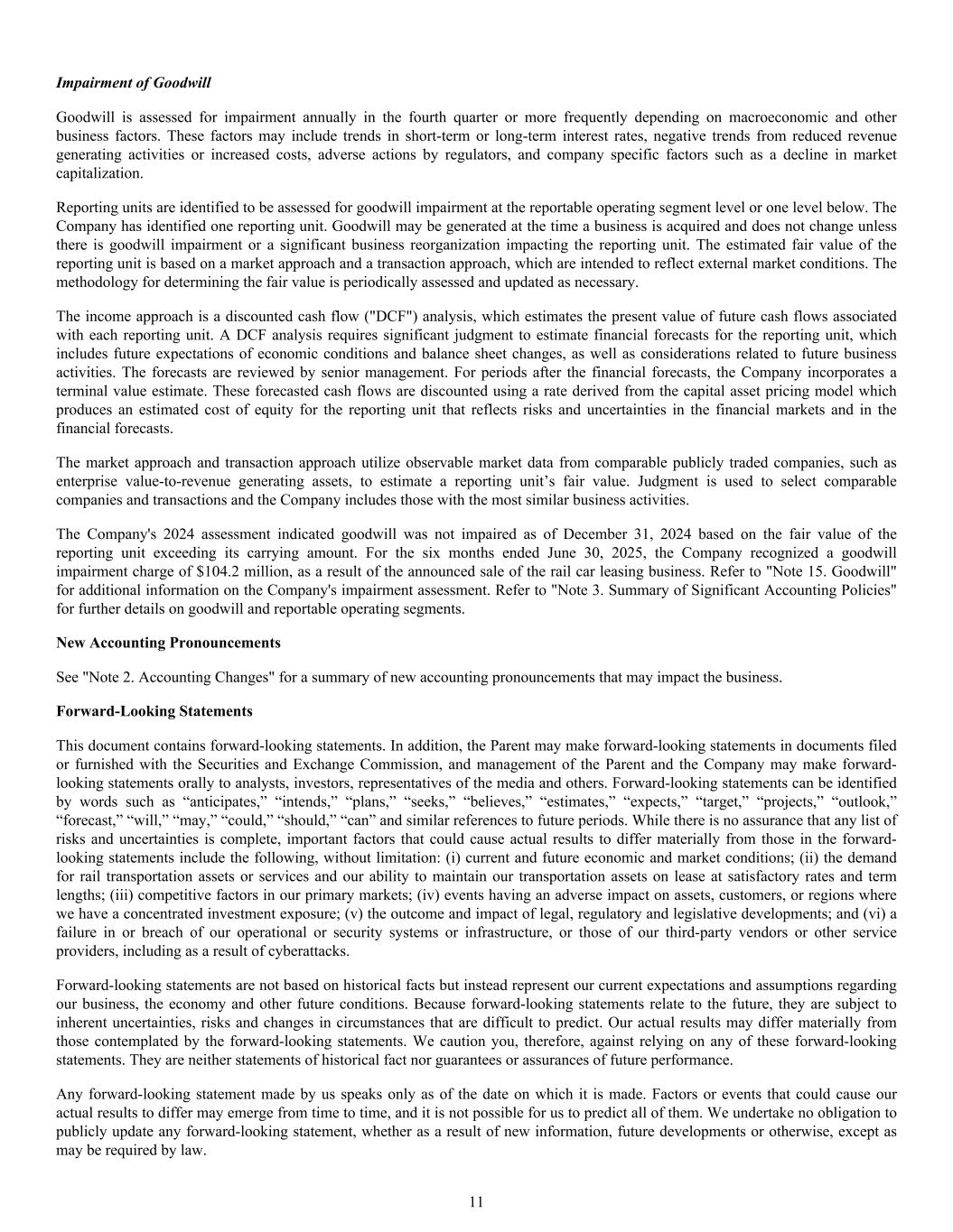 Impairment of Goodwill Goodwill is assessed for impairment annually in the fourth quarter or more frequently depending on macroeconomic and other business factors. These factors may include trends in short-term or long-term interest rates, negative trends from reduced revenue generating activities or increased costs, adverse actions by regulators, and company specific factors such as a decline in market capitalization. Reporting units are identified to be assessed for goodwill impairment at the reportable operating segment level or one level below. The Company has identified one reporting unit. Goodwill may be generated at the time a business is acquired and does not change unless there is goodwill impairment or a significant business reorganization impacting the reporting unit. The estimated fair value of the reporting unit is based on a market approach and a transaction approach, which are intended to reflect external market conditions. The methodology for determining the fair value is periodically assessed and updated as necessary. The income approach is a discounted cash flow ("DCF") analysis, which estimates the present value of future cash flows associated with each reporting unit. A DCF analysis requires significant judgment to estimate financial forecasts for the reporting unit, which includes future expectations of economic conditions and balance sheet changes, as well as considerations related to future business activities. The forecasts are reviewed by senior management. For periods after the financial forecasts, the Company incorporates a terminal value estimate. These forecasted cash flows are discounted using a rate derived from the capital asset pricing model which produces an estimated cost of equity for the reporting unit that reflects risks and uncertainties in the financial markets and in the financial forecasts. The market approach and transaction approach utilize observable market data from comparable publicly traded companies, such as enterprise value-to-revenue generating assets, to estimate a reporting unit’s fair value. Judgment is used to select comparable companies and transactions and the Company includes those with the most similar business activities. The Company's 2024 assessment indicated goodwill was not impaired as of December 31, 2024 based on the fair value of the reporting unit exceeding its carrying amount. For the six months ended June 30, 2025, the Company recognized a goodwill impairment charge of $104.2 million, as a result of the announced sale of the rail car leasing business. Refer to "Note 15. Goodwill" for additional information on the Company's impairment assessment. Refer to "Note 3. Summary of Significant Accounting Policies" for further details on goodwill and reportable operating segments. New Accounting Pronouncements See "Note 2. Accounting Changes" for a summary of new accounting pronouncements that may impact the business. Forward-Looking Statements This document contains forward-looking statements. In addition, the Parent may make forward-looking statements in documents filed or furnished with the Securities and Exchange Commission, and management of the Parent and the Company may make forward- looking statements orally to analysts, investors, representatives of the media and others. Forward-looking statements can be identified by words such as “anticipates,” “intends,” “plans,” “seeks,” “believes,” “estimates,” “expects,” “target,” “projects,” “outlook,” “forecast,” “will,” “may,” “could,” “should,” “can” and similar references to future periods. While there is no assurance that any list of risks and uncertainties is complete, important factors that could cause actual results to differ materially from those in the forward- looking statements include the following, without limitation: (i) current and future economic and market conditions; (ii) the demand for rail transportation assets or services and our ability to maintain our transportation assets on lease at satisfactory rates and term lengths; (iii) competitive factors in our primary markets; (iv) events having an adverse impact on assets, customers, or regions where we have a concentrated investment exposure; (v) the outcome and impact of legal, regulatory and legislative developments; and (vi) a failure in or breach of our operational or security systems or infrastructure, or those of our third-party vendors or other service providers, including as a result of cyberattacks. Forward-looking statements are not based on historical facts but instead represent our current expectations and assumptions regarding our business, the economy and other future conditions. Because forward-looking statements relate to the future, they are subject to inherent uncertainties, risks and changes in circumstances that are difficult to predict. Our actual results may differ materially from those contemplated by the forward-looking statements. We caution you, therefore, against relying on any of these forward-looking statements. They are neither statements of historical fact nor guarantees or assurances of future performance. Any forward-looking statement made by us speaks only as of the date on which it is made. Factors or events that could cause our actual results to differ may emerge from time to time, and it is not possible for us to predict all of them. We undertake no obligation to publicly update any forward-looking statement, whether as a result of new information, future developments or otherwise, except as may be required by law. 11