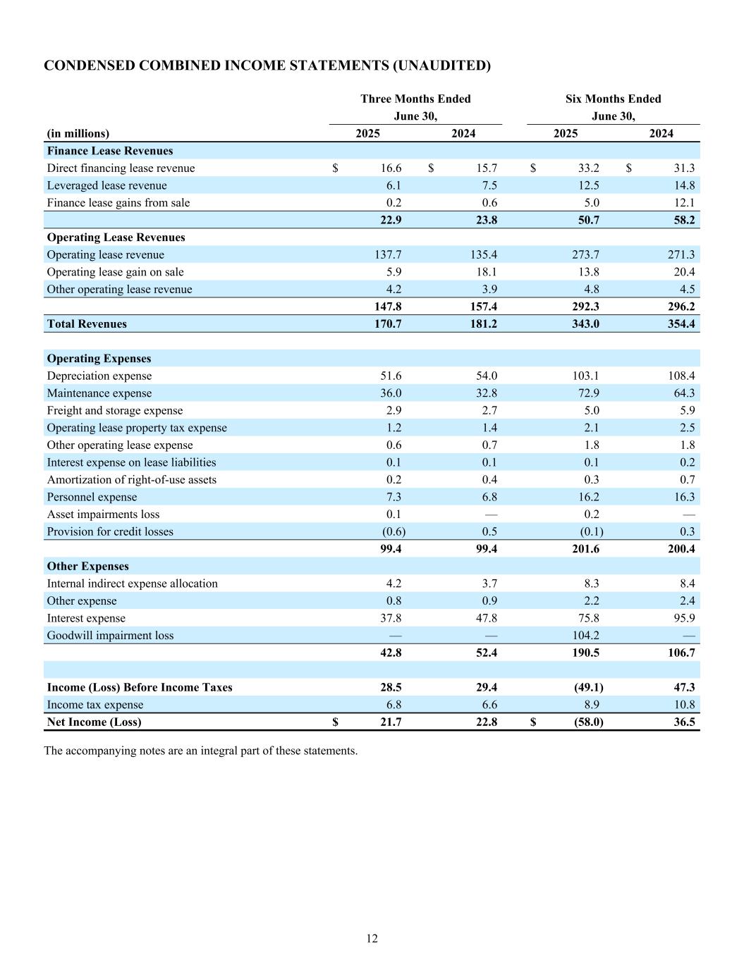 CONDENSED COMBINED INCOME STATEMENTS (UNAUDITED) Three Months Ended Six Months Ended June 30, June 30, (in millions) 2025 2024 2025 2024 Finance Lease Revenues Direct financing lease revenue $ 16.6 $ 15.7 $ 33.2 $ 31.3 Leveraged lease revenue 6.1 7.5 12.5 14.8 Finance lease gains from sale 0.2 0.6 5.0 12.1 22.9 23.8 50.7 58.2 Operating Lease Revenues Operating lease revenue 137.7 135.4 273.7 271.3 Operating lease gain on sale 5.9 18.1 13.8 20.4 Other operating lease revenue 4.2 3.9 4.8 4.5 147.8 157.4 292.3 296.2 Total Revenues 170.7 181.2 343.0 354.4 Operating Expenses Depreciation expense 51.6 54.0 103.1 108.4 Maintenance expense 36.0 32.8 72.9 64.3 Freight and storage expense 2.9 2.7 5.0 5.9 Operating lease property tax expense 1.2 1.4 2.1 2.5 Other operating lease expense 0.6 0.7 1.8 1.8 Interest expense on lease liabilities 0.1 0.1 0.1 0.2 Amortization of right-of-use assets 0.2 0.4 0.3 0.7 Personnel expense 7.3 6.8 16.2 16.3 Asset impairments loss 0.1 — 0.2 — Provision for credit losses (0.6) 0.5 (0.1) 0.3 99.4 99.4 201.6 200.4 Other Expenses Internal indirect expense allocation 4.2 3.7 8.3 8.4 Other expense 0.8 0.9 2.2 2.4 Interest expense 37.8 47.8 75.8 95.9 Goodwill impairment loss — — 104.2 — 42.8 52.4 190.5 106.7 Income (Loss) Before Income Taxes 28.5 29.4 (49.1) 47.3 Income tax expense 6.8 6.6 8.9 10.8 Net Income (Loss) $ 21.7 22.8 $ (58.0) 36.5 The accompanying notes are an integral part of these statements. 12