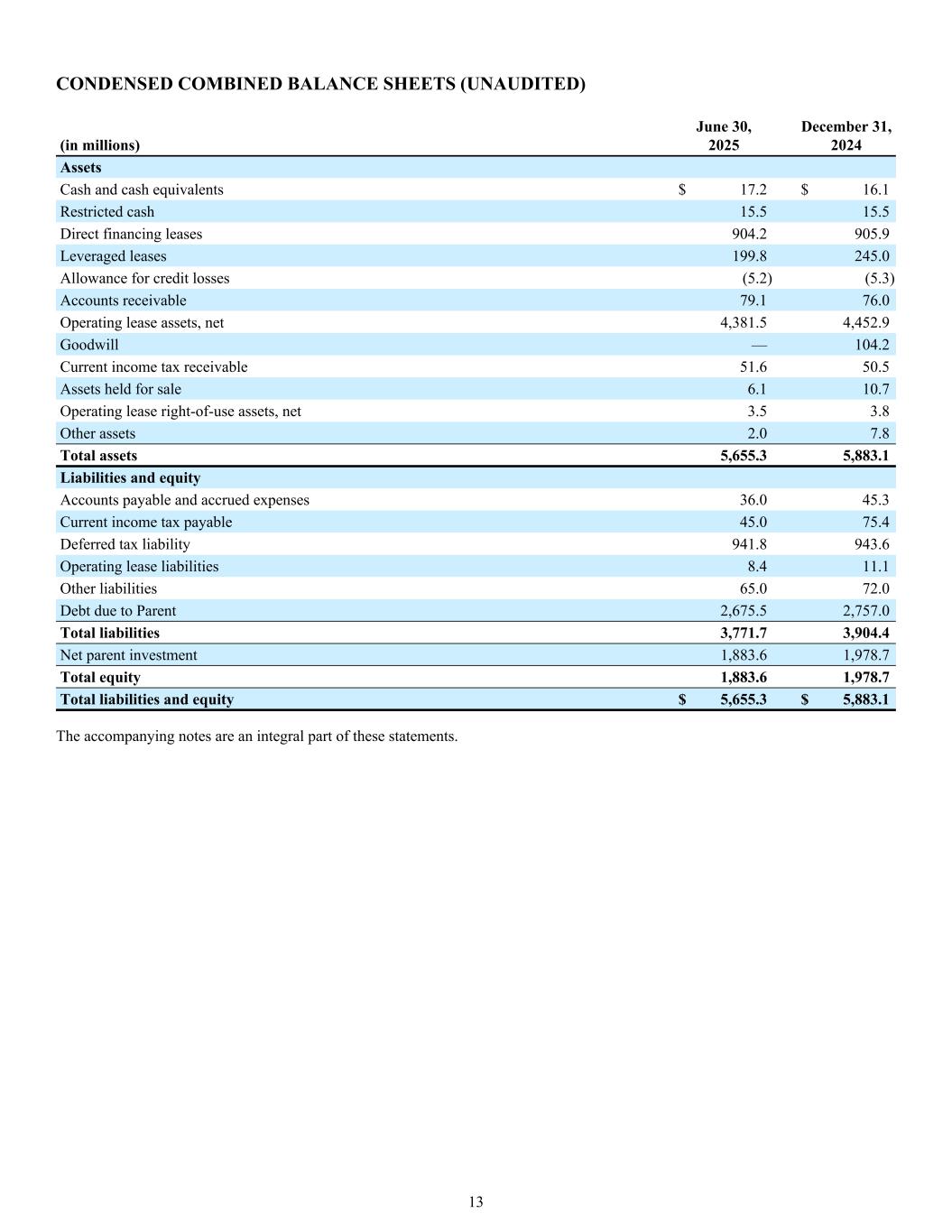 CONDENSED COMBINED BALANCE SHEETS (UNAUDITED) Assets Cash and cash equivalents $ 17.2 $ 16.1 Restricted cash 15.5 15.5 Direct financing leases 904.2 905.9 Leveraged leases 199.8 245.0 Allowance for credit losses (5.2) (5.3) Accounts receivable 79.1 76.0 Operating lease assets, net 4,381.5 4,452.9 Goodwill — 104.2 Current income tax receivable 51.6 50.5 Assets held for sale 6.1 10.7 Operating lease right-of-use assets, net 3.5 3.8 Other assets 2.0 7.8 Total assets 5,655.3 5,883.1 Liabilities and equity Accounts payable and accrued expenses 36.0 45.3 Current income tax payable 45.0 75.4 Deferred tax liability 941.8 943.6 Operating lease liabilities 8.4 11.1 Other liabilities 65.0 72.0 Debt due to Parent 2,675.5 2,757.0 Total liabilities 3,771.7 3,904.4 Net parent investment 1,883.6 1,978.7 Total equity 1,883.6 1,978.7 Total liabilities and equity $ 5,655.3 $ 5,883.1 (in millions) June 30, 2025 December 31, 2024 The accompanying notes are an integral part of these statements. 13