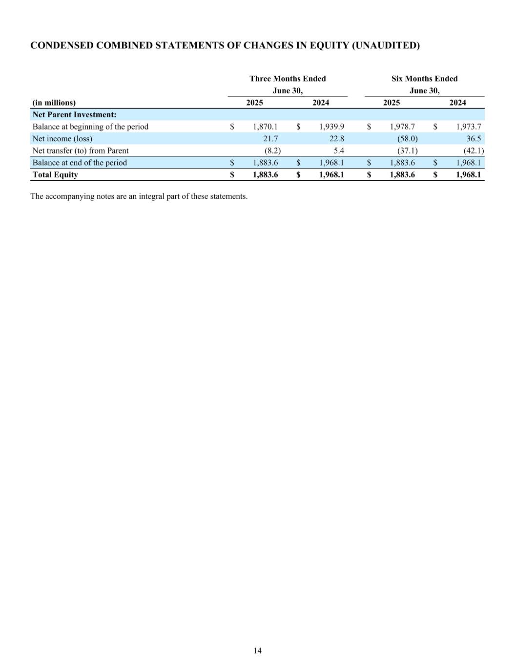 CONDENSED COMBINED STATEMENTS OF CHANGES IN EQUITY (UNAUDITED) Three Months Ended Six Months Ended June 30, June 30, (in millions) 2025 2024 2025 2024 Net Parent Investment: Balance at beginning of the period $ 1,870.1 $ 1,939.9 $ 1,978.7 $ 1,973.7 Net income (loss) 21.7 22.8 (58.0) 36.5 Net transfer (to) from Parent (8.2) 5.4 (37.1) (42.1) Balance at end of the period $ 1,883.6 $ 1,968.1 $ 1,883.6 $ 1,968.1 Total Equity $ 1,883.6 $ 1,968.1 $ 1,883.6 $ 1,968.1 The accompanying notes are an integral part of these statements. 14