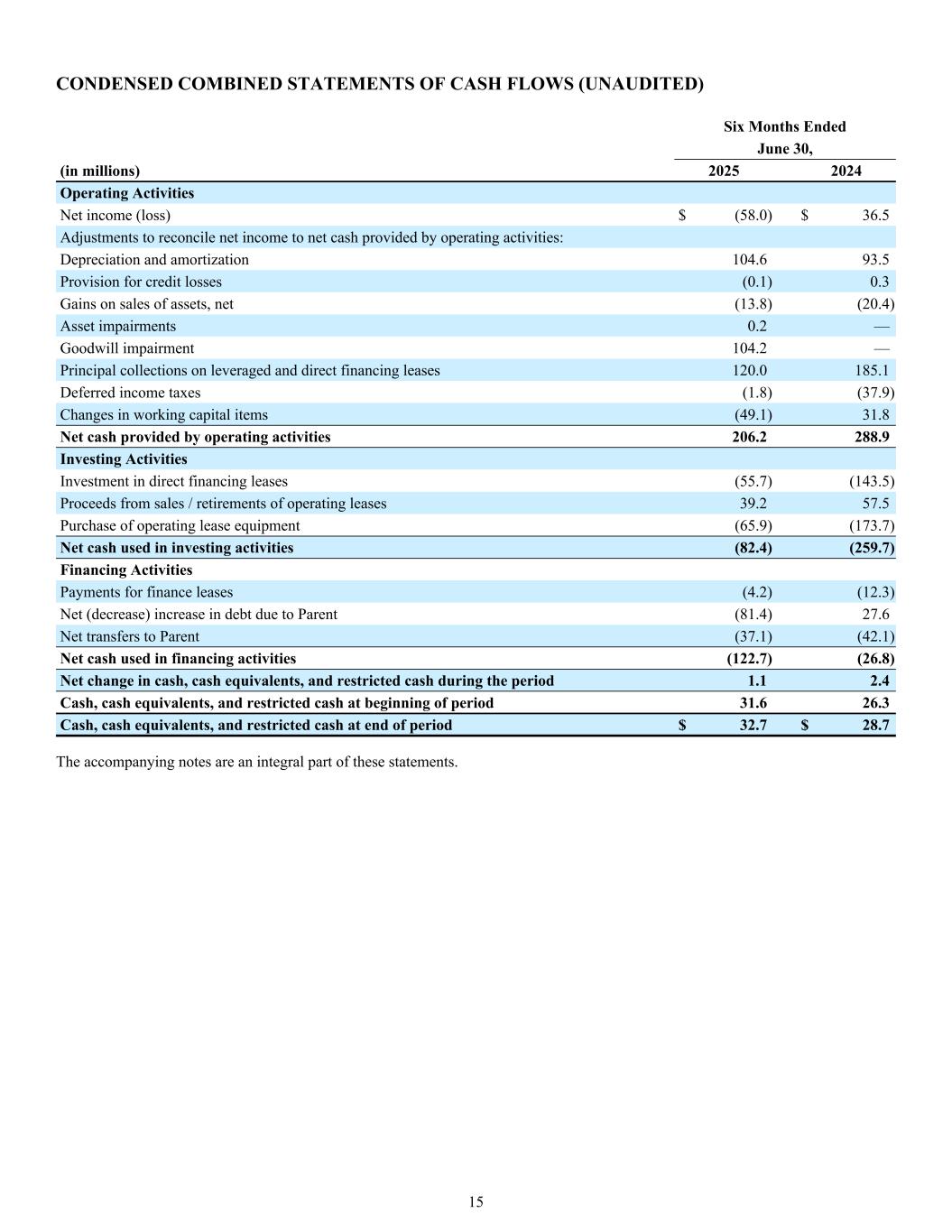 CONDENSED COMBINED STATEMENTS OF CASH FLOWS (UNAUDITED) Six Months Ended June 30, (in millions) 2025 2024 Operating Activities Net income (loss) $ (58.0) $ 36.5 Adjustments to reconcile net income to net cash provided by operating activities: Depreciation and amortization 104.6 93.5 Provision for credit losses (0.1) 0.3 Gains on sales of assets, net (13.8) (20.4) Asset impairments 0.2 — Goodwill impairment 104.2 — Principal collections on leveraged and direct financing leases 120.0 185.1 Deferred income taxes (1.8) (37.9) Changes in working capital items (49.1) 31.8 Net cash provided by operating activities 206.2 288.9 Investing Activities Investment in direct financing leases (55.7) (143.5) Proceeds from sales / retirements of operating leases 39.2 57.5 Purchase of operating lease equipment (65.9) (173.7) Net cash used in investing activities (82.4) (259.7) Financing Activities Payments for finance leases (4.2) (12.3) Net (decrease) increase in debt due to Parent (81.4) 27.6 Net transfers to Parent (37.1) (42.1) Net cash used in financing activities (122.7) (26.8) Net change in cash, cash equivalents, and restricted cash during the period 1.1 2.4 Cash, cash equivalents, and restricted cash at beginning of period 31.6 26.3 Cash, cash equivalents, and restricted cash at end of period $ 32.7 $ 28.7 The accompanying notes are an integral part of these statements. 15