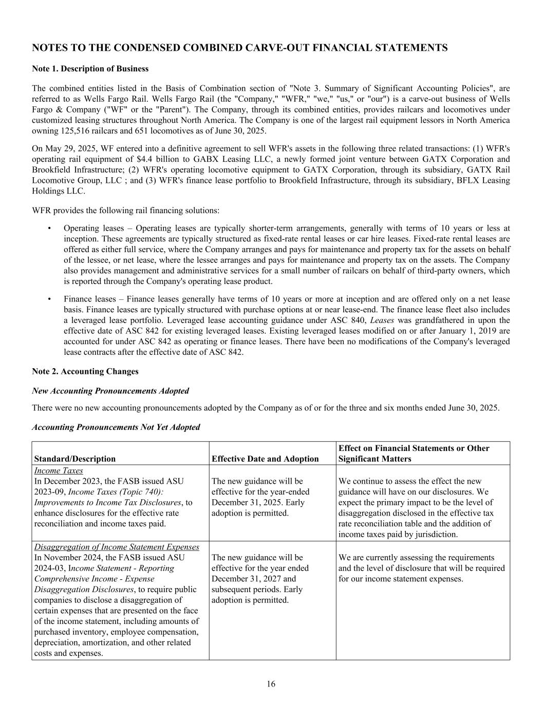 NOTES TO THE CONDENSED COMBINED CARVE-OUT FINANCIAL STATEMENTS Note 1. Description of Business The combined entities listed in the Basis of Combination section of "Note 3. Summary of Significant Accounting Policies", are referred to as Wells Fargo Rail. Wells Fargo Rail (the "Company," "WFR," "we," "us," or "our") is a carve-out business of Wells Fargo & Company ("WF" or the "Parent"). The Company, through its combined entities, provides railcars and locomotives under customized leasing structures throughout North America. The Company is one of the largest rail equipment lessors in North America owning 125,516 railcars and 651 locomotives as of June 30, 2025. On May 29, 2025, WF entered into a definitive agreement to sell WFR's assets in the following three related transactions: (1) WFR's operating rail equipment of $4.4 billion to GABX Leasing LLC, a newly formed joint venture between GATX Corporation and Brookfield Infrastructure; (2) WFR's operating locomotive equipment to GATX Corporation, through its subsidiary, GATX Rail Locomotive Group, LLC ; and (3) WFR's finance lease portfolio to Brookfield Infrastructure, through its subsidiary, BFLX Leasing Holdings LLC. WFR provides the following rail financing solutions: • Operating leases – Operating leases are typically shorter-term arrangements, generally with terms of 10 years or less at inception. These agreements are typically structured as fixed-rate rental leases or car hire leases. Fixed-rate rental leases are offered as either full service, where the Company arranges and pays for maintenance and property tax for the assets on behalf of the lessee, or net lease, where the lessee arranges and pays for maintenance and property tax on the assets. The Company also provides management and administrative services for a small number of railcars on behalf of third-party owners, which is reported through the Company's operating lease product. • Finance leases – Finance leases generally have terms of 10 years or more at inception and are offered only on a net lease basis. Finance leases are typically structured with purchase options at or near lease-end. The finance lease fleet also includes a leveraged lease portfolio. Leveraged lease accounting guidance under ASC 840, Leases was grandfathered in upon the effective date of ASC 842 for existing leveraged leases. Existing leveraged leases modified on or after January 1, 2019 are accounted for under ASC 842 as operating or finance leases. There have been no modifications of the Company's leveraged lease contracts after the effective date of ASC 842. Note 2. Accounting Changes New Accounting Pronouncements Adopted There were no new accounting pronouncements adopted by the Company as of or for the three and six months ended June 30, 2025. Accounting Pronouncements Not Yet Adopted Standard/Description Effective Date and Adoption Effect on Financial Statements or Other Significant Matters Income Taxes In December 2023, the FASB issued ASU 2023-09, Income Taxes (Topic 740): Improvements to Income Tax Disclosures, to enhance disclosures for the effective rate reconciliation and income taxes paid. The new guidance will be effective for the year-ended December 31, 2025. Early adoption is permitted. We continue to assess the effect the new guidance will have on our disclosures. We expect the primary impact to be the level of disaggregation disclosed in the effective tax rate reconciliation table and the addition of income taxes paid by jurisdiction. Disaggregation of Income Statement Expenses In November 2024, the FASB issued ASU 2024-03, Income Statement - Reporting Comprehensive Income - Expense Disaggregation Disclosures, to require public companies to disclose a disaggregation of certain expenses that are presented on the face of the income statement, including amounts of purchased inventory, employee compensation, depreciation, amortization, and other related costs and expenses. The new guidance will be effective for the year ended December 31, 2027 and subsequent periods. Early adoption is permitted. We are currently assessing the requirements and the level of disclosure that will be required for our income statement expenses. 16