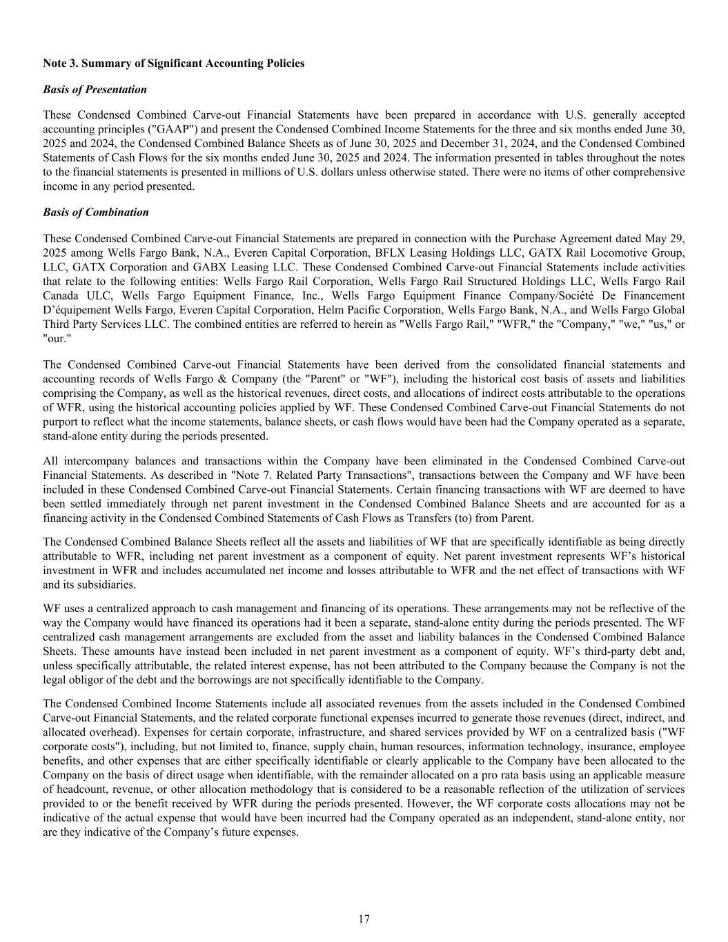 Note 3. Summary of Significant Accounting Policies Basis of Presentation These Condensed Combined Carve-out Financial Statements have been prepared in accordance with U.S. generally accepted accounting principles ("GAAP") and present the Condensed Combined Income Statements for the three and six months ended June 30, 2025 and 2024, the Condensed Combined Balance Sheets as of June 30, 2025 and December 31, 2024, and the Condensed Combined Statements of Cash Flows for the six months ended June 30, 2025 and 2024. The information presented in tables throughout the notes to the financial statements is presented in millions of U.S. dollars unless otherwise stated. There were no items of other comprehensive income in any period presented. Basis of Combination These Condensed Combined Carve-out Financial Statements are prepared in connection with the Purchase Agreement dated May 29, 2025 among Wells Fargo Bank, N.A., Everen Capital Corporation, BFLX Leasing Holdings LLC, GATX Rail Locomotive Group, LLC, GATX Corporation and GABX Leasing LLC. These Condensed Combined Carve-out Financial Statements include activities that relate to the following entities: Wells Fargo Rail Corporation, Wells Fargo Rail Structured Holdings LLC, Wells Fargo Rail Canada ULC, Wells Fargo Equipment Finance, Inc., Wells Fargo Equipment Finance Company/Société De Financement D’équipement Wells Fargo, Everen Capital Corporation, Helm Pacific Corporation, Wells Fargo Bank, N.A., and Wells Fargo Global Third Party Services LLC. The combined entities are referred to herein as "Wells Fargo Rail," "WFR," the "Company," "we," "us," or "our." The Condensed Combined Carve-out Financial Statements have been derived from the consolidated financial statements and accounting records of Wells Fargo & Company (the "Parent" or "WF"), including the historical cost basis of assets and liabilities comprising the Company, as well as the historical revenues, direct costs, and allocations of indirect costs attributable to the operations of WFR, using the historical accounting policies applied by WF. These Condensed Combined Carve-out Financial Statements do not purport to reflect what the income statements, balance sheets, or cash flows would have been had the Company operated as a separate, stand-alone entity during the periods presented. All intercompany balances and transactions within the Company have been eliminated in the Condensed Combined Carve-out Financial Statements. As described in "Note 7. Related Party Transactions", transactions between the Company and WF have been included in these Condensed Combined Carve-out Financial Statements. Certain financing transactions with WF are deemed to have been settled immediately through net parent investment in the Condensed Combined Balance Sheets and are accounted for as a financing activity in the Condensed Combined Statements of Cash Flows as Transfers (to) from Parent. The Condensed Combined Balance Sheets reflect all the assets and liabilities of WF that are specifically identifiable as being directly attributable to WFR, including net parent investment as a component of equity. Net parent investment represents WF’s historical investment in WFR and includes accumulated net income and losses attributable to WFR and the net effect of transactions with WF and its subsidiaries. WF uses a centralized approach to cash management and financing of its operations. These arrangements may not be reflective of the way the Company would have financed its operations had it been a separate, stand-alone entity during the periods presented. The WF centralized cash management arrangements are excluded from the asset and liability balances in the Condensed Combined Balance Sheets. These amounts have instead been included in net parent investment as a component of equity. WF’s third-party debt and, unless specifically attributable, the related interest expense, has not been attributed to the Company because the Company is not the legal obligor of the debt and the borrowings are not specifically identifiable to the Company. The Condensed Combined Income Statements include all associated revenues from the assets included in the Condensed Combined Carve-out Financial Statements, and the related corporate functional expenses incurred to generate those revenues (direct, indirect, and allocated overhead). Expenses for certain corporate, infrastructure, and shared services provided by WF on a centralized basis ("WF corporate costs"), including, but not limited to, finance, supply chain, human resources, information technology, insurance, employee benefits, and other expenses that are either specifically identifiable or clearly applicable to the Company have been allocated to the Company on the basis of direct usage when identifiable, with the remainder allocated on a pro rata basis using an applicable measure of headcount, revenue, or other allocation methodology that is considered to be a reasonable reflection of the utilization of services provided to or the benefit received by WFR during the periods presented. However, the WF corporate costs allocations may not be indicative of the actual expense that would have been incurred had the Company operated as an independent, stand-alone entity, nor are they indicative of the Company’s future expenses. 17