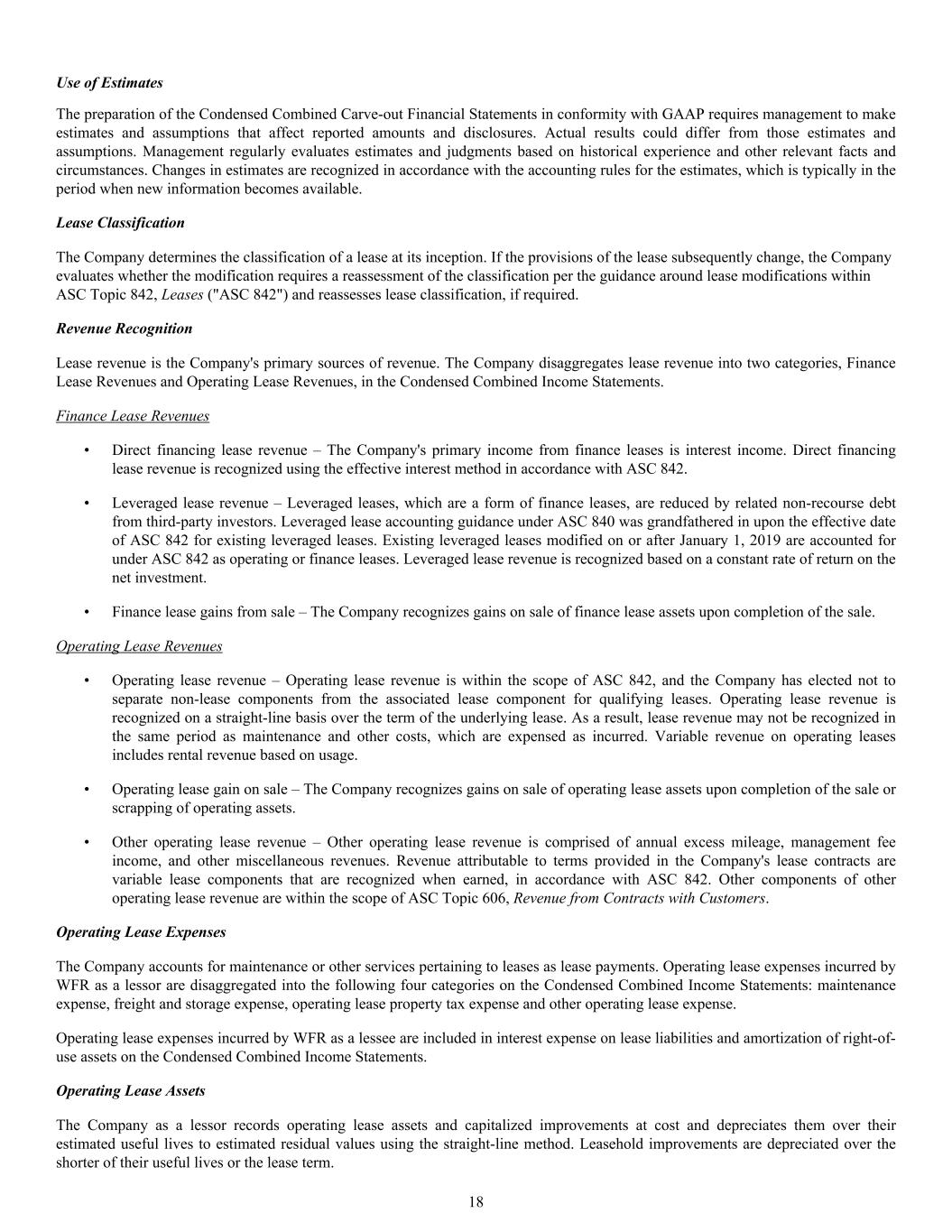Use of Estimates The preparation of the Condensed Combined Carve-out Financial Statements in conformity with GAAP requires management to make estimates and assumptions that affect reported amounts and disclosures. Actual results could differ from those estimates and assumptions. Management regularly evaluates estimates and judgments based on historical experience and other relevant facts and circumstances. Changes in estimates are recognized in accordance with the accounting rules for the estimates, which is typically in the period when new information becomes available. Lease Classification The Company determines the classification of a lease at its inception. If the provisions of the lease subsequently change, the Company evaluates whether the modification requires a reassessment of the classification per the guidance around lease modifications within ASC Topic 842, Leases ("ASC 842") and reassesses lease classification, if required. Revenue Recognition Lease revenue is the Company's primary sources of revenue. The Company disaggregates lease revenue into two categories, Finance Lease Revenues and Operating Lease Revenues, in the Condensed Combined Income Statements. Finance Lease Revenues • Direct financing lease revenue – The Company's primary income from finance leases is interest income. Direct financing lease revenue is recognized using the effective interest method in accordance with ASC 842. • Leveraged lease revenue – Leveraged leases, which are a form of finance leases, are reduced by related non-recourse debt from third-party investors. Leveraged lease accounting guidance under ASC 840 was grandfathered in upon the effective date of ASC 842 for existing leveraged leases. Existing leveraged leases modified on or after January 1, 2019 are accounted for under ASC 842 as operating or finance leases. Leveraged lease revenue is recognized based on a constant rate of return on the net investment. • Finance lease gains from sale – The Company recognizes gains on sale of finance lease assets upon completion of the sale. Operating Lease Revenues • Operating lease revenue – Operating lease revenue is within the scope of ASC 842, and the Company has elected not to separate non-lease components from the associated lease component for qualifying leases. Operating lease revenue is recognized on a straight-line basis over the term of the underlying lease. As a result, lease revenue may not be recognized in the same period as maintenance and other costs, which are expensed as incurred. Variable revenue on operating leases includes rental revenue based on usage. • Operating lease gain on sale – The Company recognizes gains on sale of operating lease assets upon completion of the sale or scrapping of operating assets. • Other operating lease revenue – Other operating lease revenue is comprised of annual excess mileage, management fee income, and other miscellaneous revenues. Revenue attributable to terms provided in the Company's lease contracts are variable lease components that are recognized when earned, in accordance with ASC 842. Other components of other operating lease revenue are within the scope of ASC Topic 606, Revenue from Contracts with Customers. Operating Lease Expenses The Company accounts for maintenance or other services pertaining to leases as lease payments. Operating lease expenses incurred by WFR as a lessor are disaggregated into the following four categories on the Condensed Combined Income Statements: maintenance expense, freight and storage expense, operating lease property tax expense and other operating lease expense. Operating lease expenses incurred by WFR as a lessee are included in interest expense on lease liabilities and amortization of right-of- use assets on the Condensed Combined Income Statements. Operating Lease Assets The Company as a lessor records operating lease assets and capitalized improvements at cost and depreciates them over their estimated useful lives to estimated residual values using the straight-line method. Leasehold improvements are depreciated over the shorter of their useful lives or the lease term. 18