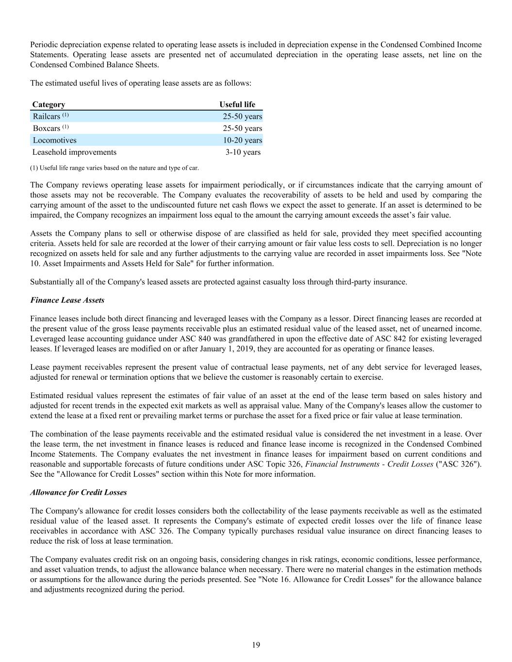 Periodic depreciation expense related to operating lease assets is included in depreciation expense in the Condensed Combined Income Statements. Operating lease assets are presented net of accumulated depreciation in the operating lease assets, net line on the Condensed Combined Balance Sheets. The estimated useful lives of operating lease assets are as follows: Railcars (1) 25-50 years Boxcars (1) 25-50 years Locomotives 10-20 years Leasehold improvements 3-10 years Category Useful life (1) Useful life range varies based on the nature and type of car. The Company reviews operating lease assets for impairment periodically, or if circumstances indicate that the carrying amount of those assets may not be recoverable. The Company evaluates the recoverability of assets to be held and used by comparing the carrying amount of the asset to the undiscounted future net cash flows we expect the asset to generate. If an asset is determined to be impaired, the Company recognizes an impairment loss equal to the amount the carrying amount exceeds the asset’s fair value. Assets the Company plans to sell or otherwise dispose of are classified as held for sale, provided they meet specified accounting criteria. Assets held for sale are recorded at the lower of their carrying amount or fair value less costs to sell. Depreciation is no longer recognized on assets held for sale and any further adjustments to the carrying value are recorded in asset impairments loss. See "Note 10. Asset Impairments and Assets Held for Sale" for further information. Substantially all of the Company's leased assets are protected against casualty loss through third-party insurance. Finance Lease Assets Finance leases include both direct financing and leveraged leases with the Company as a lessor. Direct financing leases are recorded at the present value of the gross lease payments receivable plus an estimated residual value of the leased asset, net of unearned income. Leveraged lease accounting guidance under ASC 840 was grandfathered in upon the effective date of ASC 842 for existing leveraged leases. If leveraged leases are modified on or after January 1, 2019, they are accounted for as operating or finance leases. Lease payment receivables represent the present value of contractual lease payments, net of any debt service for leveraged leases, adjusted for renewal or termination options that we believe the customer is reasonably certain to exercise. Estimated residual values represent the estimates of fair value of an asset at the end of the lease term based on sales history and adjusted for recent trends in the expected exit markets as well as appraisal value. Many of the Company's leases allow the customer to extend the lease at a fixed rent or prevailing market terms or purchase the asset for a fixed price or fair value at lease termination. The combination of the lease payments receivable and the estimated residual value is considered the net investment in a lease. Over the lease term, the net investment in finance leases is reduced and finance lease income is recognized in the Condensed Combined Income Statements. The Company evaluates the net investment in finance leases for impairment based on current conditions and reasonable and supportable forecasts of future conditions under ASC Topic 326, Financial Instruments - Credit Losses ("ASC 326"). See the "Allowance for Credit Losses" section within this Note for more information. Allowance for Credit Losses The Company's allowance for credit losses considers both the collectability of the lease payments receivable as well as the estimated residual value of the leased asset. It represents the Company's estimate of expected credit losses over the life of finance lease receivables in accordance with ASC 326. The Company typically purchases residual value insurance on direct financing leases to reduce the risk of loss at lease termination. The Company evaluates credit risk on an ongoing basis, considering changes in risk ratings, economic conditions, lessee performance, and asset valuation trends, to adjust the allowance balance when necessary. There were no material changes in the estimation methods or assumptions for the allowance during the periods presented. See "Note 16. Allowance for Credit Losses" for the allowance balance and adjustments recognized during the period. 19