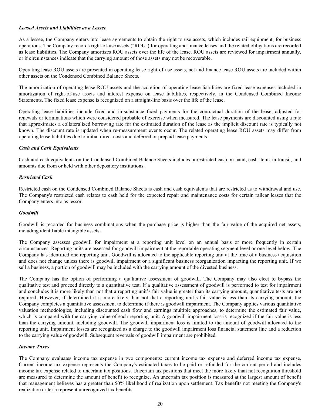 Leased Assets and Liabilities as a Lessee As a lessee, the Company enters into lease agreements to obtain the right to use assets, which includes rail equipment, for business operations. The Company records right-of-use assets ("ROU") for operating and finance leases and the related obligations are recorded as lease liabilities. The Company amortizes ROU assets over the life of the lease. ROU assets are reviewed for impairment annually, or if circumstances indicate that the carrying amount of those assets may not be recoverable. Operating lease ROU assets are presented in operating lease right-of-use assets, net and finance lease ROU assets are included within other assets on the Condensed Combined Balance Sheets. The amortization of operating lease ROU assets and the accretion of operating lease liabilities are fixed lease expenses included in amortization of right-of-use assets and interest expense on lease liabilities, respectively, in the Condensed Combined Income Statements. The fixed lease expense is recognized on a straight-line basis over the life of the lease. Operating lease liabilities include fixed and in-substance fixed payments for the contractual duration of the lease, adjusted for renewals or terminations which were considered probable of exercise when measured. The lease payments are discounted using a rate that approximates a collateralized borrowing rate for the estimated duration of the lease as the implicit discount rate is typically not known. The discount rate is updated when re-measurement events occur. The related operating lease ROU assets may differ from operating lease liabilities due to initial direct costs and deferred or prepaid lease payments. Cash and Cash Equivalents Cash and cash equivalents on the Condensed Combined Balance Sheets includes unrestricted cash on hand, cash items in transit, and amounts due from or held with other depository institutions. Restricted Cash Restricted cash on the Condensed Combined Balance Sheets is cash and cash equivalents that are restricted as to withdrawal and use. The Company's restricted cash relates to cash held for the expected repair and maintenance costs for certain railcar leases that the Company enters into as lessor. Goodwill Goodwill is recorded for business combinations when the purchase price is higher than the fair value of the acquired net assets, including identifiable intangible assets. The Company assesses goodwill for impairment at a reporting unit level on an annual basis or more frequently in certain circumstances. Reporting units are assessed for goodwill impairment at the reportable operating segment level or one level below. The Company has identified one reporting unit. Goodwill is allocated to the applicable reporting unit at the time of a business acquisition and does not change unless there is goodwill impairment or a significant business reorganization impacting the reporting unit. If we sell a business, a portion of goodwill may be included with the carrying amount of the divested business. The Company has the option of performing a qualitative assessment of goodwill. The Company may also elect to bypass the qualitative test and proceed directly to a quantitative test. If a qualitative assessment of goodwill is performed to test for impairment and concludes it is more likely than not that a reporting unit’s fair value is greater than its carrying amount, quantitative tests are not required. However, if determined it is more likely than not that a reporting unit’s fair value is less than its carrying amount, the Company completes a quantitative assessment to determine if there is goodwill impairment. The Company applies various quantitative valuation methodologies, including discounted cash flow and earnings multiple approaches, to determine the estimated fair value, which is compared with the carrying value of each reporting unit. A goodwill impairment loss is recognized if the fair value is less than the carrying amount, including goodwill. The goodwill impairment loss is limited to the amount of goodwill allocated to the reporting unit. Impairment losses are recognized as a charge to the goodwill impairment loss financial statement line and a reduction to the carrying value of goodwill. Subsequent reversals of goodwill impairment are prohibited. Income Taxes The Company evaluates income tax expense in two components: current income tax expense and deferred income tax expense. Current income tax expense represents the Company's estimated taxes to be paid or refunded for the current period and includes income tax expense related to uncertain tax positions. Uncertain tax positions that meet the more likely than not recognition threshold are measured to determine the amount of benefit to recognize. An uncertain tax position is measured at the largest amount of benefit that management believes has a greater than 50% likelihood of realization upon settlement. Tax benefits not meeting the Company's realization criteria represent unrecognized tax benefits. 20
