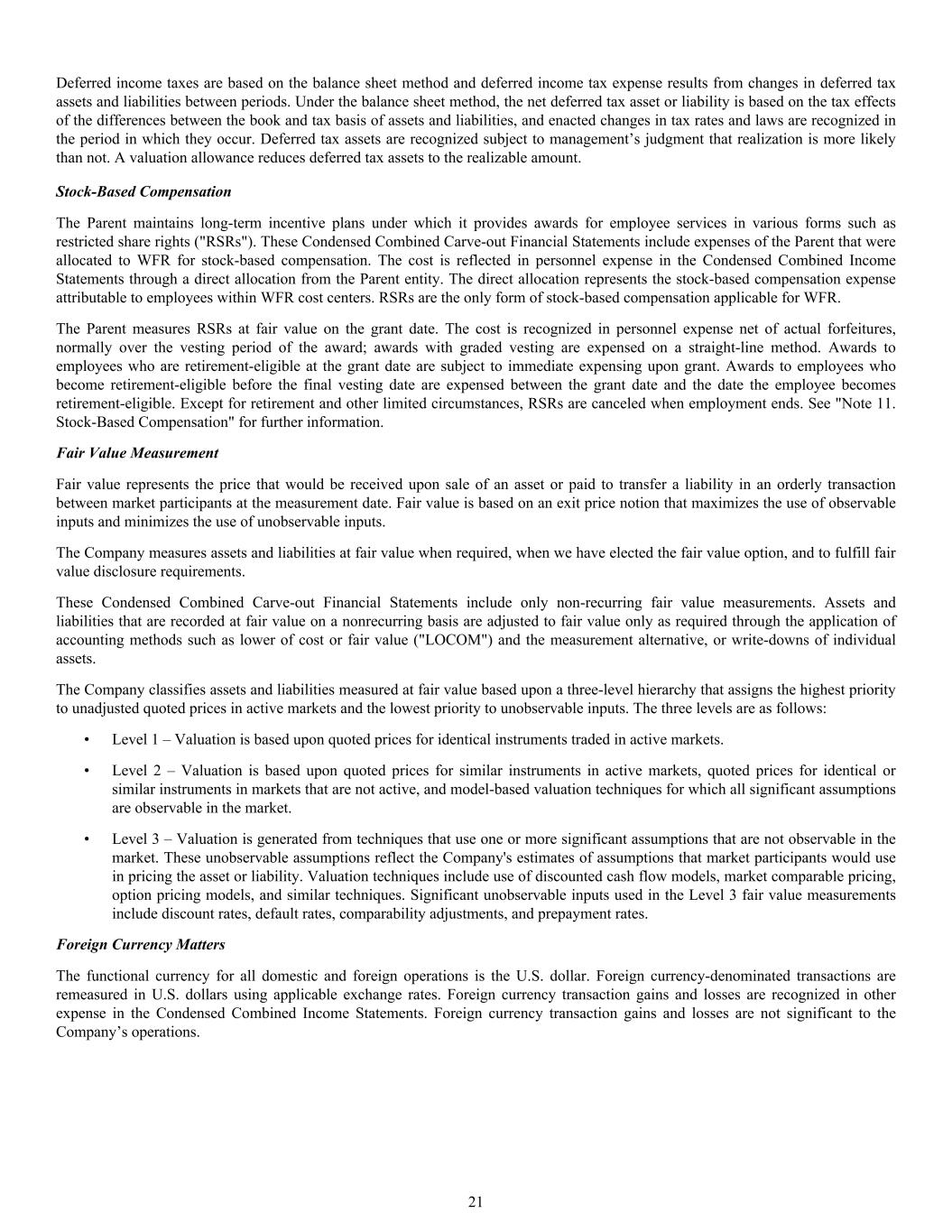 Deferred income taxes are based on the balance sheet method and deferred income tax expense results from changes in deferred tax assets and liabilities between periods. Under the balance sheet method, the net deferred tax asset or liability is based on the tax effects of the differences between the book and tax basis of assets and liabilities, and enacted changes in tax rates and laws are recognized in the period in which they occur. Deferred tax assets are recognized subject to management’s judgment that realization is more likely than not. A valuation allowance reduces deferred tax assets to the realizable amount. Stock-Based Compensation The Parent maintains long-term incentive plans under which it provides awards for employee services in various forms such as restricted share rights ("RSRs"). These Condensed Combined Carve-out Financial Statements include expenses of the Parent that were allocated to WFR for stock-based compensation. The cost is reflected in personnel expense in the Condensed Combined Income Statements through a direct allocation from the Parent entity. The direct allocation represents the stock-based compensation expense attributable to employees within WFR cost centers. RSRs are the only form of stock-based compensation applicable for WFR. The Parent measures RSRs at fair value on the grant date. The cost is recognized in personnel expense net of actual forfeitures, normally over the vesting period of the award; awards with graded vesting are expensed on a straight-line method. Awards to employees who are retirement-eligible at the grant date are subject to immediate expensing upon grant. Awards to employees who become retirement-eligible before the final vesting date are expensed between the grant date and the date the employee becomes retirement-eligible. Except for retirement and other limited circumstances, RSRs are canceled when employment ends. See "Note 11. Stock-Based Compensation" for further information. Fair Value Measurement Fair value represents the price that would be received upon sale of an asset or paid to transfer a liability in an orderly transaction between market participants at the measurement date. Fair value is based on an exit price notion that maximizes the use of observable inputs and minimizes the use of unobservable inputs. The Company measures assets and liabilities at fair value when required, when we have elected the fair value option, and to fulfill fair value disclosure requirements. These Condensed Combined Carve-out Financial Statements include only non-recurring fair value measurements. Assets and liabilities that are recorded at fair value on a nonrecurring basis are adjusted to fair value only as required through the application of accounting methods such as lower of cost or fair value ("LOCOM") and the measurement alternative, or write-downs of individual assets. The Company classifies assets and liabilities measured at fair value based upon a three-level hierarchy that assigns the highest priority to unadjusted quoted prices in active markets and the lowest priority to unobservable inputs. The three levels are as follows: • Level 1 – Valuation is based upon quoted prices for identical instruments traded in active markets. • Level 2 – Valuation is based upon quoted prices for similar instruments in active markets, quoted prices for identical or similar instruments in markets that are not active, and model-based valuation techniques for which all significant assumptions are observable in the market. • Level 3 – Valuation is generated from techniques that use one or more significant assumptions that are not observable in the market. These unobservable assumptions reflect the Company's estimates of assumptions that market participants would use in pricing the asset or liability. Valuation techniques include use of discounted cash flow models, market comparable pricing, option pricing models, and similar techniques. Significant unobservable inputs used in the Level 3 fair value measurements include discount rates, default rates, comparability adjustments, and prepayment rates. Foreign Currency Matters The functional currency for all domestic and foreign operations is the U.S. dollar. Foreign currency-denominated transactions are remeasured in U.S. dollars using applicable exchange rates. Foreign currency transaction gains and losses are recognized in other expense in the Condensed Combined Income Statements. Foreign currency transaction gains and losses are not significant to the Company’s operations. 21