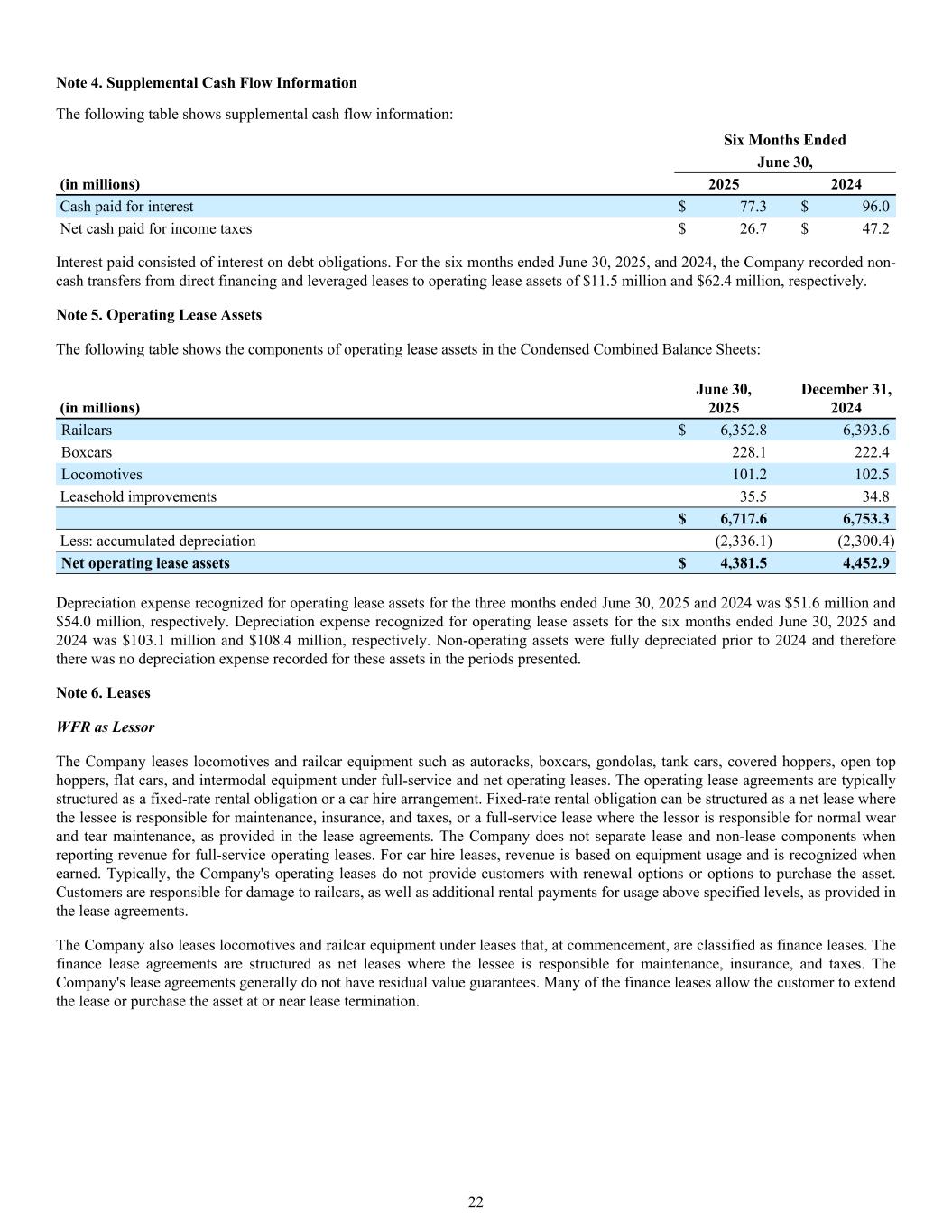 Note 4. Supplemental Cash Flow Information The following table shows supplemental cash flow information: Six Months Ended June 30, (in millions) 2025 2024 Cash paid for interest $ 77.3 $ 96.0 Net cash paid for income taxes $ 26.7 $ 47.2 Interest paid consisted of interest on debt obligations. For the six months ended June 30, 2025, and 2024, the Company recorded non- cash transfers from direct financing and leveraged leases to operating lease assets of $11.5 million and $62.4 million, respectively. Note 5. Operating Lease Assets The following table shows the components of operating lease assets in the Condensed Combined Balance Sheets: (in millions) June 30, 2025 December 31, 2024 Railcars $ 6,352.8 6,393.6 Boxcars 228.1 222.4 Locomotives 101.2 102.5 Leasehold improvements 35.5 34.8 $ 6,717.6 6,753.3 Less: accumulated depreciation (2,336.1) (2,300.4) Net operating lease assets $ 4,381.5 4,452.9 Depreciation expense recognized for operating lease assets for the three months ended June 30, 2025 and 2024 was $51.6 million and $54.0 million, respectively. Depreciation expense recognized for operating lease assets for the six months ended June 30, 2025 and 2024 was $103.1 million and $108.4 million, respectively. Non-operating assets were fully depreciated prior to 2024 and therefore there was no depreciation expense recorded for these assets in the periods presented. Note 6. Leases WFR as Lessor The Company leases locomotives and railcar equipment such as autoracks, boxcars, gondolas, tank cars, covered hoppers, open top hoppers, flat cars, and intermodal equipment under full-service and net operating leases. The operating lease agreements are typically structured as a fixed-rate rental obligation or a car hire arrangement. Fixed-rate rental obligation can be structured as a net lease where the lessee is responsible for maintenance, insurance, and taxes, or a full-service lease where the lessor is responsible for normal wear and tear maintenance, as provided in the lease agreements. The Company does not separate lease and non-lease components when reporting revenue for full-service operating leases. For car hire leases, revenue is based on equipment usage and is recognized when earned. Typically, the Company's operating leases do not provide customers with renewal options or options to purchase the asset. Customers are responsible for damage to railcars, as well as additional rental payments for usage above specified levels, as provided in the lease agreements. The Company also leases locomotives and railcar equipment under leases that, at commencement, are classified as finance leases. The finance lease agreements are structured as net leases where the lessee is responsible for maintenance, insurance, and taxes. The Company's lease agreements generally do not have residual value guarantees. Many of the finance leases allow the customer to extend the lease or purchase the asset at or near lease termination. 22